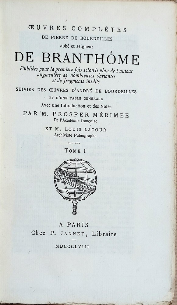 OEUVRES COMPLETES de PIERRE DE BOURDEILLES Abbé et Seigneur de BRANTHÔME Publiées pour la première fois selon le plan de l'Auteur, augmentées de nombreuses variantes et de fragments inédits Suivies des Oeuvres d'André de BOURDEILLES et d'une table générale avec une introduction et des notes par Mm. Prosper MERIMEE & Louis LACOUR ________________ Paris, P. Jannet, 1858, puis Paul Daffis et Plon, jusqu'en 1895 Bibliothèque Elzevirienne Treize volumes in 12°, percaline de l'éditeur toile rouge. Tirage sur beau vergé. Exemplaire non rogné. BIBLIOTHEQUE ELZEVIRIENNE : Cette collection est un véritable monument de l'histoire de la librairie française. La collection complète (173 volumes) est extrêmement difficile à constituer. Les textes qui la composent sont des ouvrages ou des manuscrits inédits ou très rares des XVe et XVIe siècles et par exception de quelques autres postérieurs au XVIIIe. Ces ouvrages contiennent les commentaires des plus grands érudits de l'époque. L'éditeur Pierre JANNET n'a reculé devant aucun sacrifice pour lancer sa collection. Ces jolies reliures en toile rouge à la manière anglaise ornées d'un globe doré feront le reste pour assurer la renommée de la Bibliothèque Elzévirienne. B on exemplaire, rare ensemble complet en treize volumes et dont l'édition s'est étalé sur trente sept années. St.Bib4 Listing and template services provided by inkFrog