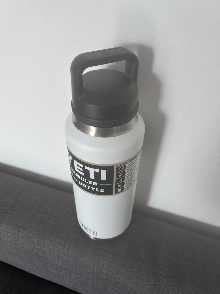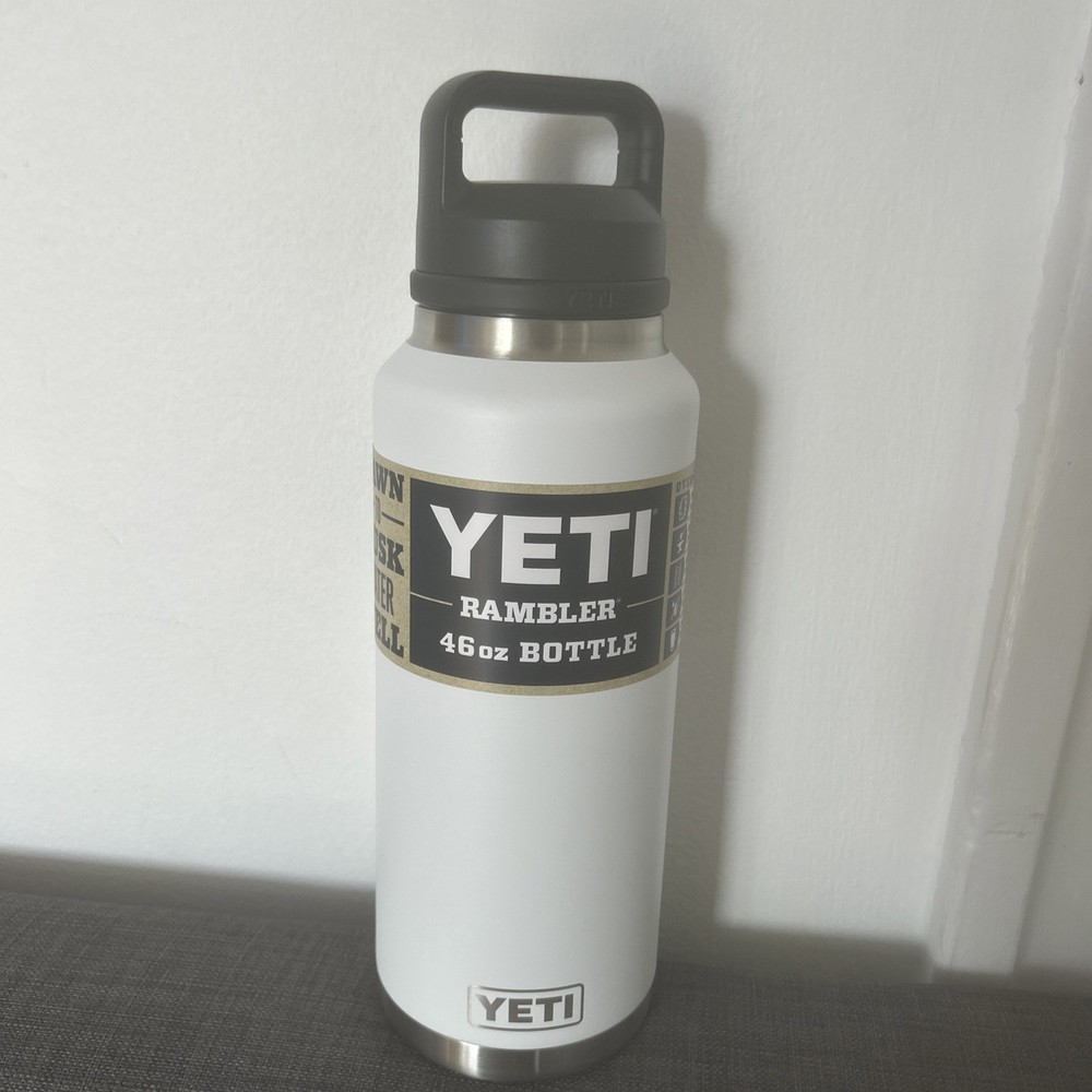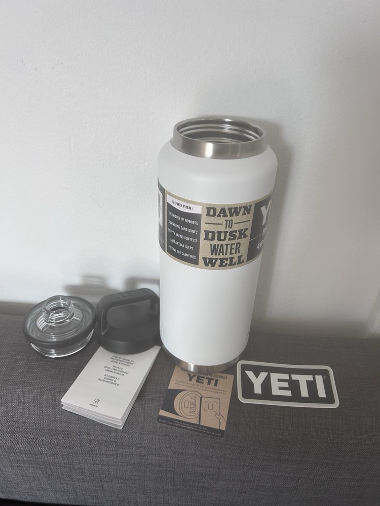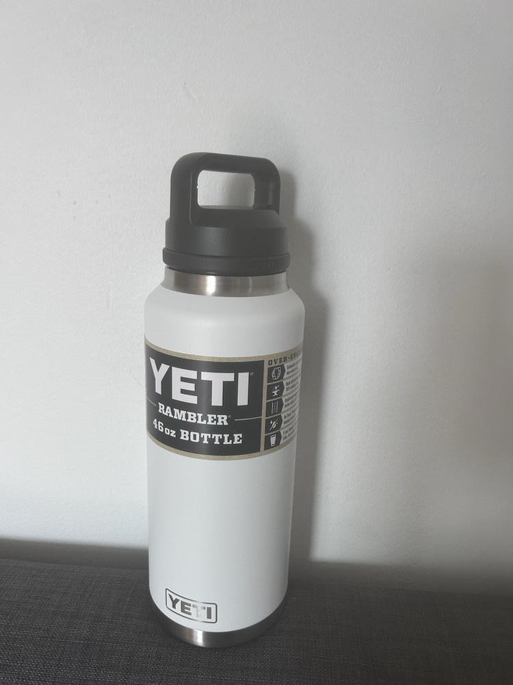 Brand new 46oz YETI Rambler water bottle with a screw-on lid and chug cap in white. Made of stainless steel, this reusable and refillable bottle is perfect for outdoor activities like sports, adventure, camping, and hiking. With features like leakproof design, double insulation, and dishwasher safety, this YETI Rambler is a practical and durable choice for staying hydrated on the go.