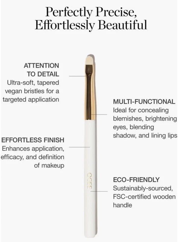 Premium OGEE Precision Brush — designed for flawless detail work and smooth, natural application. This multi-purpose brush features a precision tip ideal for brightening under-eyes, covering blemishes, evening skin tone, shaping contour, and blending concealer seamlessly. Crafted with cruelty-free vegan fibers and a sustainably sourced wooden handle, it enhances performance when used with OGEE Sculpted Complexion Sticks & Face Sticks, or any cream-based makeup. Perfect for clean beauty lovers looking for control, smooth blending, and professional-level results. Great for travel, everyday use, or detail artistry. Condition: New in box Brand: OGEE Type: Precision Brush Material: Vegan fibers + wooden handle Use For: Concealer, detail blending, complexion sticks, contour edge definition Cruelty-Free | Clean Beauty | High-Performance Tool Returns only accepted if unopened, unused, and undamaged.