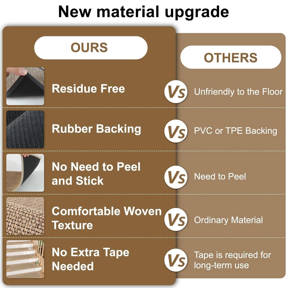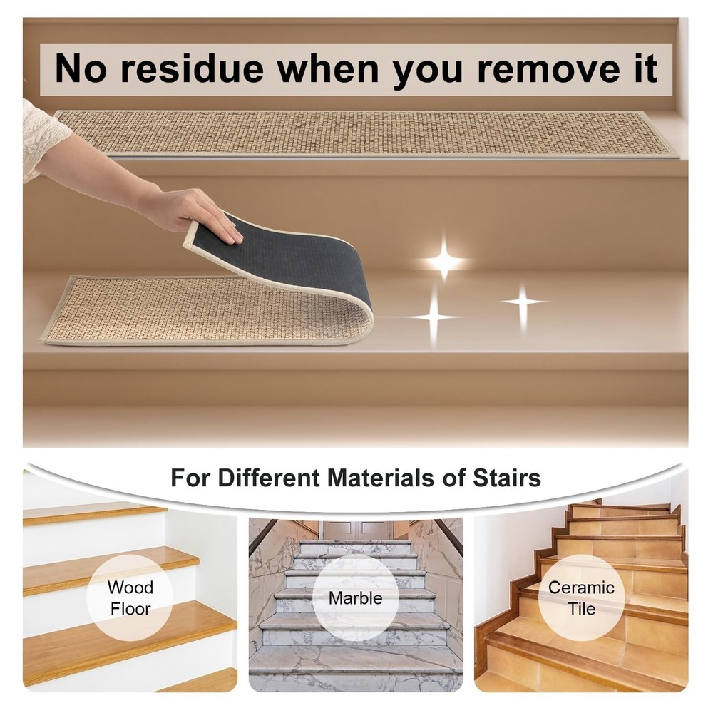 OJIA Stair Treads for Wooden Steps Indoor Washable Stair Carpet Non-Slip 15PCS 30"x8" Rubber Backing Stair Mats Stair Runners for Kids, Elders and Dogs, Staircase Step Treads Stair Covers Product Details Size: 15PCS Color: Natural Number of Items: 15 Brand: OJIA MPN: ST-XNE-BZXNETHXJKS-15PCS UPC: Does not apply EAN: Does not apply Material: Chenille Brand: OJIA Color: Natural Shape: Rectangular Item Form: Sheet Item Weight: 9.8 Pounds Grade Rating: Residential Number of Items: 15 Item Weight: 9.8 pounds Package Dimensions: 17.6 x 11.14 x 5 inches Country of Origin: China Date First Available: August 12, 2024 Non-Slip Stair Treads: Because of its sturdy anti-slip rubber backing, you don't need to purchase another tape or adhesive. Our stair treads can stick to wooden, tile, and marble surfaces tightly, stay put, and stay in place. No Installation, No Residue: No need for adhesive tapes or permanent glue, the rubber backing stair treads carpet won't cause damage to the surface when you try to remove them. No extra steps needed, just clean the stairs and put it on. Safer and Quiter: Makes going up and down the stairs easier and safer for both the dogs and the cat; helps soften the sounds of both people and animals going up and down the creaky wooden stairs. Perfect for all clean smooth flat stairs, including marble, hardwood, or other hard smooth surfaces. Great Protection: The carpet stair treads for wooden steps has a strong protective effect, which can protect the paint of the wooden pedal and prolong the service life of the stairs even protecting your family from slipping accidents. Easy to Clean: Our indoor stair runners are easy to clean and can be cleaned by vacuuming or machine washing, so don't worry about cleaning the hair and dust on the stair treads.
