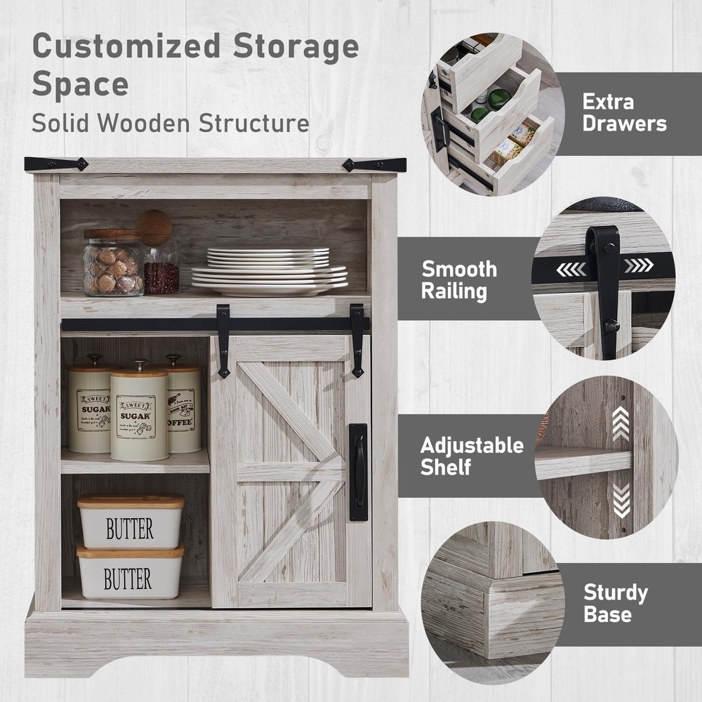 [CUSTOMIZED STORAGE SPACE] 23.5"L × 12"W × 32"H, Utilize the tabletop to store cleaning supplies of any height, open shelf and three storage drawers for small items. Also sliding barn door and adjustable shelf to suit your storage needs, creating an orderly life space without mess not only in bathroom [FARMHOUSE RUSTIC STYLE] Crafted from high-quality engineered wood, our storage cabinet is designed with classic barn door, double cross pattern and weathered finish that gives a charming rustic feel. Redecorate the whole space with elegant metal decorations to add more deeper farmhouse touch for it [STURDY SUPPORT] Comes with one sturdy support base and tipping restraint hardware, so you could fix this small cabinet to the wall and prevent it from wobbling or tipping over. Also, please make sure hardware is suitable for your walls before installing, as different wall materials may require different types of anchors [WATERPROOF MATERIAL] Waterproof surface and anti-rust coated metal accent hinges are ready to be used in moisture environments and easy to clean dust off, which makes it really suitable for using in bathroom and guarantees a long-term use even around some humidity [EASY ASSEMBLY] Step-by-step instruction and hardware pack are in one package with the item, every part has an own label for easy assembly and there is no need of any power tools. We are always ready at your service if you have any issues with our product before or after your purchase
