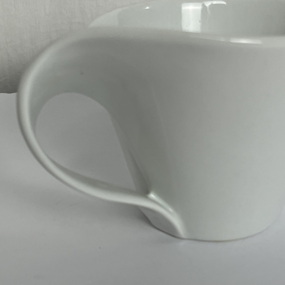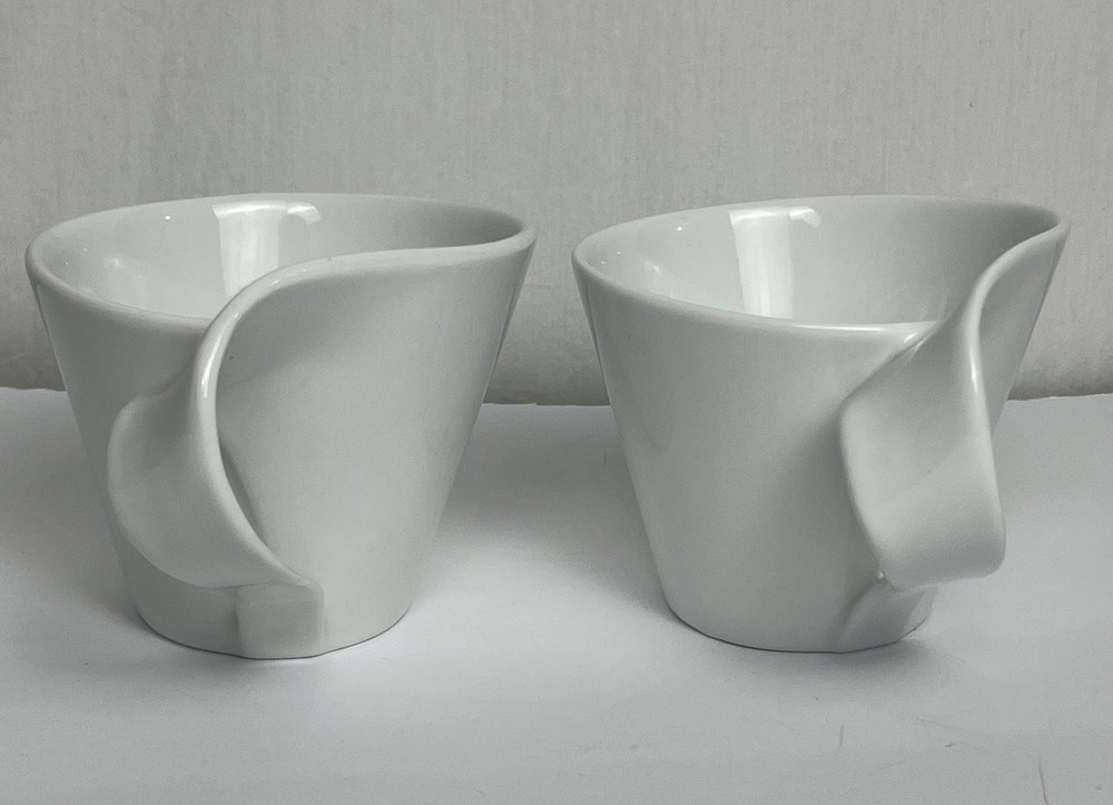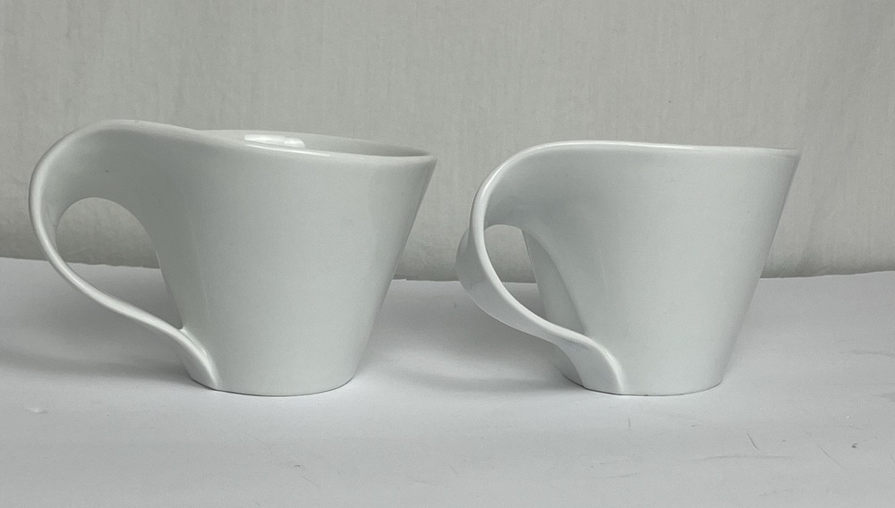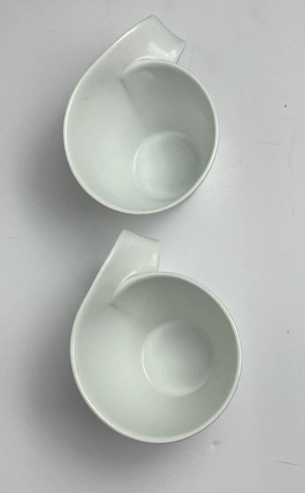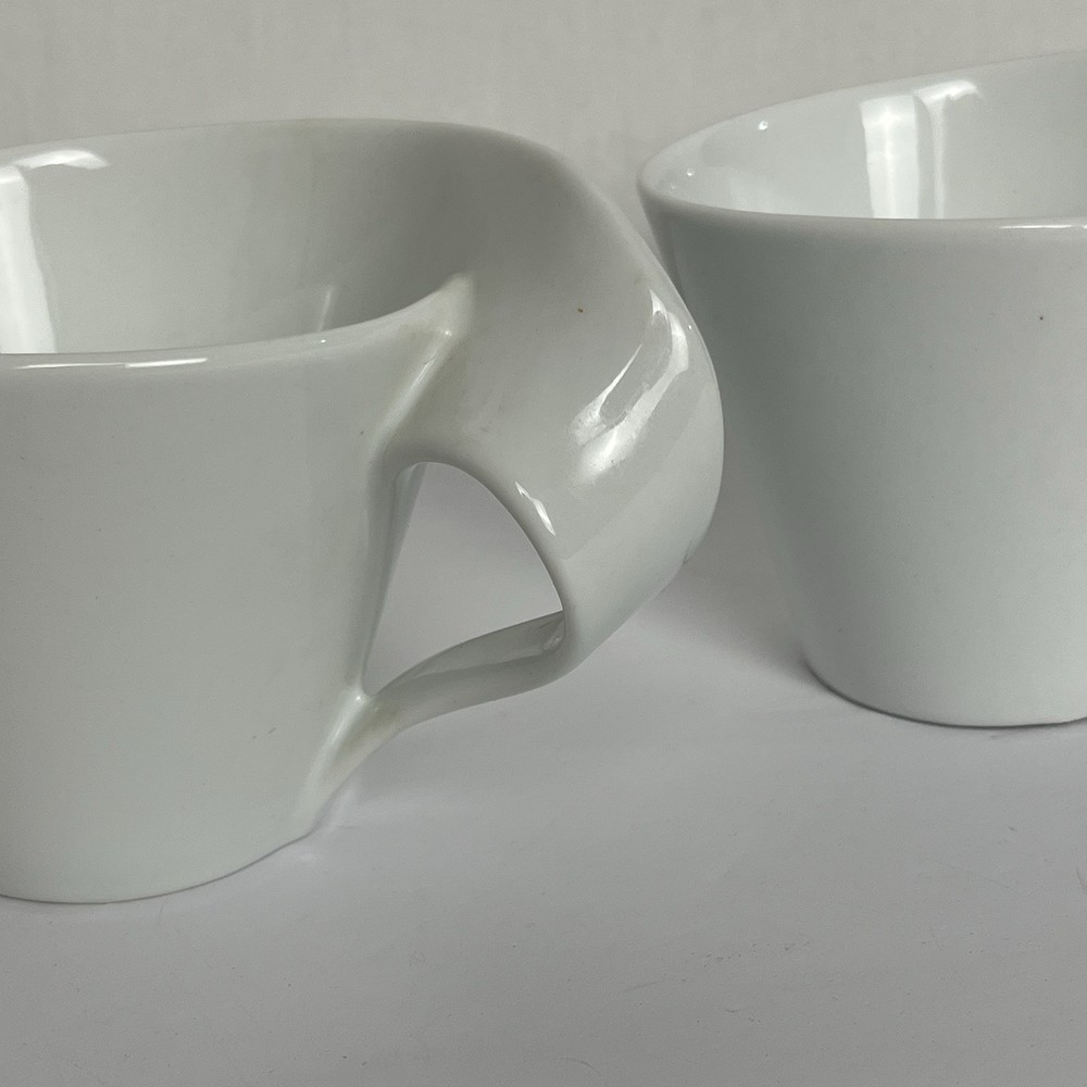 Vintage Y2K coffee cups from the Museo Moderno Buenos Aries in Argentina. Set of two matching Museum of Modern Art cups made by OKKO - the manufacturers of premium Turkish coffee machines. Modern lively wave design in a minimalist solid white ceramic porcelain enhances the invigorating effect if smooth mocha lattes and strong espresso. Enhance your coffee set with a statement mod design perfect for collectors or for a self-care latte, coffee, or tea. Purchased in 2004 at the MOMA Buenos Aires gift shop and only displayed with no chips, cracks, or stains - minor base wear with original price tag.Max height 4" x 4.5"d. Lot contains a single two piece set of coffee cups.