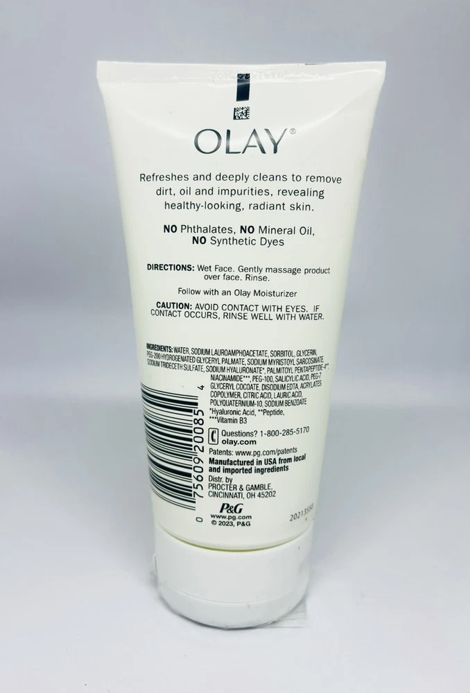 OLAY Refreshing Gel Cleanser & Hyaluronic Fragrance Free New Packing 5oz 150mL。 Refreshes and deeply cleans to remove dirt, oil and impurities, revealing healthy-looking, radiant skin. NO Phthalates, NO Mineral Oil, NO Synthetic Dyes DIRECTIONS: Wet Face. Gently massage product over face. Rinse. Follow with an Olay Moisturizer CAUTION: AVOID CONTACT WITH EYES. IF CONTACT OCCURS, RINSE WELL WITH WATER. INGREDIENTS: WATER, SODIUM LAUROAMPHOACETATE, SORBITOL, GLYCERIN