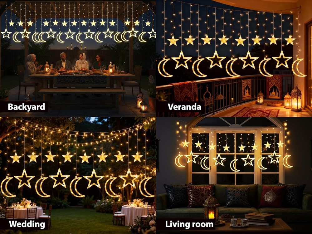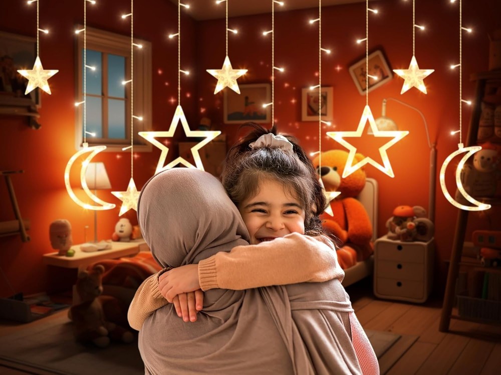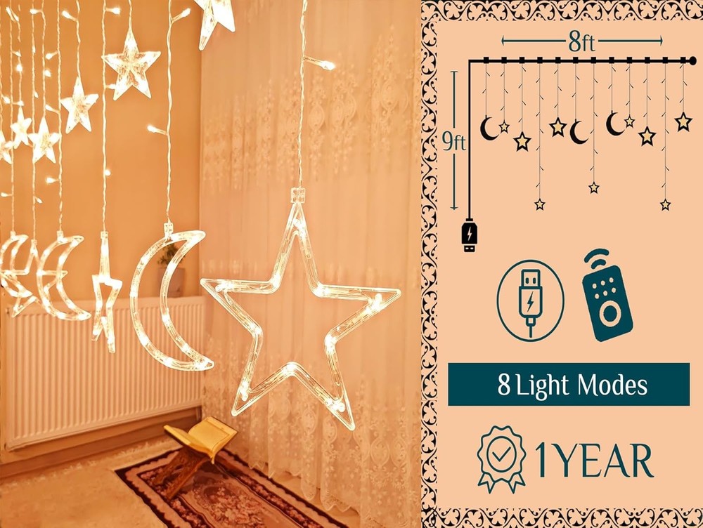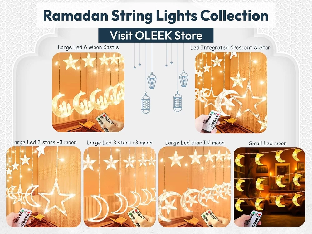 OLEEK Ramadan String Lights | LED Ramadan Home Decorations 2026 | Eid Decor Gift Brand OLEEK Color Warm White Indoor/Outdoor Usage Indoor Special Feature 8 Modes, Ramadan Decorations, Ramadan Decorations for Home, Ramadan Lights, Remote Controlled Light Source Type LED Power Source USB Plug-in Light Color Warm White Theme Ramadan lights decorations led Occasion Decorations Style Crescent & Star Features JUST THE RIGHT SIZE: Star and moon ramadan lights for Ramadan decorations is 17ft long.9ft of moon&star ramadan string lights ,the leading wire is 8ft for convenient setup. Our Ramadan led lights is powered by 5V USB plug REMOTE CONTROLLED WITH LIGHTING 8 MODES: For a warm Ramadan decorations for home 2026 ,This ramadan lights decorations string lights blends seamlessly, adding a stylish twist to your Ramadan string lights decoration TRANSFORM YOUR RAMADAN DECOR : with these hanging star and moon ramadan led lights! Ideal for ramadan gifts for kids, they create a cozy Ramadan lights decorations led . ramadan mubarak decorations led adds a charming touch to any gathering OUR RAMADAN COLLECTION: star and moon ramadan lights for ramadan decor , ramadan gifts, , ramadan banner , ramadan calendar , ramadan lantern , ramadan pillow covers , ramadan table runner , ramadan balloons , ramadan table cloth RAMADAN DECORATIONS COLLECTION : مجموعة زينة رمضان نبيع منها ايضا فانوس رمضان ومفرش و إكليل باب جديد .رمضان كريم ديكور Our Business 100% Customer Satisfaction We go above and beyond to ensure you receive the best level of service. Returns We want you to be happy with your purchase, however in the rare occasion that you are not, please let us know and we will contact you to arrange either a collection or a refund. Please CONTACT US before leaving any negative feedback and we will promptly sort out any issue with your order. 8322366