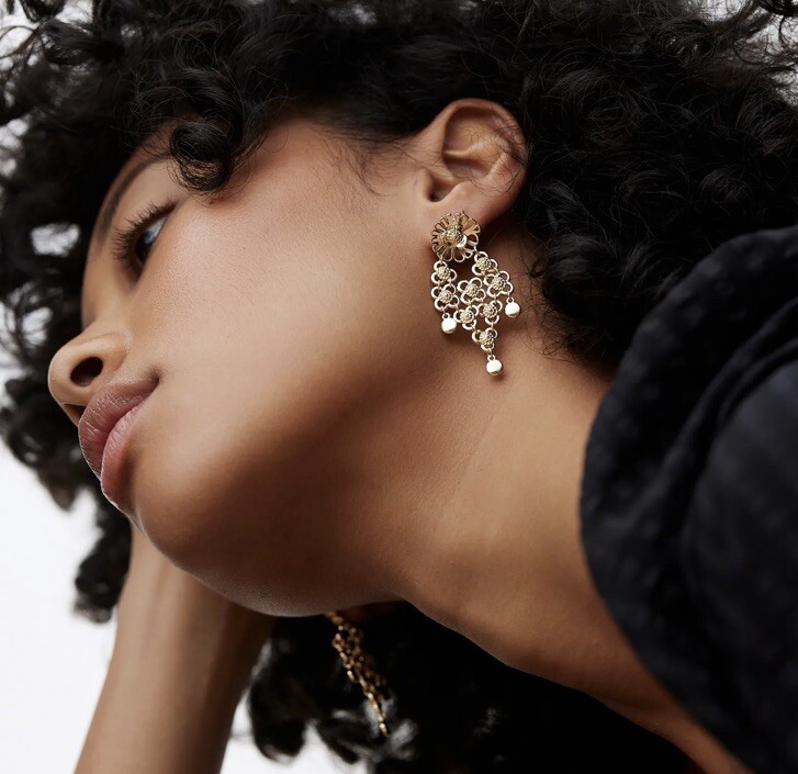 Description Statement drop earrings with a floral design made from slim links and engraved charms. Features: Style: Drop earrings Earring backs: Stud Detail: Embellished Finish: Shiny Dimensions: Length: 5 cm Width: 2.5 cm Material: Zinc Comes in a Oliver Bonas white fabric cotton bag.
