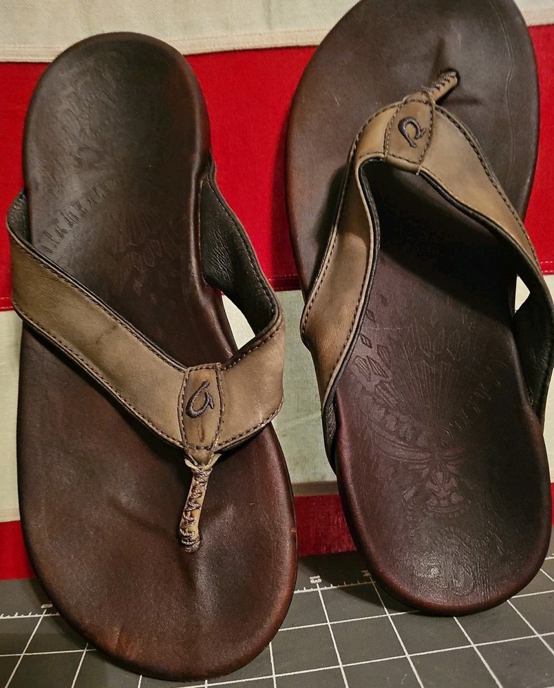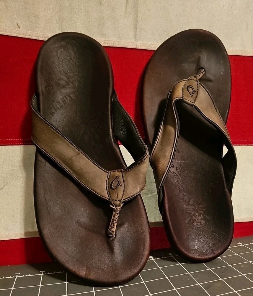 OLUKAI Dark Brown Leather Nui Thong Beach Comfort Sandals Flip Flops Men's Sz 8. Condition is Pre-owned. Shipped with USPS Ground Advantage.