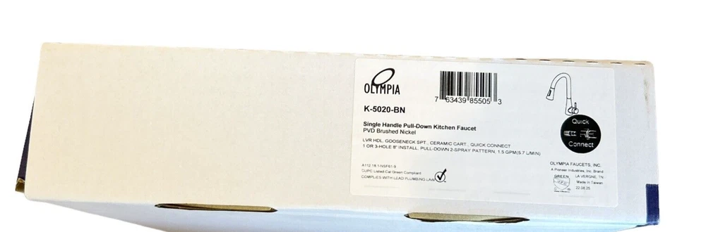 Brand Olympia Faucets MFR # K-5020-BN Country of Origin Taiwan, Province of China Category Kitchen Faucets Dimensions Overall Width 4.06" Overall Height 15.38" Connection Size 3/8" Center-Center Fitting Size Single Hole Details Number of Holes 1 or 3 Finish Brushed Nickel ADA Compliant Yes Valve Type Ceramic Disc Flow Rate (GPM) 1.5 Weight 6 Handle Included Yes Style Modern Mount Type Single Hole Connection Type Compression Hose Spout Reach 7.63" Handle Style Lever Installation Deck Mount
