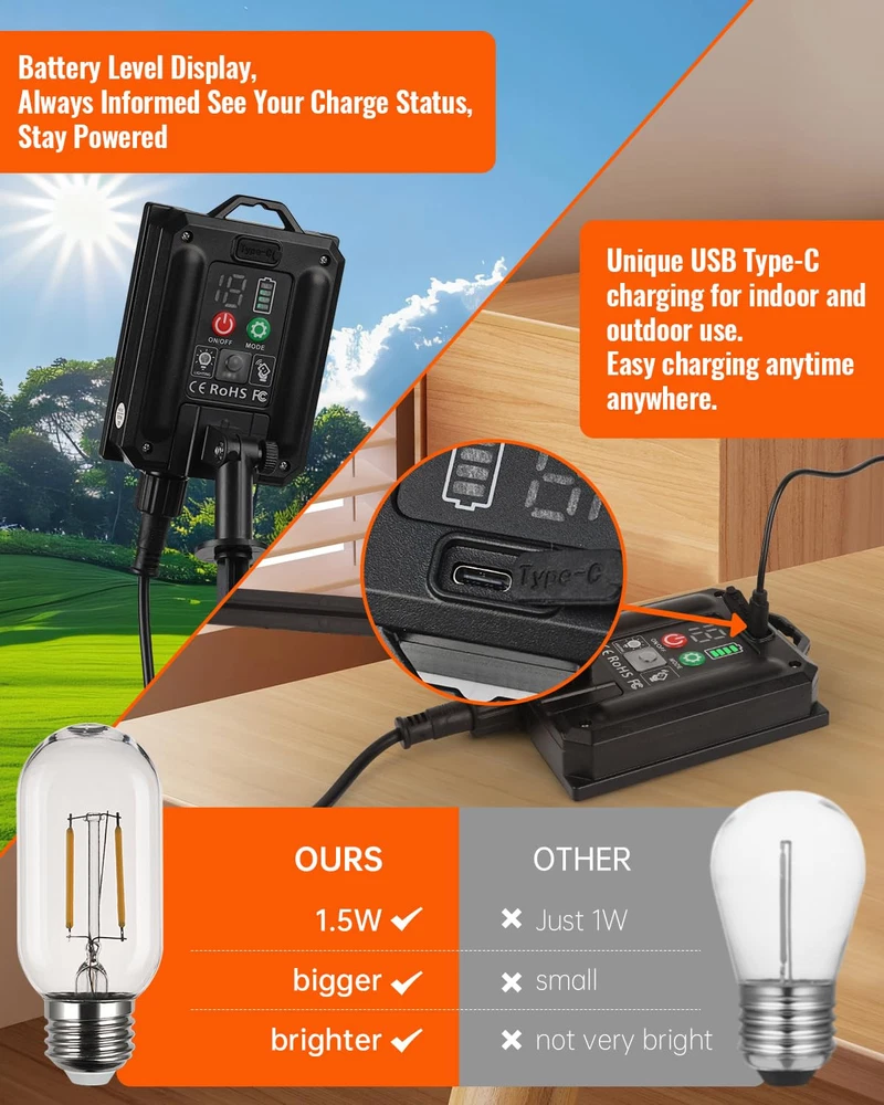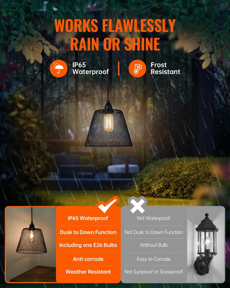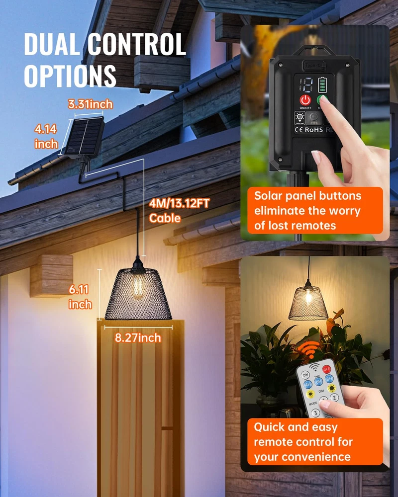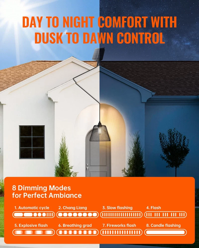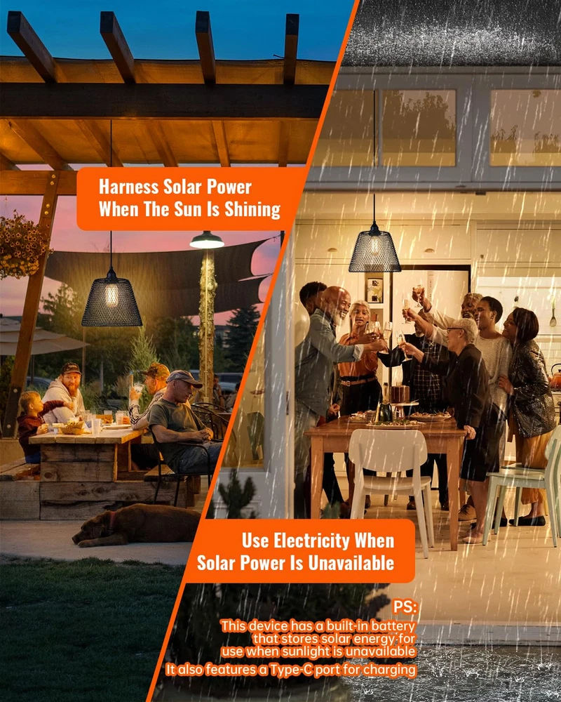 Reliable illumination: Our outdoor solar lights have a high-capacity battery that lasts 8-10 hours on low brightness and can be charged via USB. A clear power indicator ensures your lights are always ready to shine. 1.5w 3000k soft white light is bright and perfect for vintage decor. Harness renewable solar power: Our solar lights are waterproof, ensuring reliable performance in outdoor conditions, and feature high-quality 1.5W energy-efficient LED bulbs for illumination while saving power and reducing electricity consumption, with a 3-year after-sales coverage User-Friendly Installation: To ensure a strong waterproof seal, our extra-deep design requires a bit of force when installing the bulb. We provide easy steps in our installation video for hassle-free setup Customizable Lighting Modes: Hanging pendant light automatically adapt to changing light conditions with Dusk to Dawn functionality. Enjoy three adjustable brightness levels and eight enchanting lighting modes. Enhanced Outdoor Atmosphere: Ideal for parties, barbecues, or gatherings, these stylish lights create a captivating ambiance while improving nighttime safety. Their versatility makes them essential for any home, beautifully illuminating every moment