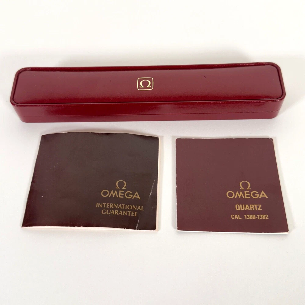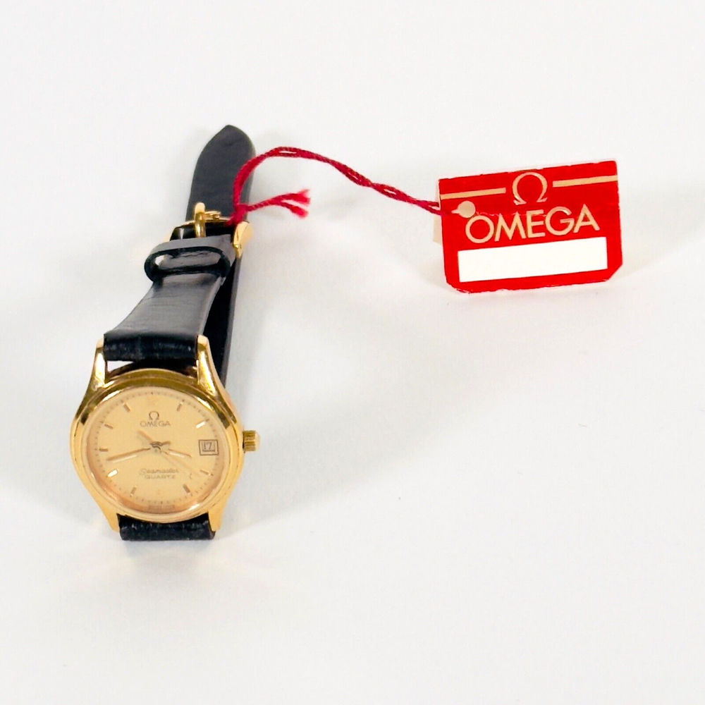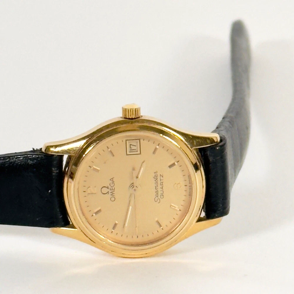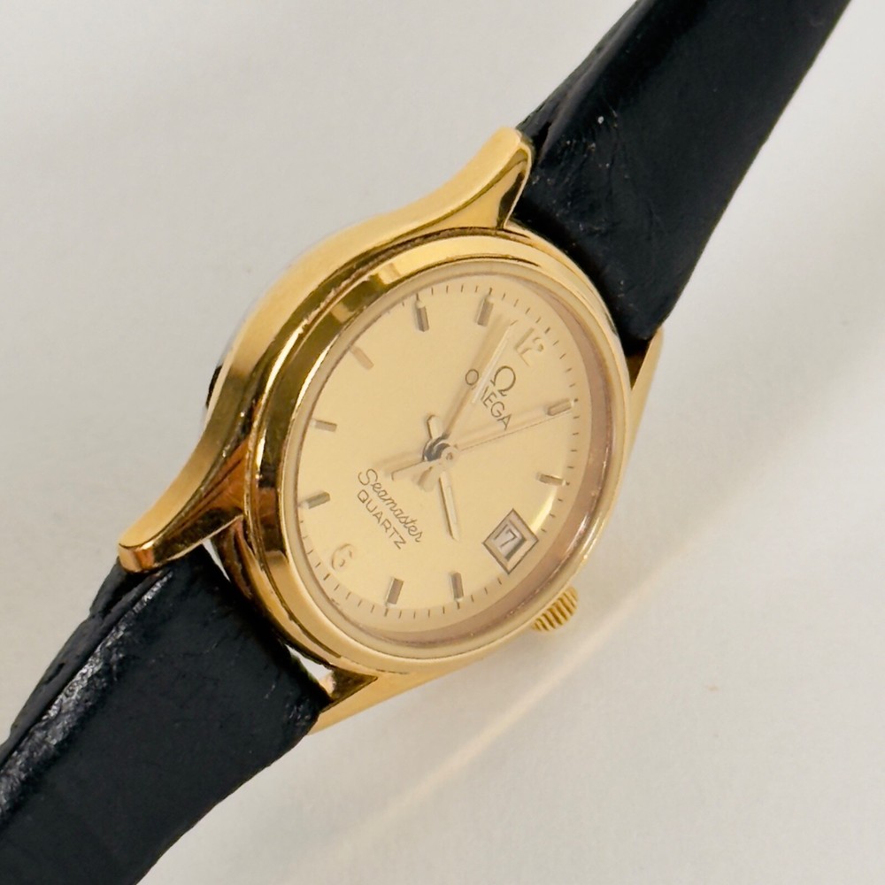 OMEGA Seamaster 596.0044 "BREST" | 18K GP Ladies Watch | Champagne Gold Dial | 1983 | SET Brand: Omega Model: Seamaster “BREST” Reference: 596.0044 Movement: Quartz Caliber: 1380 Jewels: 7 Dial: Champagne Gold Case Diameter: 23mm (excluding crown) Crown: Omega 18K Yellow Gold-Plated, Signed (Ω Logo) Strap: Omega Black Leather Strap, Swiss Made, 12mm/10mm Buckle: Omega 18K Yellow Gold-Plated Tang Buckle, 10mm ( Marked AW Logo, Swiss, Plaque G Hallmarks ) Year: Circa 1983 Serial Number: 45**46 Accessories Include: – Omega Burgundy Presentation Box – Omega 1380 Movement Manual – Omega International Guarantee (1983) – Omega Hanging Tag Condition: Excellent working condition, showing signs of wear consistent with its 42-year age. Dial and case remain well-preserved, and the watch retains its classic vintage charm. This complete set is ideal for collectors seeking an elegant 1980s Omega ladies’ piece with original documentation and packaging. Please review all photos carefully as they are part of the description. We respond promptly to all inquiries. If you have any questions, don’t hesitate to reach out. If anything is less than perfect, please contact us before leaving feedback. We’re here to help. Thank you for choosing ION Watches. We sincerely appreciate your business.