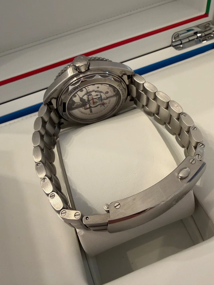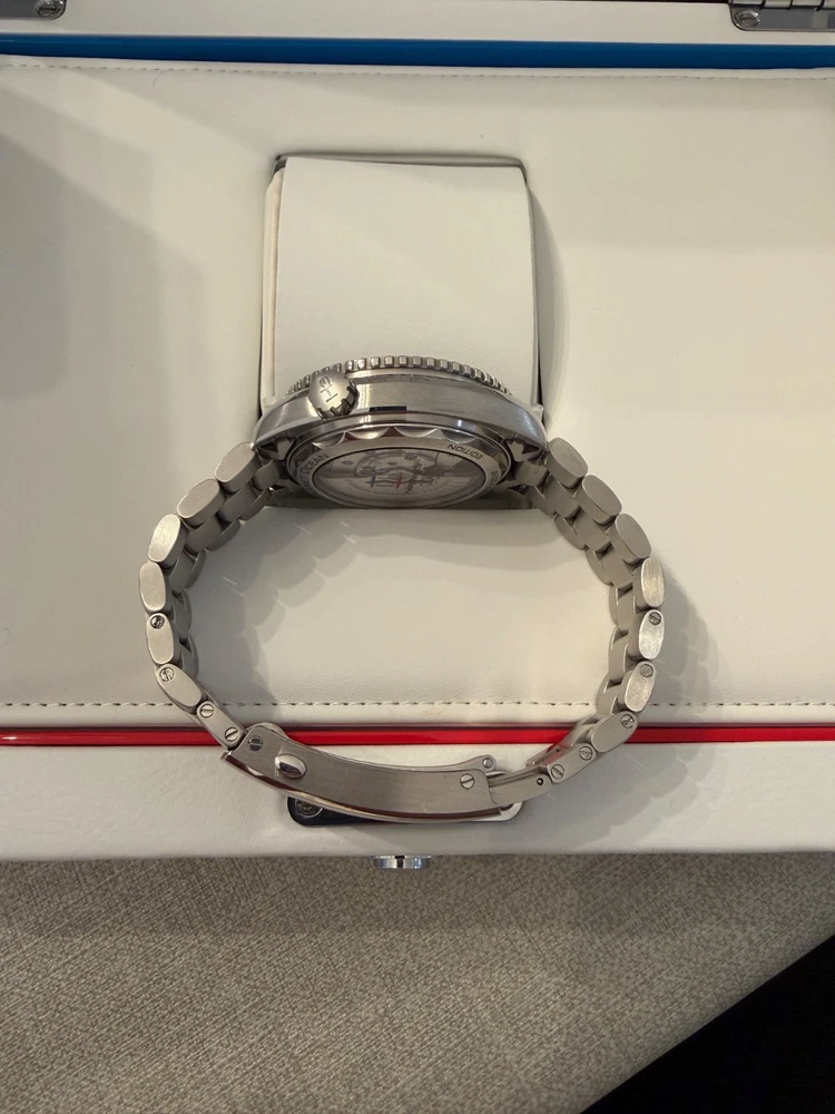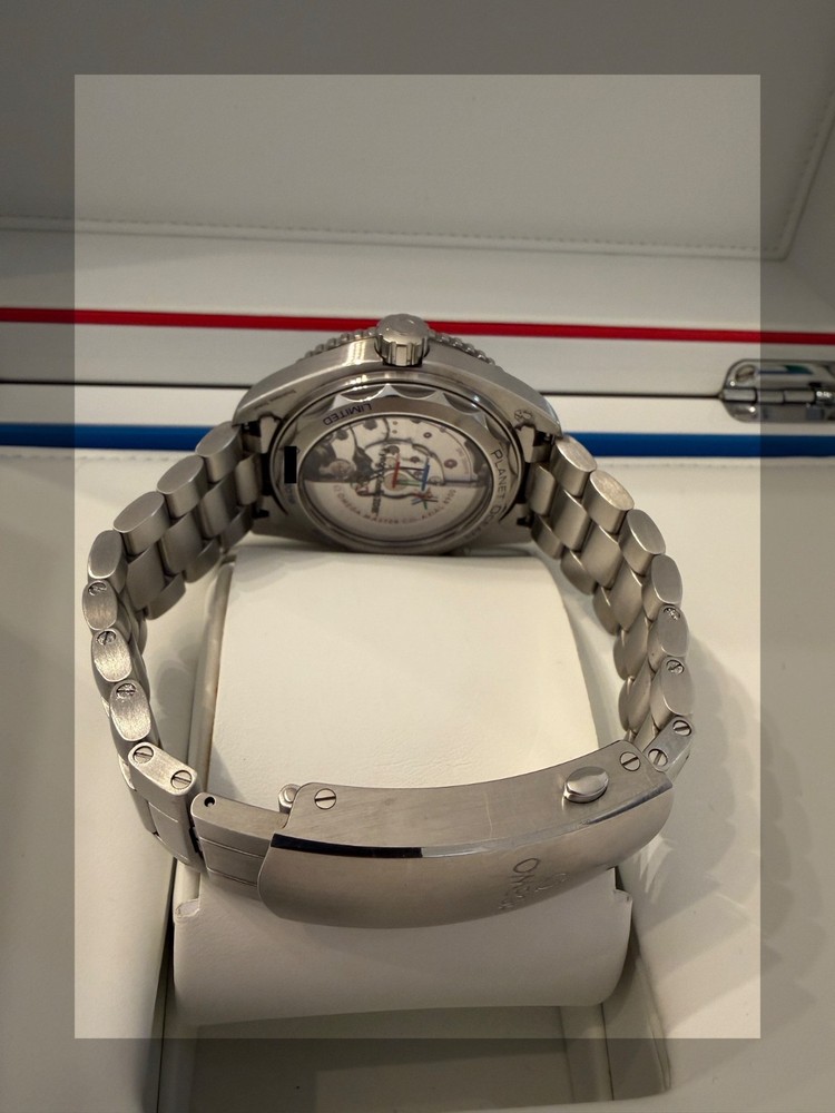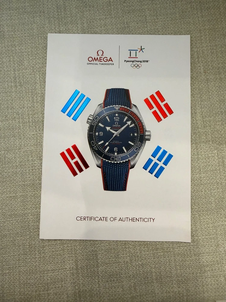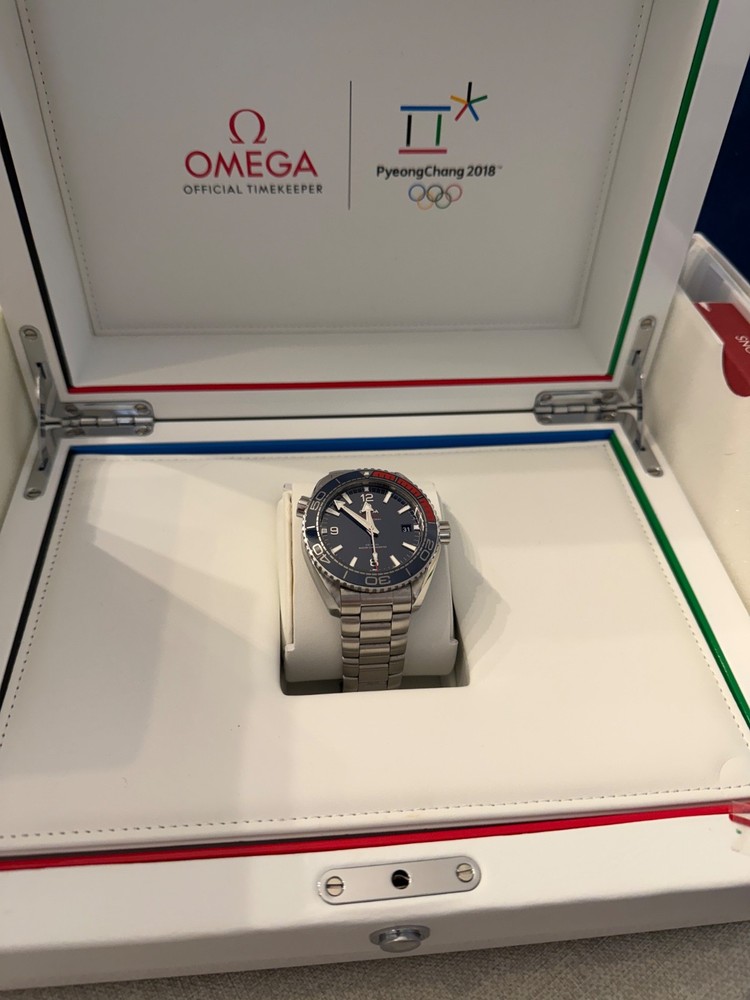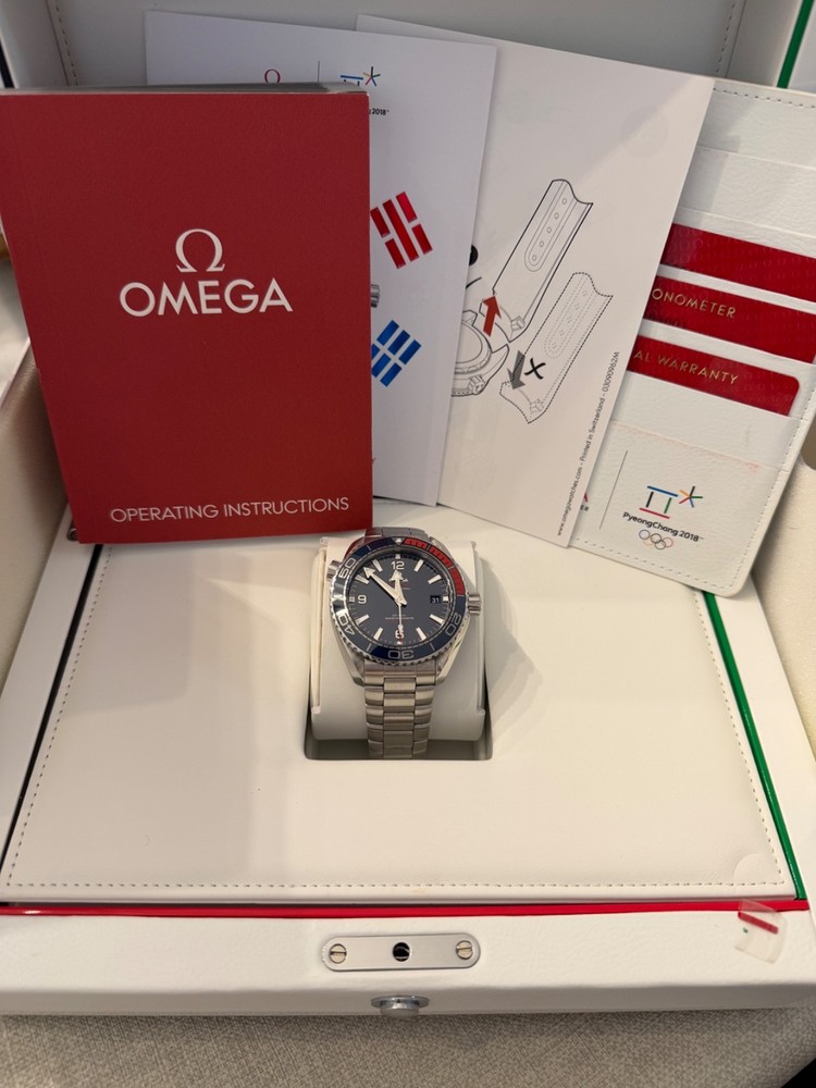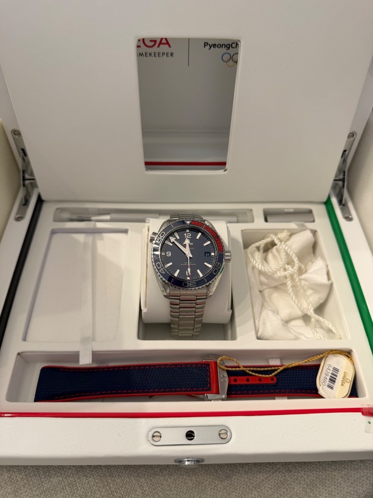 Pre-owned in Excellent Condition I am the 2nd owner Wore it a handful of times Comes with a Stainless steel bracelet full links and a Rubber strap in navy and red with Omega clasp Comes in original box and papers. Outer box needed some tape to keep it in tact, otherwise the inner box is in excellent condition. Watch comes with all its papers, I posted pics of all the paperwork, manual, cards with omega wallet etc. Watch is in excellent working condition, keep time great. If you have any questions or need more images feel free to message me. Limited to 2,018 pieces, this collectable timepiece in the colours of the South Korean flag is cased in stainless steel and features a polished blue ceramic [ZrO2] dial and unidirectional bezel, uniquely blended with red rubber for the first 15 minutes. Its deep blue dial is given a metallic lift by the applied rhodium-plated indexes and minute scale in OMEGA Liquidmetal™. The screw-in caseback is engraved in blue with the words PLANET OCEAN and LIMITED EDITION, as well as the Limited Edition number. Transferred to the caseback's sapphire crystal are the words "PyeongChang 2018" and the Olympic Games logo. The watch is presented on a blue rubber strap and delivered in a special presentation box with an extra stainless steel bracelet. Its beating heart is the OMEGA Co-Axial Master Chronometer Calibre 8900. Reference 522.32.44.21.03.001 Between lugs Open Case Measurement Modal 21 mm Lug‑to‑lug Open Case Measurement Modal 49.00 mm Thickness Open Case Measurement Modal 16.09 mm Case diameter Open Case Measurement Modal 43.5 mm Case Steel Dial color Blue Crystal Domed scratch‑resistant sapphire crystal with anti‑reflective treatment on both sides Water resistance 60 bar (600 metres / 2000 feet) Total product weight (approx.) 135 g Caliber Omega 8900 Movement type Self winding Power reserve 60 hours