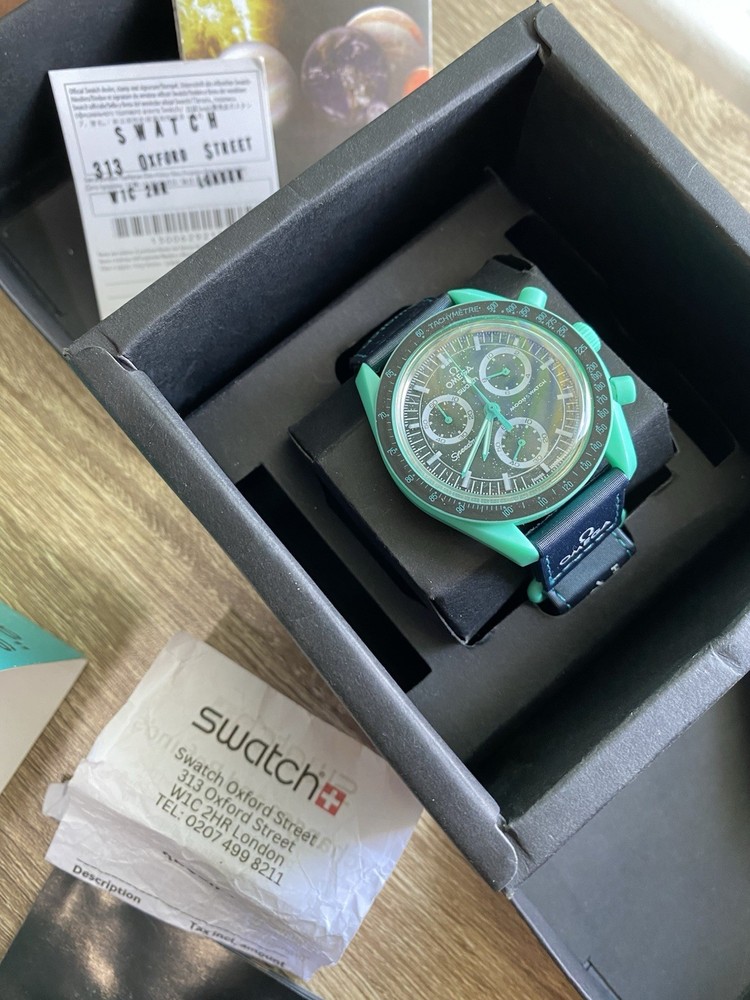 Crafted for both style and function, the OMEGA x Swatch MoonSwatch Mission On Earth, Polar Lights Edition is a sleek timepiece for the discerning individual. The watch features a durable ceramic case with a complementary black dial adorned with baton indexes for a classic yet modern look. Its quartz movement ensures precise timekeeping, while the integrated lights offer a subtle glow for visibility in the dark. The piece boasts a unisex design, making it a versatile addition to any wardrobe. Water-resistant up to 30 metres, it's suited for everyday wear and casual aquatic activities. The watch comes complete with its original box and papers, affirming its authenticity and OMEGA's commitment to quality.