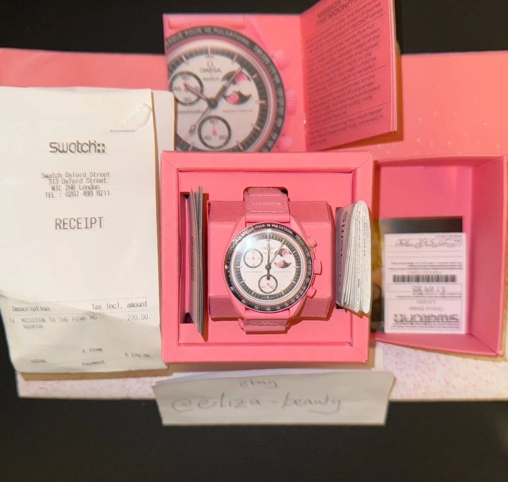IN HAND: OMEGA X Swatch MoonSwatch PINK Moonphase ๐Ÿ’–๐ŸŒ™ - SO33P700 ๐ŸŒ• Exclusive & EXTREMELY Limited! ๐Ÿšจ NOW IN HAND โ€“ READY TO SHIP IMMEDIATELY! ๐Ÿšจ Own the iconic Swatch Bioceramic MoonSwatch โ€“ Mission to the PINK Moonphase (SO33P700) , now IN HAND and available to ship RIGHT NOW . This exclusive and extremely limited edition was only released randomly between April 1st โ€“ 15th at selected Swatch stores worldwide and celebrates the mystical glow of April's Pink Moon with a poetic Moonphase complication โ€” a first in the MoonSwatch line. ๐Ÿ’–๐ŸŒธ Key Features: Official OMEGA x Swatch Collaboration โ€“ Model: SO33P700 Pink Bioceramic Case, Crown & Pushers โ€“ Lightweight and futuristic Black & Silver-Pink Opaline Dial โ€“ Elegantly unique Moonphase Subdial at 2 oโ€™clock โ€“ Rotating twin pink moons Pink Super-LumiNovaยฎ โ€“ Glows vividly pink in the dark Black Bioceramic Bezel โ€“ With white pulsometer scale Heart-Embossed Push Button โ€“ Pulsometer inspired Size: 42mm Diameter | 13.75mm Thickness | 47.30mm Lug-to-Lug Strap: Pink Velcroยฎ with White Stitching & Pink Bioceramic Loop Movement: Quartz Chronograph with Moonphase Indicator Water Resistance: 3 BAR UV Reactive Detail โ€“ Secret pink effect on the moonphase mask Pink Moon Battery Cover โ€“ Radiant spectrum design ๐Ÿ“ฆ What Youโ€™re Getting: โœ… 100% Authentic โ€“ Bought directly from Swatch โœ… Factory-Sealed, Brand New Condition โœ… Extremely Limited April 2025 Release โœ… IN HAND & Ready for Immediate Dispatch โœ… Tracked & Fully Insured Shipping โœ… Carefully Packaged for Protection โœ… ๐Ÿงพ Includes All Original Receipts, Papers & 2-Year Swatch Warranty ๐ŸŒ™๐Ÿ’– This is your chance to secure the most poetic and collectible MoonSwatch ever made. Availability was extremely limited , released at random locations only during a 15-day window. Donโ€™t miss your opportunity to own this extraordinary tribute to the Pink Moon. ๐ŸŒ•๐Ÿ’— Mission to the Pink Moonphase wonโ€™t come around again โ€“ grab yours while you can!