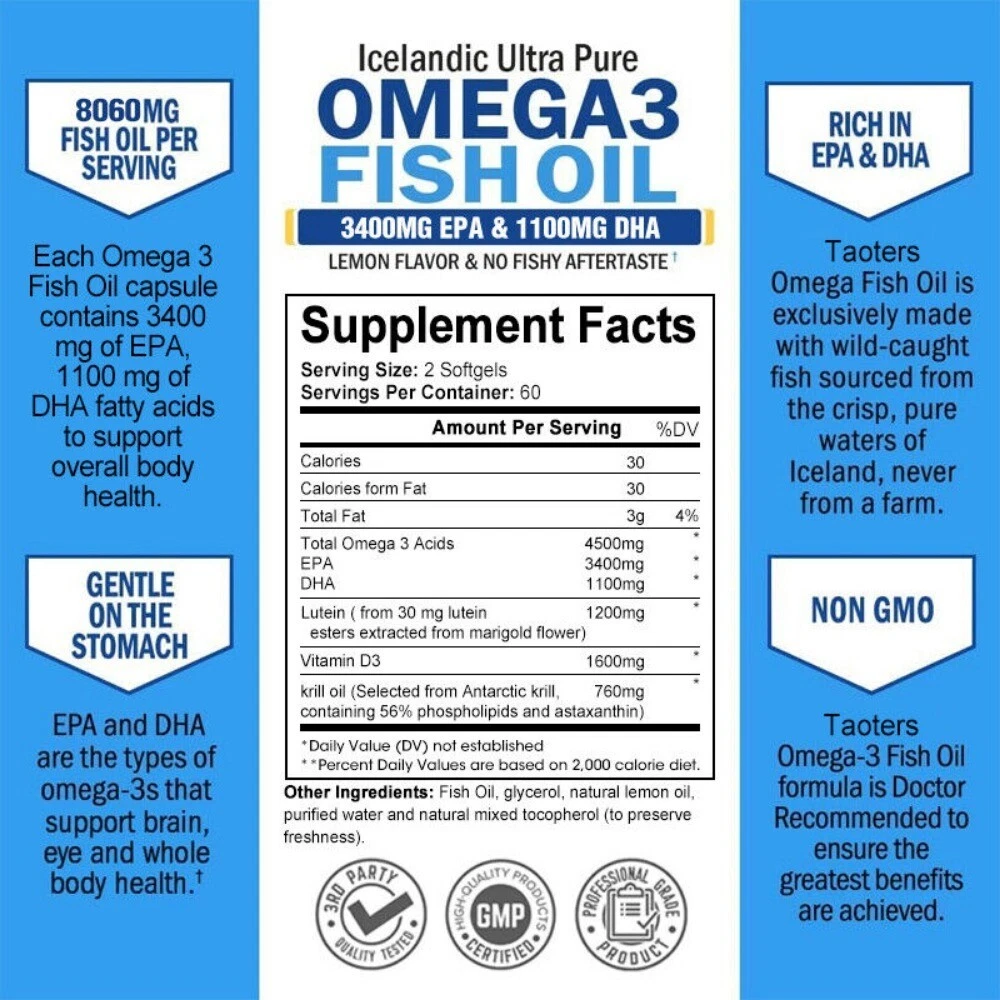 Store Categories Store Categories Health Capsules Book Perfume Game Cards Other Omega 3 Fish Oil Capsules High Strength 8060mg EPA & DHA, Highest Potency Product Description Description Helps Promote Overall Health: Extra Strength Our fish oil contains the richest source of omega-3 fatty acids to help support your brain, heart, immune system, and bones and joints. Optimum Absorption, No Fishy Aftertaste: Enteric coating provides better absorption and helps deliver the full benefits of fatty acids; Our advanced clarification process makes it easier to swallow the pill after a fishy smell or burping (*Allergen Awakening: This product Contains soy). Non-GMO, Advanced Purification: We source only fresh, wild-caught fish, not farm-grown fish; we also purify our fish oil using molecular distillation to remove heavy metals and PCBs and reduce risk levels of other toxins. Payment Policy Shipping Policy Returns Policy Payment Policy eBay Accepts The Following Payment Methods: 1.Visa 2.Mastercard 3.PayPal 4.Apple Pay 5.Google Pay 6.American Express Card Shipping Policy All the items will be dispatched within 3 business day after the payment is clear. Shipping may be delayed during special holidays We are not responsible for any custom duty or import tax. Returns Policy 1. If you need return, please contact us with Email before open a case, let us know the detailed problem and send us some pictures for confirmation. 2. All returned items must be in the original packaging and provide us tracking number, specific reason for the returns. Copyright © 2023 Dianxiaomi