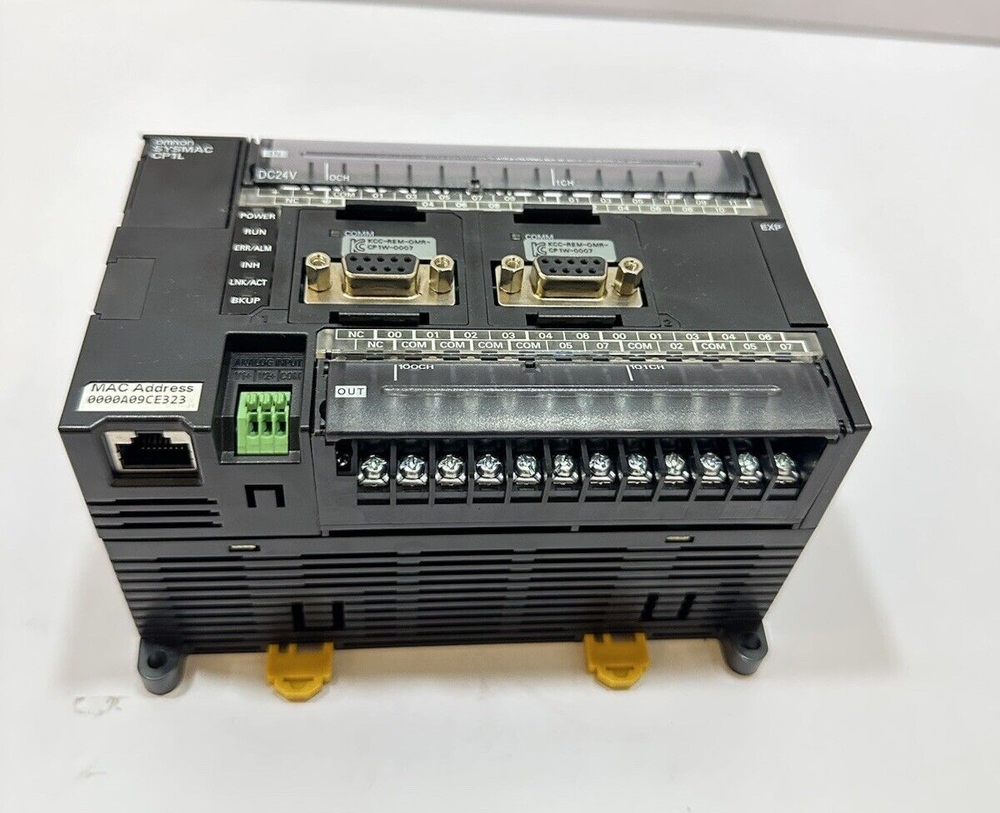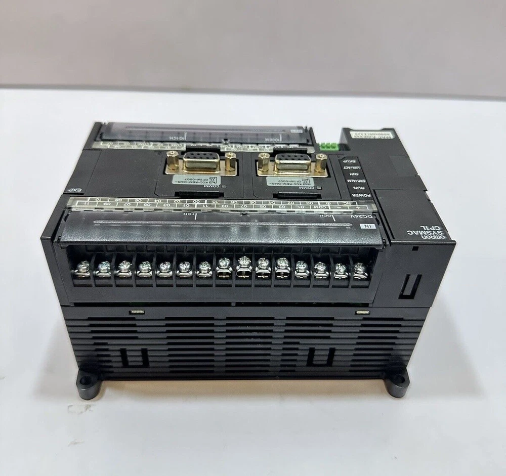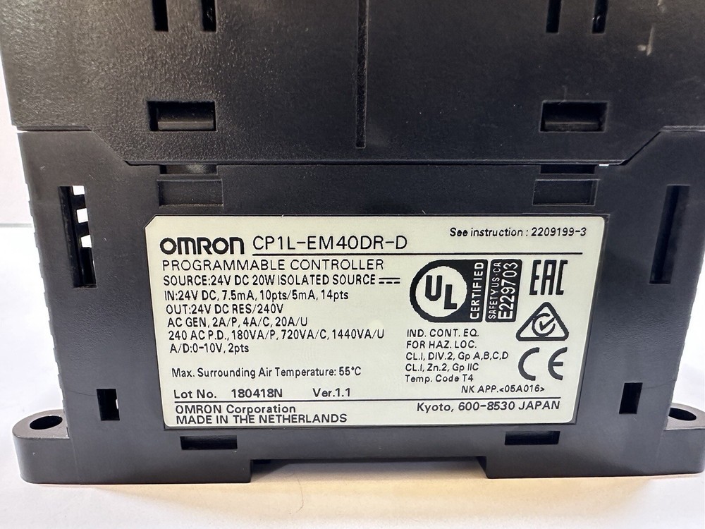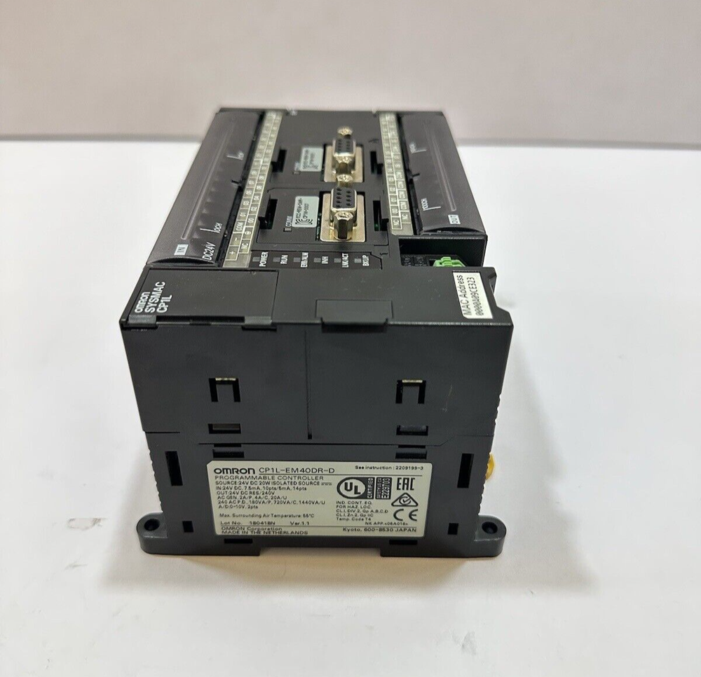 OMRON SYSMAC CP1L-EM40DR-D PROGRAMMABLE CONTROLLER BRAND : OMRON MODEL : CP1L-EM40DR-D SYSMAC PROGAMMABLE CONTROLLER SOURCE : 24V DC 20W ISOLATED SOURCE IN : 24V DC, 7.5mA, 10pts/5mA, 14pts OUT : 24V DC RES/240V LOT NO. 180418N VER : 1.1 MADE IN NETHERLAND