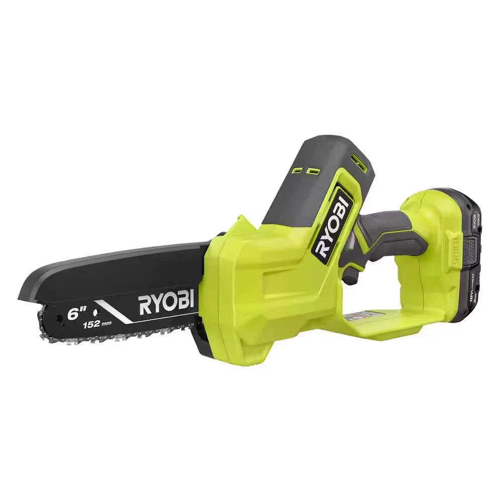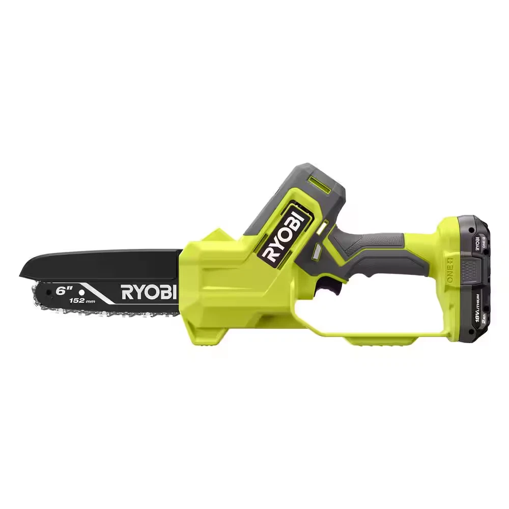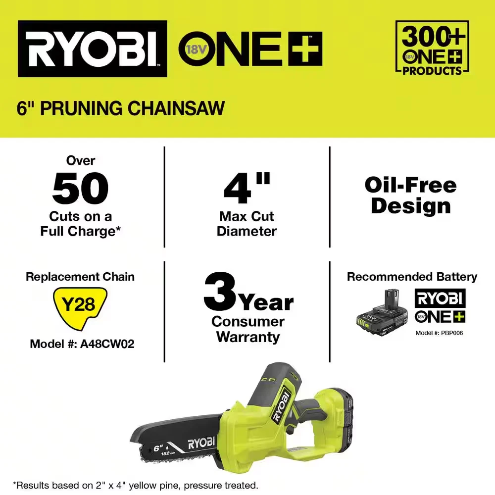 Fast Shipping On All Items 30 Days Money Guarantee Customer Support Excellent Service 100% Satisfaction Satisfaction Guaranteed ONE+ 18V 6 In. Cordless Battery Compact Pruning Mini Chainsaw with 2.0 Ah Battery and Charger Specification Battery Amp Hours 2 Ah Battery Power Type Lithium Ion Battery Size 18-volt Battery Voltage (V) 18V Battery/Charger (1) 2 Ah Battery & Charger Included Chain Pitch 3/8 in. Chain Speed (mps) 4.9 Chainsaw Bar Size Mini Chainsaw Type Hand Chainsaw Charger Included Charger Included Color Family Green Condition New Drive Links 38 Features Portable Filter Type No Filter Gauge .043 Handle Type Rear Handle Chainsaw Included Chain,Scabbard Number of Total Batteries Included 1 Outdoor Power Combo No Additional Tools Power Type Battery Product Weight (lb) 2.7 lb Refurbished No Returnable 90-Day Tools Included Battery,Chainsaw,Charger Torque Maximum (Nm) 0 Certifications and Listings UL Listed Manufacturer Warranty 3 Year Limited Warranty Bar Length (in) 6 in. Chain Size 6 in. Maximum Cut Diameter (in) 4 in 6.0 inches. Weight: 2.7 lb Item Description Pruning chainsaw cuts limbs up to 4”, ideal for pruning & limbing Over 50 cuts per charge when using an 18V ONE+ 2Ah battery Over 300 ONE+ Products. All Work With Any RYOBI ONE+ 18V Battery The 18V ONE+ 6" Pruning Chainsaw Kit is equipped with a 6" bar and chain and powerful motor to tackle branches up to 4", making it ideal for light pruning and limbing. With over 50 cuts per charge and a premium full house chain, the pruning chainsaw delivers longer runtime and faster cutting. The compact design allows you to go where other chainsaws can't, getting into tight, hard-to-reach spaces. Experience exceptional performance with just the pull of a trigger, without the hassle of gas or cords. This saw features tool-less chain tensioning and an oil-free design for ultimate convenience, allowing you to adjust the tool without having to leave the work site. It is equipped with multiple safety features such as the chain & handle guards that ensure every cut is a safe cut. The variable speed trigger gives you maximum control during any application. It's compatible with the A48CW02 6" Replacement Chain. Best of all, it is part of the RYOBI ONE+ system where any 18V ONE+ battery works with any 18V ONE+ product. This 18V ONE+ 6in Pruning Chainsaw Kit is backed by the RYOBI 3-Year Manufacturer's Warranty and includes the PCLCW01 18V ONE+ 6" Pruning Chainsaw, PBP006 18V ONE+ 2Ah Battery, 18V Charger, Scabbard, and Operator's Manuals. About us We offer the best prices around on high quality products. Our E-store includes media such as books, movies, music and games while offering electronics, toys, sporting apparel, clothing, tools, general home, garden items and more. Shipping We are always working hard to ensure your package arrives as soon as possible. Please understand that some factors like weather, high postal traffic, and the performance of shipping companies are outside of our control. We offer free shipping to the lower 48 states and ship within 2-3 business days of payment, usually sooner. We do not accept P.O. Boxes. Please provide a physical address. For shipping outside of the continental USA, we only use eBay's Global Shipping Program.The item is shipped to KY and then sent to the rest of the world. International customers are responsible for all duties and taxes. Continue to check out to calculate costs for shipping the item to your country. Messages regarding eBay's Global Shipping Program MUST be directed at eBay EXCLUSIVELY. Returns We offer a 30-Day Return Policy on items in which you are not completely satisfied with. You have the option of a full-refund or an exchange of the item. No returns are available on items shipped outside of the USA Satisfaction We try over very best to make sure every customer is completely satisfied. If there's a problem, message us! We're happy to help. Payment Options Shop With Confidence