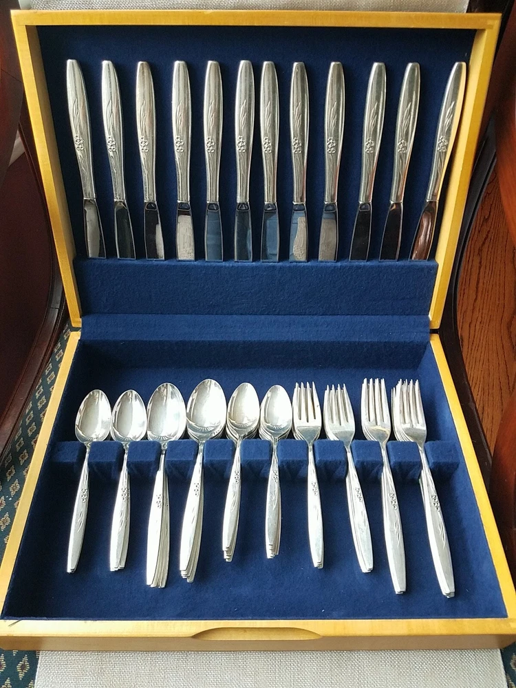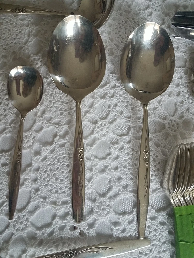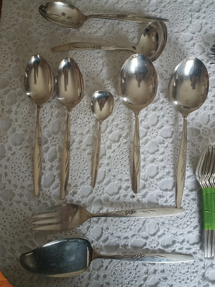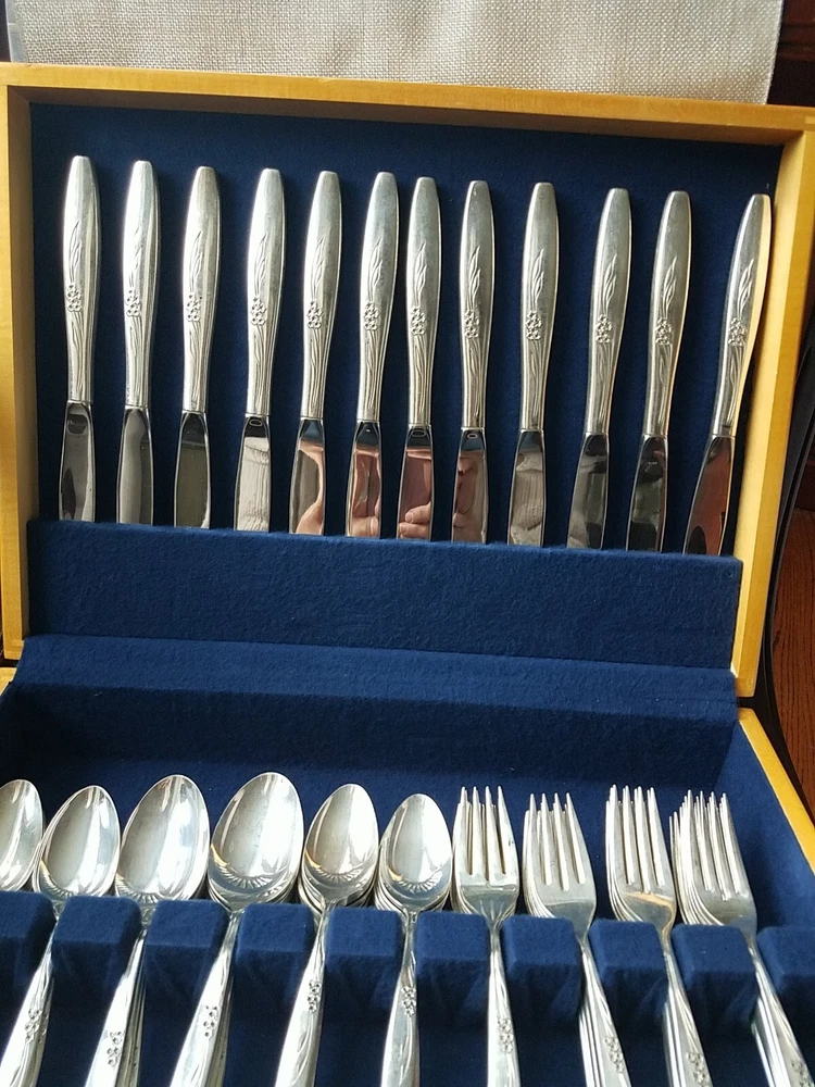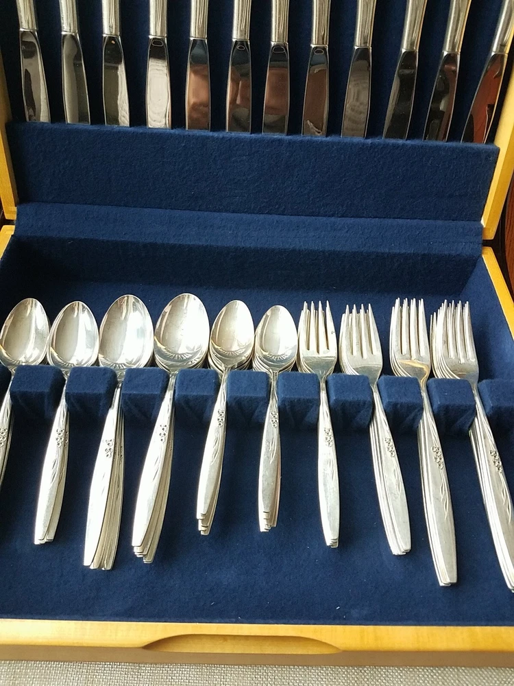 ONEIDA COMMUNITY SILVER FLOWER SILVER PLATE FLATWARE SET (PSV002023). MAKE OFFER NOW AND OWN IT TODAY!!! 100 pieces of this GORGEOUS complete vintage set!!! Includes lined wood case!!! You get all pieces shown. Including 9 Hostess Serving pieces. Plus a few very HARD TO FIND PIECES, such as: Fish forks 6, 1 baby set (spoon and fork) 3 children's sets (knife & fork only) 3 spreaders, 12 sets of knives, salad fork, dinner fork, soup spoon, and tea spoons. Still bright and shiny. This set has been used (so some usage scuffs) but lovingly and not very much. Please see all photos for the best description.