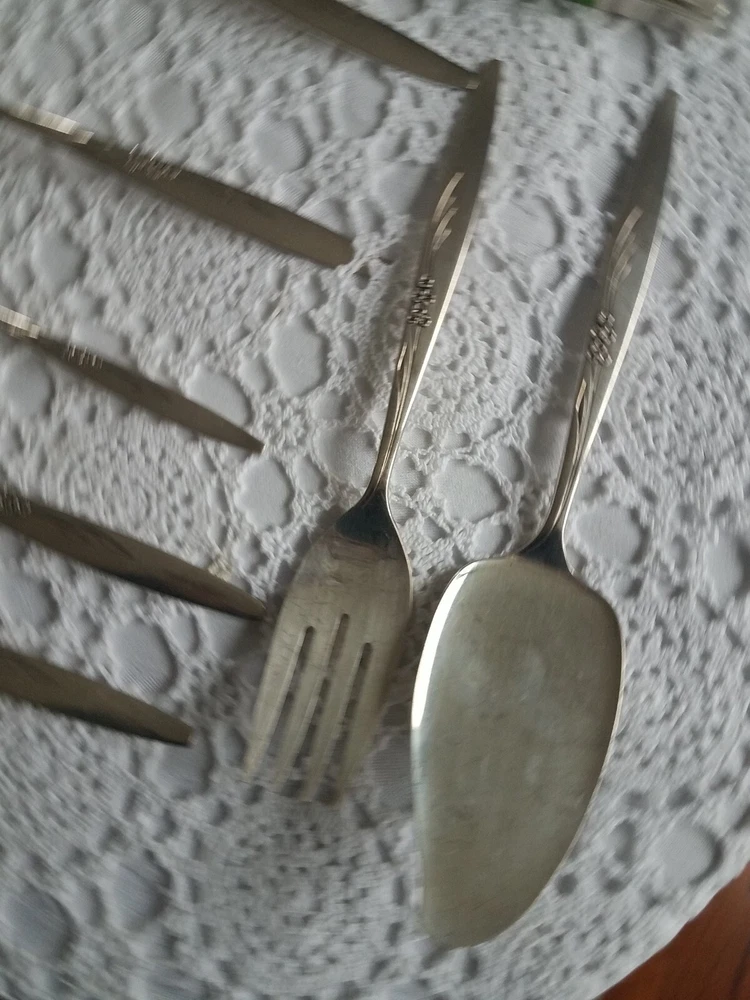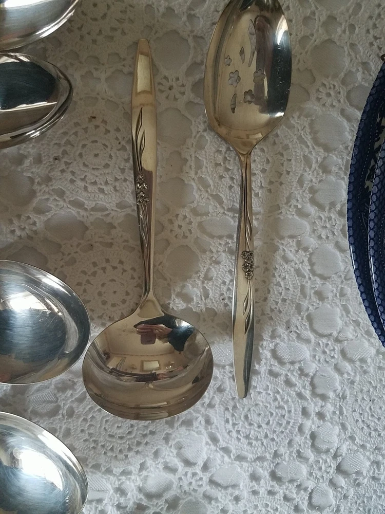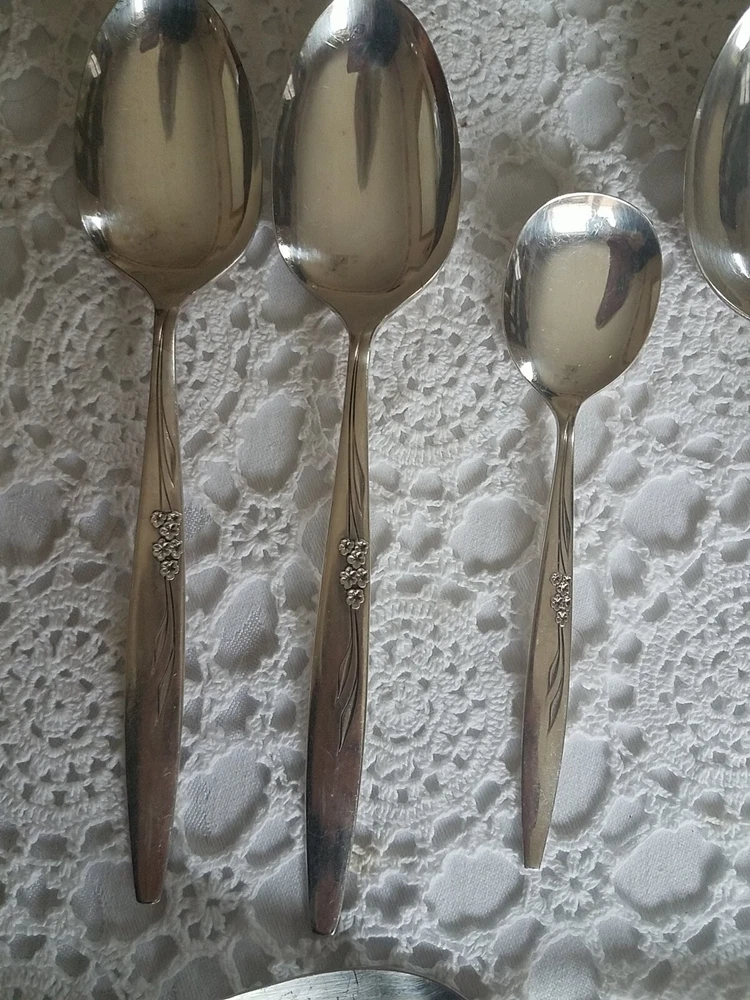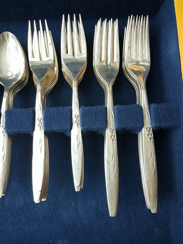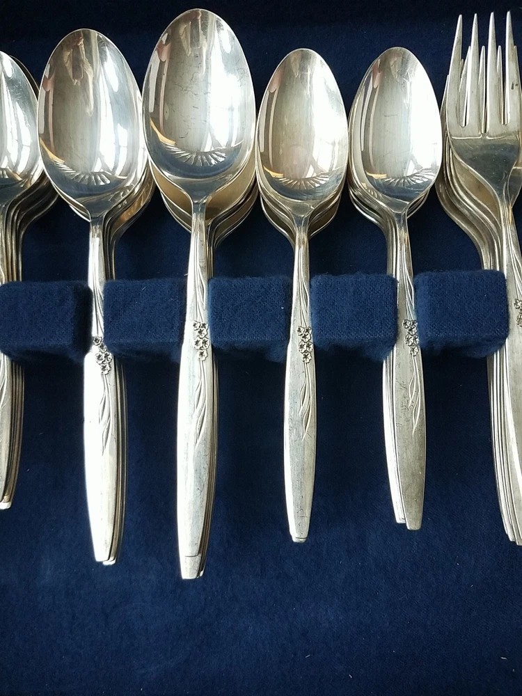 ONEIDA COMMUNITY SILVER FLOWER SILVER PLATE FLATWARE SET (PSV002023). MAKE OFFER NOW AND OWN IT TODAY!!! 100 pieces of this GORGEOUS complete vintage set!!! Includes lined wood case!!! You get all pieces shown. Including 9 Hostess Serving pieces. Plus a few very HARD TO FIND PIECES, such as: Fish forks 6, 1 baby set (spoon and fork) 3 children's sets (knife & fork only) 3 spreaders, 12 sets of knives, salad fork, dinner fork, soup spoon, and tea spoons. Still bright and shiny. This set has been used (so some usage scuffs) but lovingly and not very much. Please see all photos for the best description.