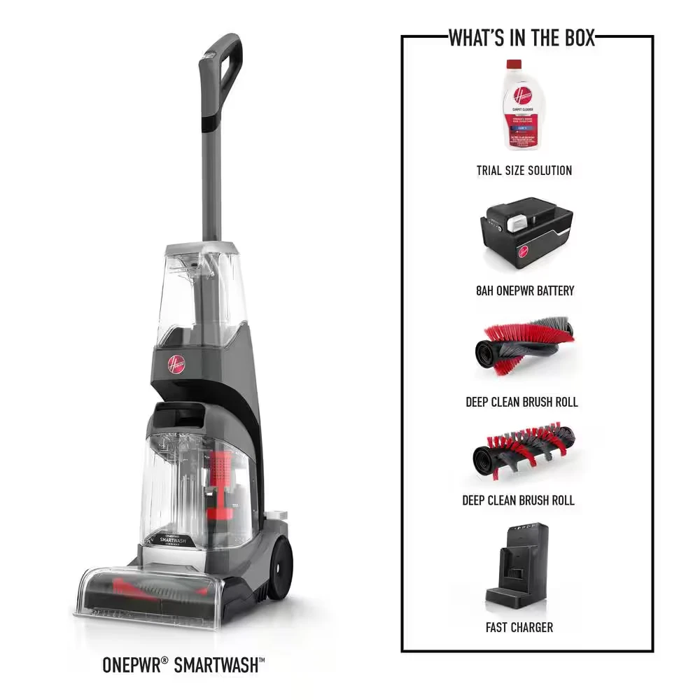 Fast Shipping On All Items 30 Days Money Guarantee Customer Support Excellent Service 100% Satisfaction Satisfaction Guaranteed ONEPWR SmartWash Automatic Cordless Upright Carpet Cleaner Machine, Deep Clean Carpet Shampooer with Battery and Charger Specification Amperage (A) 200 A Appliance Category Floor Care Appliance Series Not Applicable Brush Types Included Brushroll Bundling Options Battery,Charger Carpet Cleaner Type Upright Carpet Cleaners Cleaning Path Width (in) 10 in Cleaning Tank Capacity (gallons) 0.625 Collecting Tank Capacity (gallons) 0.5 Color Family Black Commercial/Residential Residential Cord Length (ft) 0 ft Cordless/Corded Cordless Floor Care Features See-Through Water Tank,Shampoo,Wet/Dry Horsepower (hp) 0 hp Included Accessories Batteries,Charger,Cleaning solution Material Plastic Noise Level (dB) 0 Number of Attachments 2 Number of Wheels 2 Product Weight (lb) 15 lb Recommended Surfaces Carpet Returnable 90-Day Voltage (v) 18v Certifications and Listings AHAM Certified Manufacturer Warranty 3 Year Limited Warranty Product Depth (in) 18 in Product Height (in) 23 in Product Width (in) 18 in 18.0 inches x 18.0 inches x 23.0 inches. Weight: 15.0 lb Item Description Powerful cordless carpet cleaner machine Automatic cleaning technology senses when to wash and dry Tackle deep, set-in stains with spot mode Hoover ONEPWR SmartWash is the world's first cordless carpet cleaner, packed with advanced and intuitive tech to out clean even the leading corded competition*. This powerful carpet cleaner combines triggerless, automatic cleaning technology-automatically sensing when to wash and dry -with TruMAX Technology for extended cleaning sessions. Tackle deep, set-in stains effortlessly with the Spot Mode, while tool-free and hassle-free cleanup is ensured with the removable dirty water tank lid, nozzle, and brush roll. Elevate your cleaning routine with the convenience of cordless power and intelligent features, backed by the most advanced cordless cleaning network in the world.*Compared to Bissell ProHeat 2X Revolution Pet Pro 3588 in MAX Clean Mode ASTM F2828-20 POWERFUL & CORDLESS: Enjoy powerful cleaning and extraction with the convenience of cordless cleaning CORDLESS CLEANING: Out cleans the leading corded competition**Compared to Bissell ProHeat 2X Revolution Pet Pro 3588 in MAX Clean Mode ASTM F2828-20 AUTOMATIC CLEANING TECHNOLOGY: ONEPWR SmartWash automatically senses when to wash and dry SPOT MODE: Get an extra burst of power to tackle deep, set-in stains DRY ONLY MODE: Dry floors more quickly and get back to life quicker TRUMAX TECHNOLOGY: Clean farther and take less trips to the sink. TruMAX Technology allows for more dirty water to be captured before the tank needs to be emptied HASSLE-FREE CLEAN-UP: Removable dirty water tank lid, nozzle and brush roll make clean-up easy About us We offer the best prices around on high quality products. Our E-store includes media such as books, movies, music and games while offering electronics, toys, sporting apparel, clothing, tools, general home, garden items and more. Shipping We are always working hard to ensure your package arrives as soon as possible. Please understand that some factors like weather, high postal traffic, and the performance of shipping companies are outside of our control. We offer free shipping to the lower 48 states and ship within 2-3 business days of payment, usually sooner. We do not accept P.O. Boxes. Please provide a physical address. For shipping outside of the continental USA, we only use eBay's Global Shipping Program.The item is shipped to KY and then sent to the rest of the world. International customers are responsible for all duties and taxes. Continue to check out to calculate costs for shipping the item to your country. Messages regarding eBay's Global Shipping Program MUST be directed at eBay EXCLUSIVELY. Returns We offer a 30-Day Return Policy on items in which you are not completely satisfied with. You have the option of a full-refund or an exchange of the item. No returns are available on items shipped outside of the USA Satisfaction We try over very best to make sure every customer is completely satisfied. If there's a problem, message us! We're happy to help. Payment Options Shop With Confidence