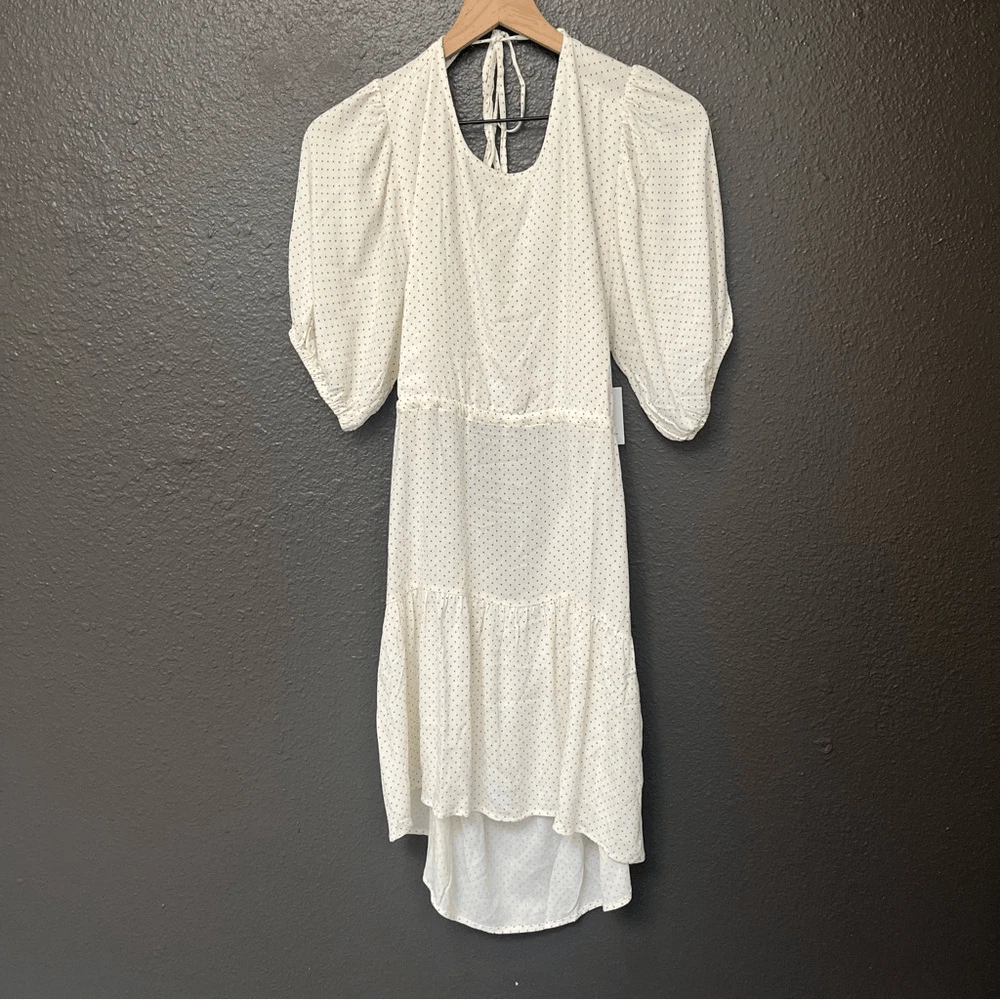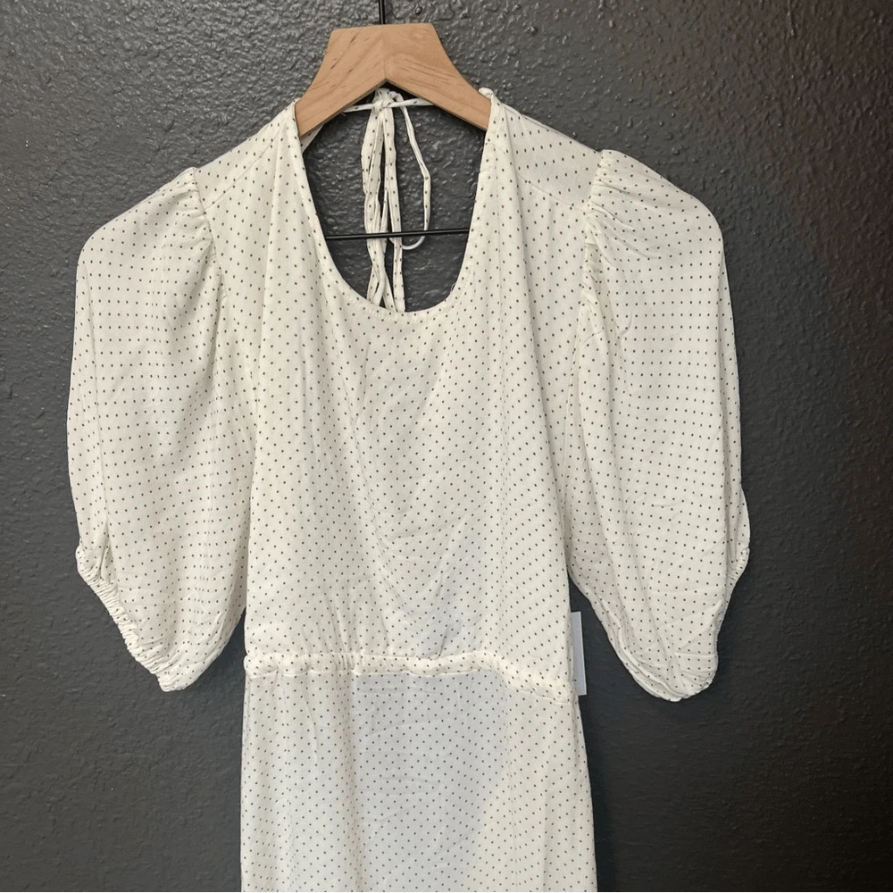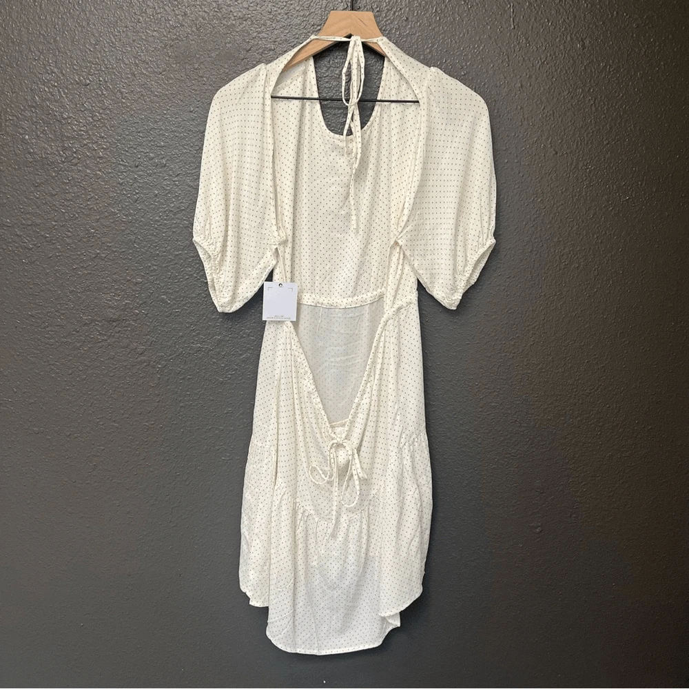 O’Neill Alta Dot Print Open Back Minidress NEW with tags Size Large Color: Winter White True to size. XS=0, S=2-4, M=6-8, L=10-12, XL=14. A perfect pin-dot print covers this chic open-back mini styled with a ruffled skirt and elbow-length puff sleeves. Jewel neck Elbow-length sleeves 95% viscose, 5% elastane DSTS