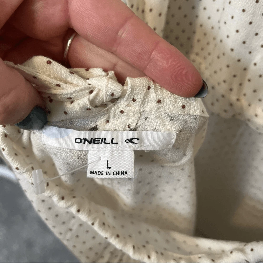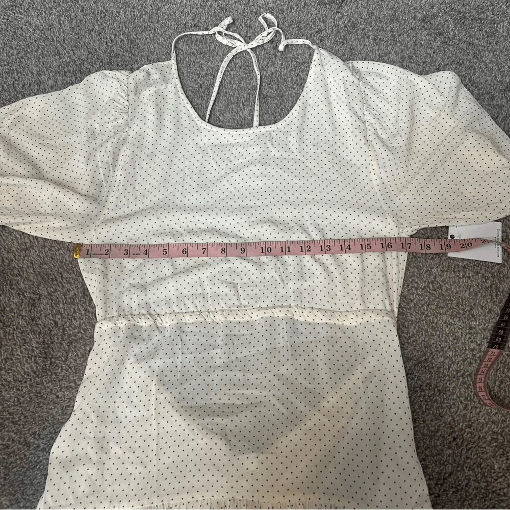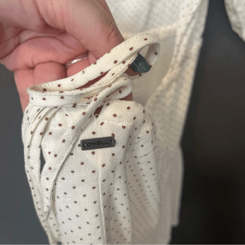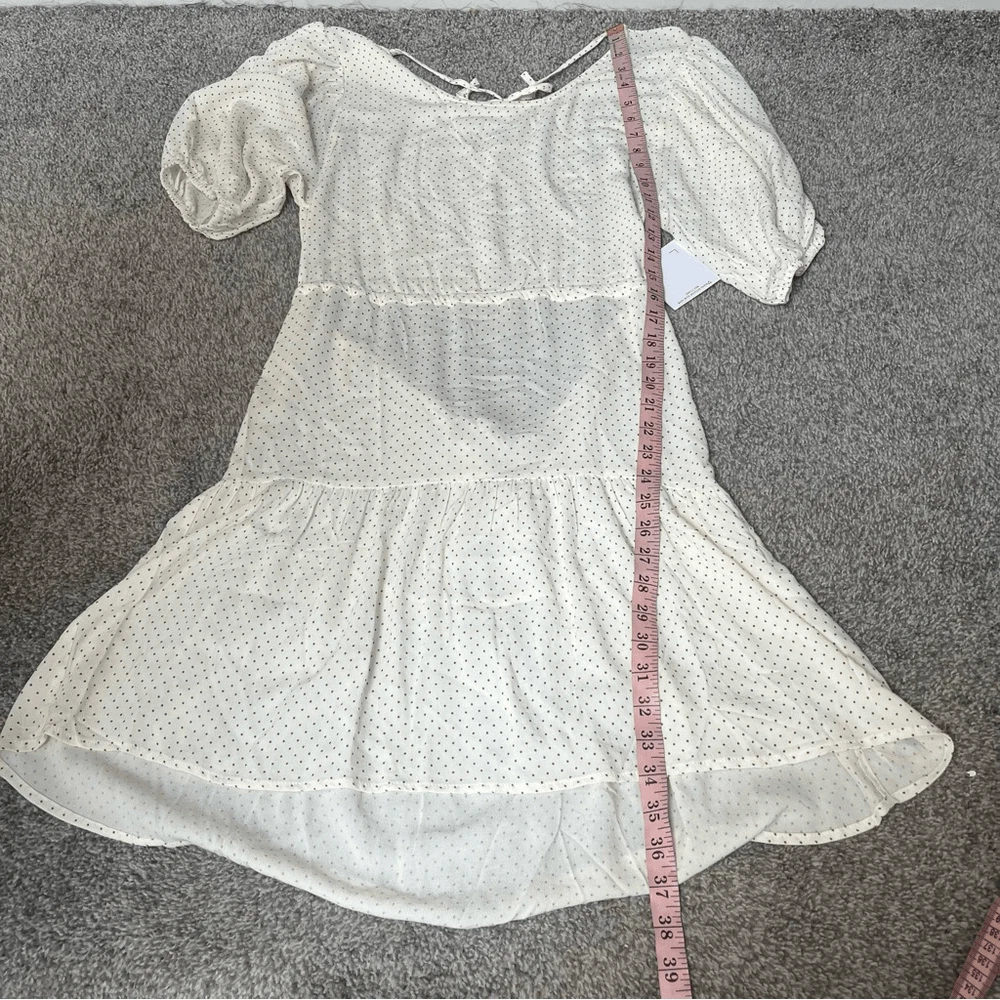 O’Neill Alta Dot Print Open Back Minidress NEW with tags Size Large Color: Winter White True to size. XS=0, S=2-4, M=6-8, L=10-12, XL=14. A perfect pin-dot print covers this chic open-back mini styled with a ruffled skirt and elbow-length puff sleeves. Jewel neck Elbow-length sleeves 95% viscose, 5% elastane DSTS