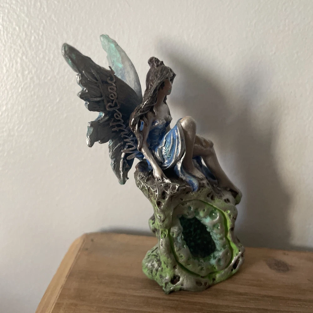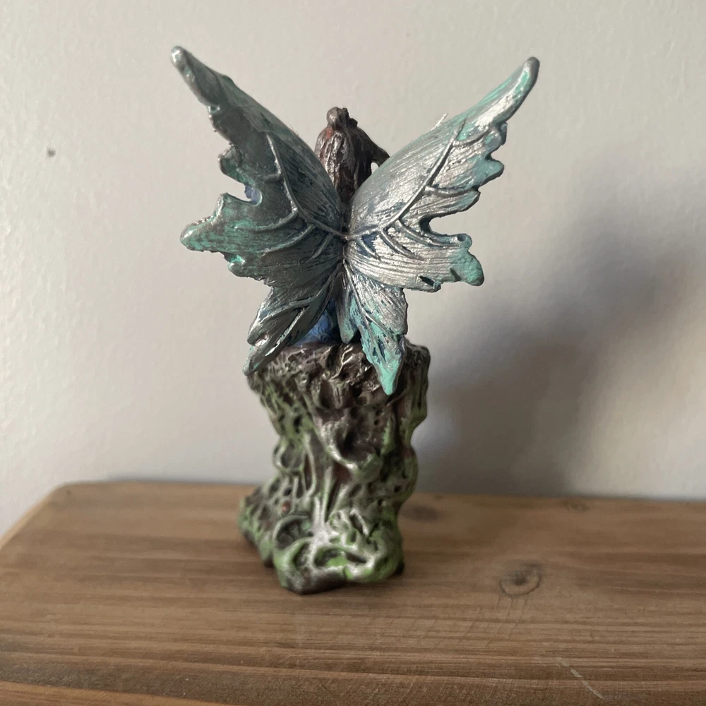 OOAK Blue Gothic Alt Dark Fairy Repaint Statue Sitting Resin Craft Ornament. Originally a Myrtle Beach souvenir fairy sculpture. Has been repainted. The Myrtle Beach sticker can be removed. The wing underneath the sticker is unpainted. The crystal in the statue is not a real crystal. Perfect for fairy collectors, fairy gardens, and home decor. Not recommended for outdoor use.