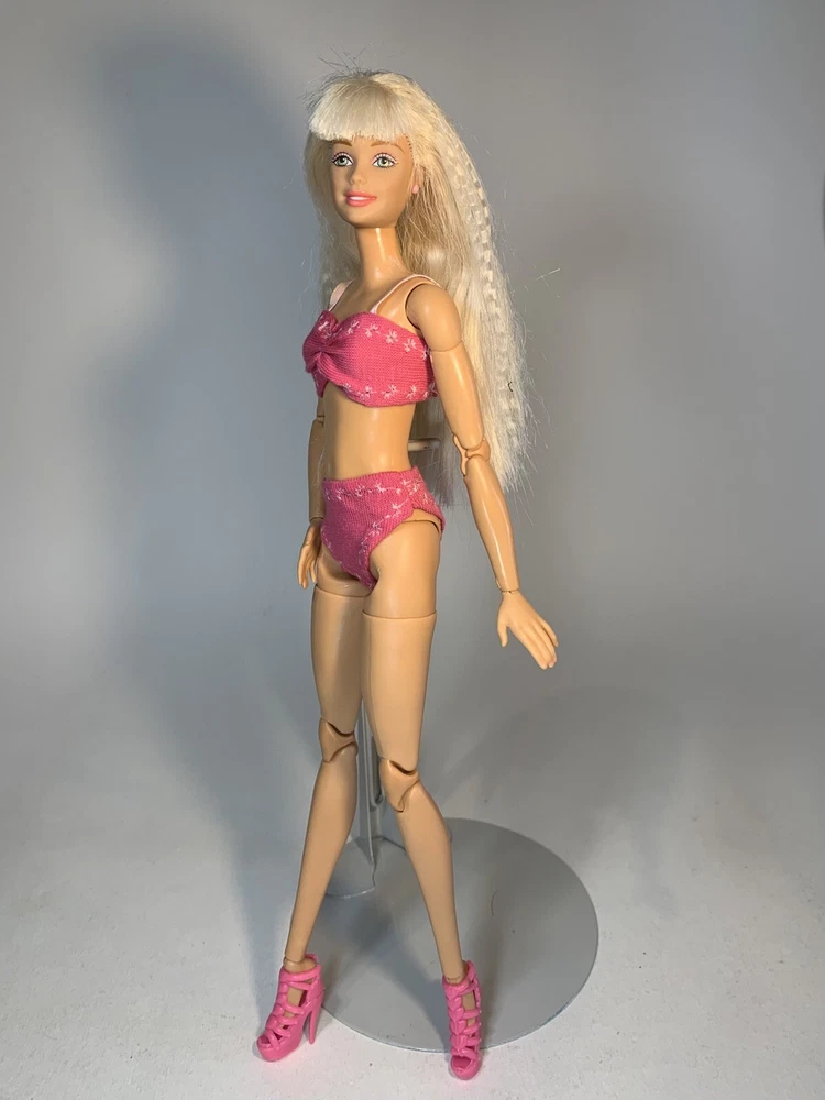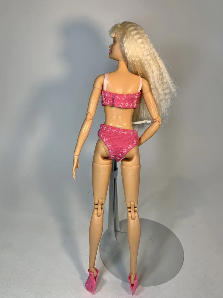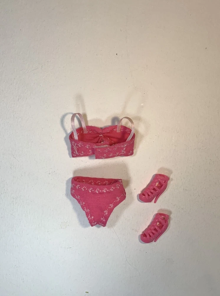 Please Note: This outfit will not fit older, larger busted Barbies. This OOAK clothing set is designed for a modern Barbie doll and includes pink bra, panties/swimsuit, shoes, and outfit. The set is tailored for a modern body-type Barbie doll and features a pink color scheme. The clothing types included are undergarments, shoes, swimwear, and nightwear, suitable for various occasions such as leisurely wear, lounging, and beachwear. Made from stretch knit cloth material, these unique pieces add a touch of individuality to your Barbie doll's wardrobe. Please note that this set does not include the doll itself.