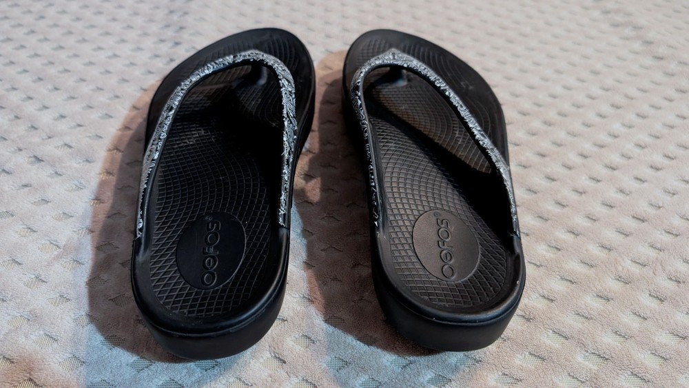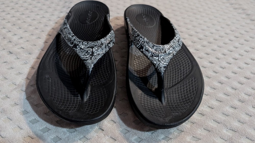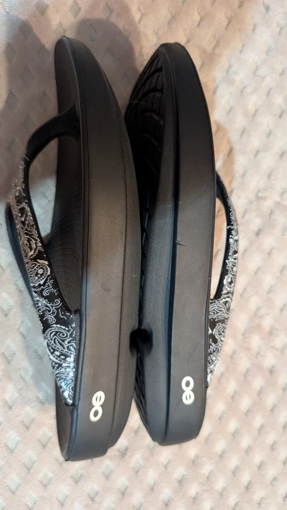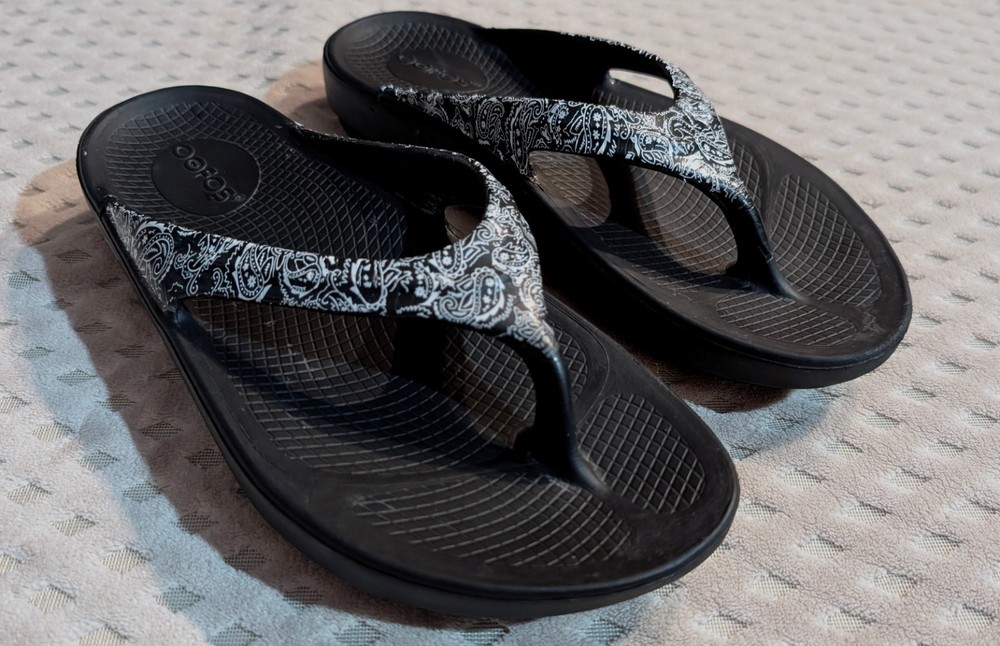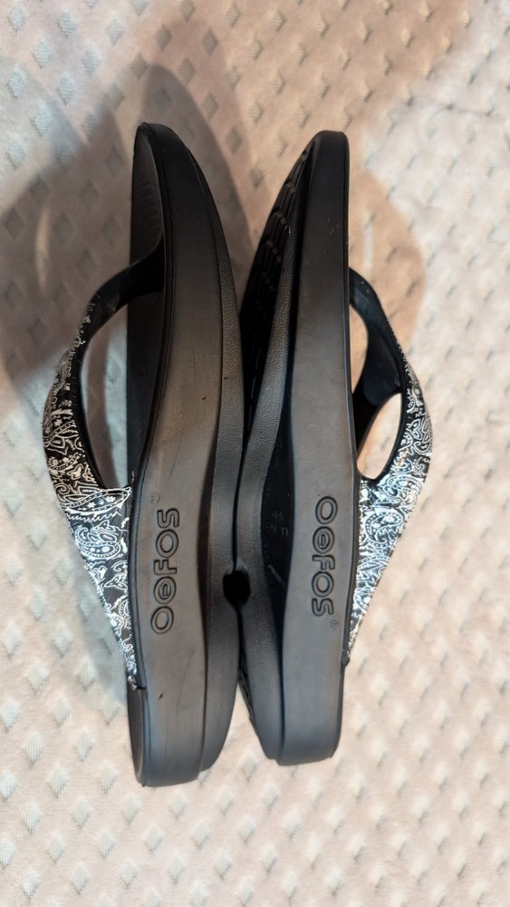 Personalize:NoSeller Notes:“Good condition, gently used with very minor wear (see photos).”AU Shoe Size:8Style:ThongModel:Oofos OolalaCustomized:NoHeel Style:FlatVintage:NoOccasion:CasualAccents:LogoEU Shoe Size:39Brand:OOFOSColor:Black and white.Department:WomenType:SandalUpper Material:Oofoam TechnologyFeatures:Breathable, Comfort, Cushioned, Waterproof, Water ResistantPattern:PaisleyProduct Line:Comfort SlideSeason:Spring, Summer, FallClosure:Slip OnShoe Width:StandardCountry of Origin:VietnamHeel Height:Low (1-1.9 in)US Shoe Size:8