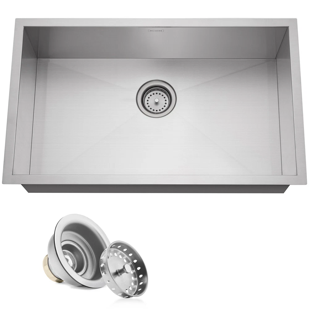 OPEN BOX - Stainless Steel Single Bowl Undermount Kitchen Sink Basin NOTICE THIS IS AN OPEN BOX DISCOUNTED ITEM. ORIGINAL CARDBOARD BOX MAY HAVE MARKS AND SCUFFS FROM PRIOR TRANSIT OR PRODUCT MAY HAVE BEEN REPACKAGED. PICTURES SHOWN ARE STOCK IMAGES OF A NEW UNIT, NOT ACTUAL PICTURES OF ITEM FOR SALE. PLEASE READ CONDITION NOTES AND DESCRIPTION OF ACTUAL ITEM FOR SALE PRIOR TO PURCHASE!!! Notes Reason for Discount: Used Open Box Item - Customer Return Functionality: Tested and working Cosmetic Condition: Used, Very Good Condition. Used product may have minor scratches, scuffs or small dents. Will be shipped in original or repackaged box. MODERN STYLING: Combining the best in function and design, this finely crafted single bowl sink features a gorgeous & durable satin-finish and precision-engineered, zero radius corners for a modern look as well as maximizing the sink work area. SUPERIOR CRAFTMANSHIP: Crafted from top-quality 18-gauge, 304 (18/10) stainless steel, this commercial-grade material provides lasting durability, which helps to maintain a beautiful appearance and lasting appeal. SUPERIOR FUNCTIONALITY: Subtle integral channels at the sink bottom help food debris flow toward the drain. ULTRA-QUIET DESIGN: Each sink is built with best of class soundproofing technology to minimize excess noise and vibration from water, garbage disposals, pots, pans and utensils. INCLUDES DRAIN: Sink includes a basket strainer drain, printed mounting instructions and an installation template. Overall dimensions (flange-to-flange): 30" wide (recommended 33" minimum sink base cabinet) x 18" front-to-back. Interior bowl dimensions: 28" wide x 16" front-to-back x 10" deep. Fast shipping! Most orders ship out the same business day by FedEx, USPS or DHL Global Mail Expedited. Our eBay Store | Terms of Sale Visit our eBay store to shop our full selection of products.
