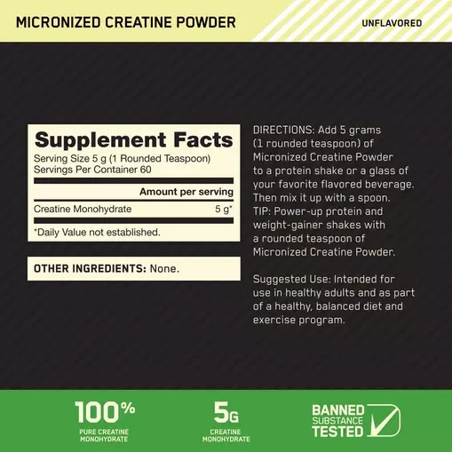 Product Overview Muscle Size, Strength & Performance Creatine monohydrate has been extensively studied and shown to help support muscle size, strength and recovery when used consistently over time in conjunction with a healthy, balanced diet and regular weight training¹. Benefits 100% Pure Creatine Monohydrate 5 Grams of Pure Creatine Monohydrate per Serving Helps Support ATP Recycling & Explosive Movements¹ ³ Micronized for easy mixing Banned Substance Tested Suggested Use Mix one rounded teaspoon of the Micronized Creatine powder into a protein shake or glass of your favorite flavored beverage. Then mix with a spoon. Intended for use in healthy adults and as part of a healthy, balanced diet and exercise program.