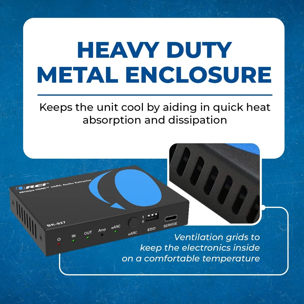 BK-927: 8K eARC HDMI Audio Extractor Dolby Atmos Key Features: HDMI 2.1 and HDCP 2.3 compliant 48Gbps FRL and 18Gbps TMDS video bandwidth Video resolutions up to 8K@60Hz 4:2:0 12bit, 4K@120Hz 4:4:4 and 2K@60Hz12bit VRR, ALLM, QMS, QFT, SBTM support HDR/10/10+, Dolby Vision, and HLG pass-through LPCM 7.1CH, Dolby TrueHD , Atmos, and DTS-HD Master, DTS:X Audio pass-through from HDMI ARC Audio Extraction from an ARC/ eARC TV Features CEC control Advanced EDID management Compact design and easy installation The BK-927 HDMI eARC Audio Extractor seamlessly extracts audio signals from your HDMI source or TV with ARC/ eARC and delivers them to your AV receiver via HDMI. Boasting support for 48Gbps video bandwidth, this device complies with both HDMI 2.1 and HDCP 2.3 standards, ensuring compatibility with your latest devices. Enjoy stunning 8K@60Hz visuals while experiencing rich, immersive audio. The BK-927 features EDID management and also supports features such as VRR, ALLM & FVA. This device bridges the gap between modern HDMI technology and your older audio amplifier, offering a simple solution for elevating your audio experience. Plus, it supports CEC control from your TV to both the source and amplifier, streamlining your home theatre setup.