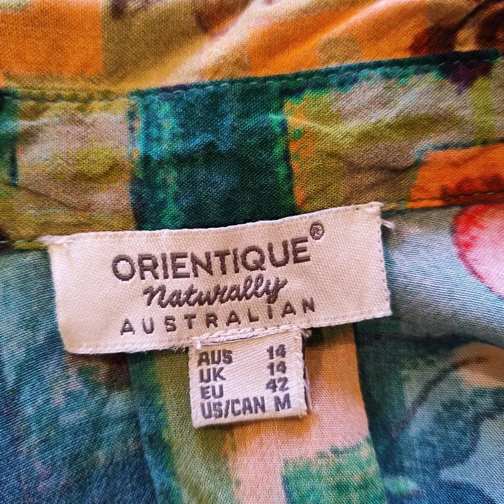 - colorful Orientique Naturally Australian button front blouse - 100% rayon, great floral print - marked as size Medium, pls see all measurements to ensure proper fit Armpit to Armpit: 21" flat, 42" around Shoulders: 16.5" seam to seam Sleeves: 22" from shoulder seam Length: 28" top shoulder to bottom front CONDITION: In VG preowned condition with no stains or damage. Pls. see provided pics. SHIPPING : Tracked and insured shipping. US orders ship via USPS Canada shipping by Canada Post.