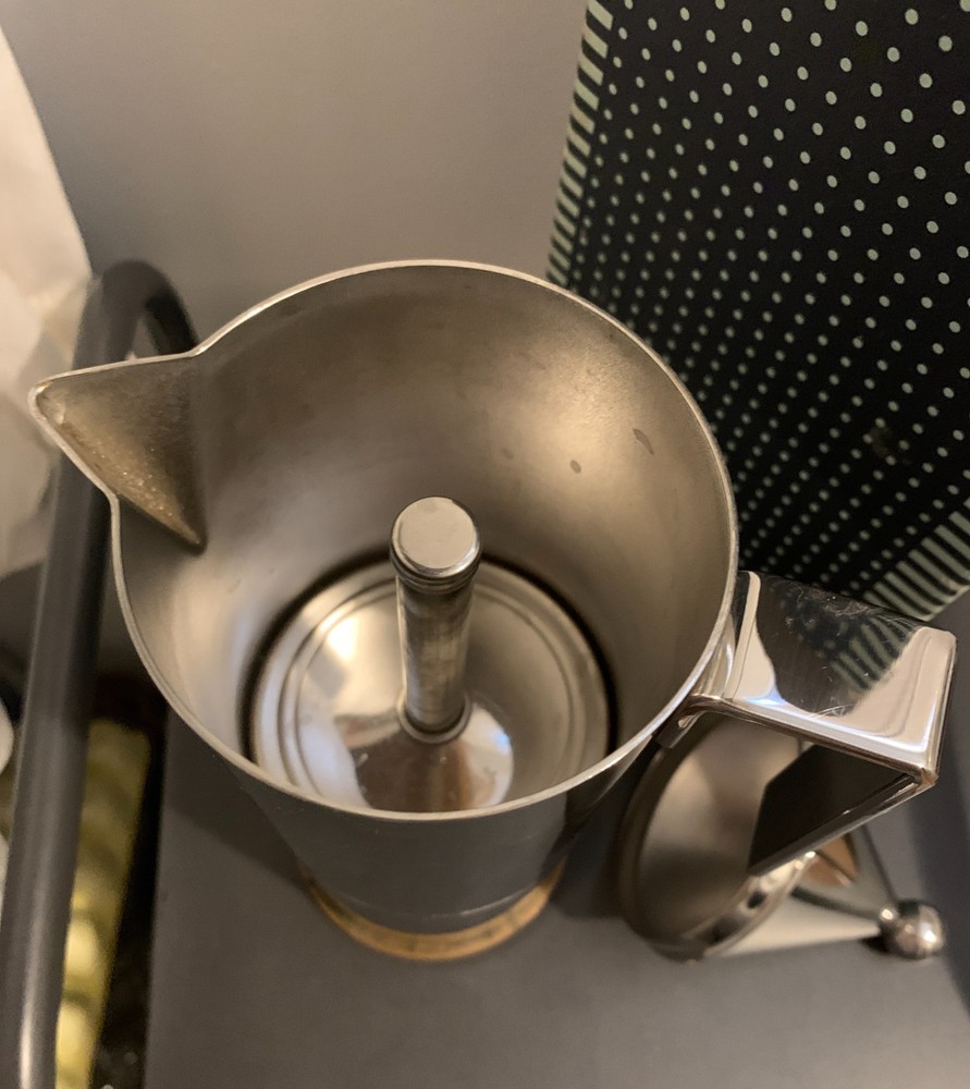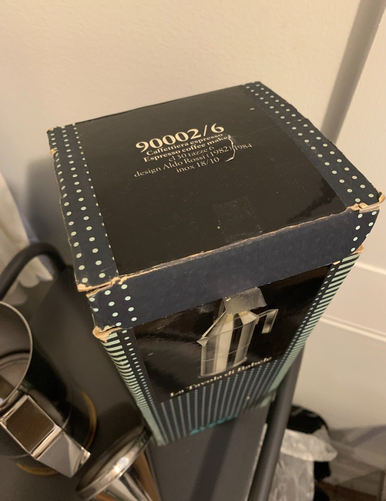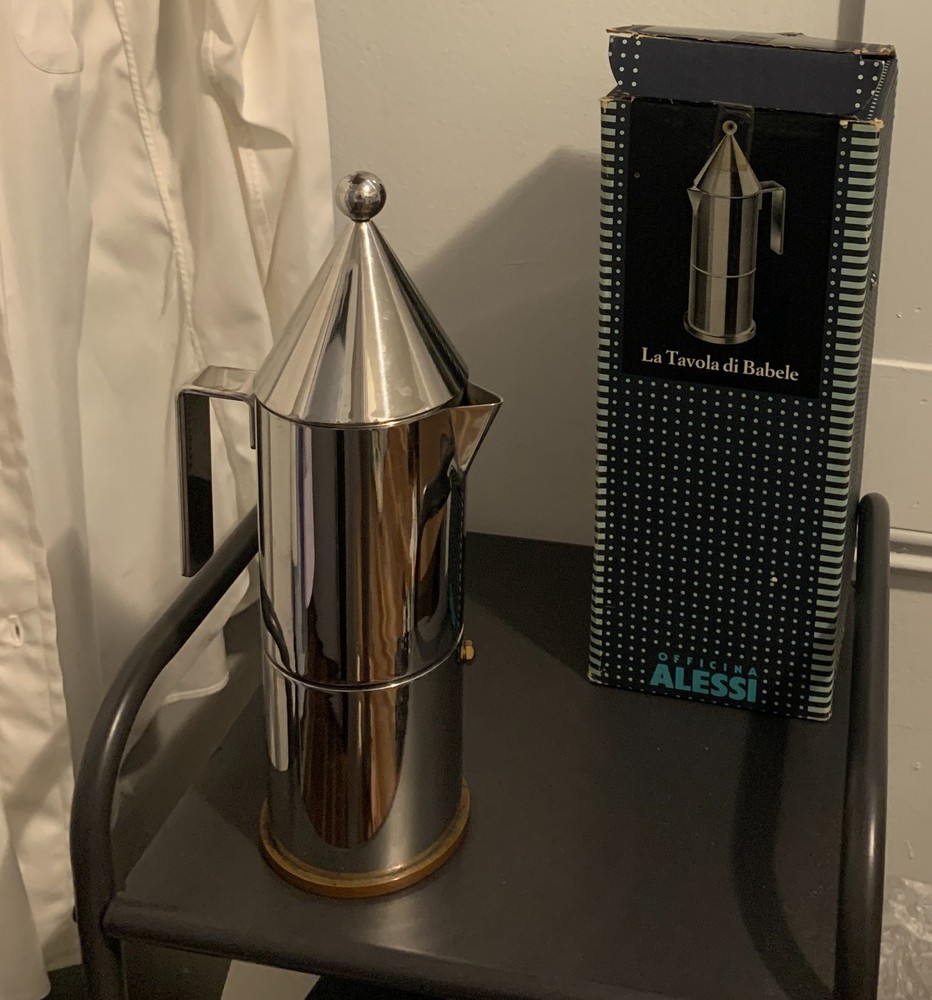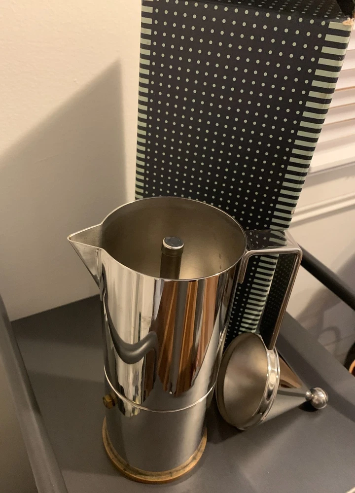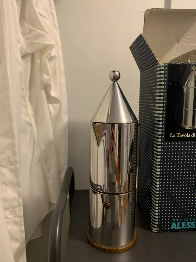 ORIGINAL Alessi La Conica by Aldo Rossi, Italian Stainless Steel Espresso Maker Designed in 1983 by legendary Italian architect Aldo Rossi and manufactured in 1984, this art piece and coffee maker is exceedingly rare and with few surviving examples - especially not with the original box, never used. A few are in museums in varying condition, and a smaller version is being sold from Japan; you'd be hard-pressed to find another from this era! A perfect example of postmodernism object design, utilizing simple geometric shapes and the beauty of polished metal to create a coffee maker that compels the eye to look at it. The body is 18/10 stainless steel, and the bottom plate is copper for even heat conduction on the stovetop - an entirely different league from Moka pots. Brews 6 cups of "espresso" (being that this method probably does not generate enough pressure), compared to other smaller models. Hailing from the "experimental and artistic" sub-brand of Alessi (Officina de Alessi) and the product line "La Tavola di Babele" for stainless steel kitchen tools designed by Aldo Rossi, this artifact of interior design set the tone for the later models of Alessi coffee makers; La Conica espresso makers are still sold today at this same price point, but this model is of the original release. A perfect gift for another architect, or anyone with an eye for design. Function and beauty. Note the box has a bit of damage from over the years, from where the tip of the coffee maker and the handle poked against the cardboard. However, there is not a scratch or dent on the item itself. More photos on request, but I prefer to handle it minimally. I'm uncertain if the original papers are inside, as I did not want to poke around in it and misplace the nice interior packing. Dimensions: Roughly 3.5" x 5" x 11" Please see all images, what you see is what you purchase! Please reach out to me before you leave any negative feedback. Any major flaws, if any, will be noted in the photos. I've included most points of authentication, and can take more photos on request. ALL SALES FINAL Please carefully review your order before confirming your purchase.