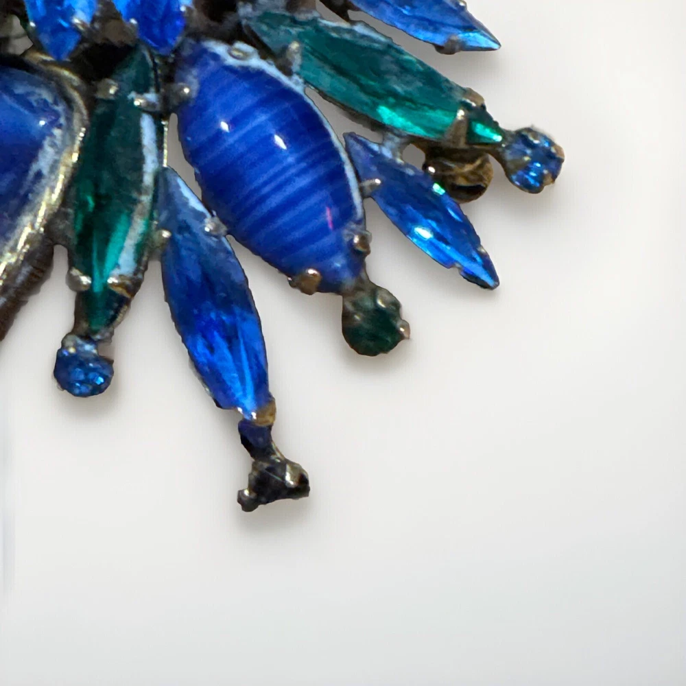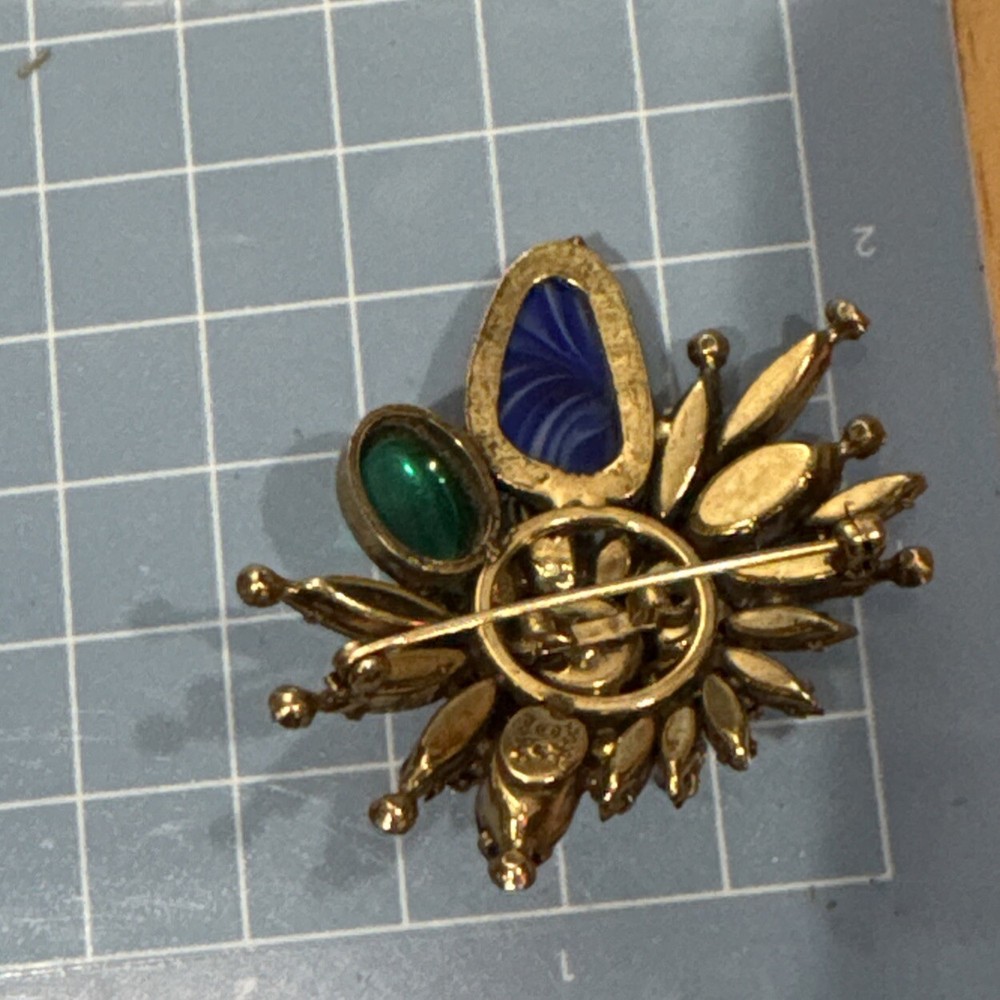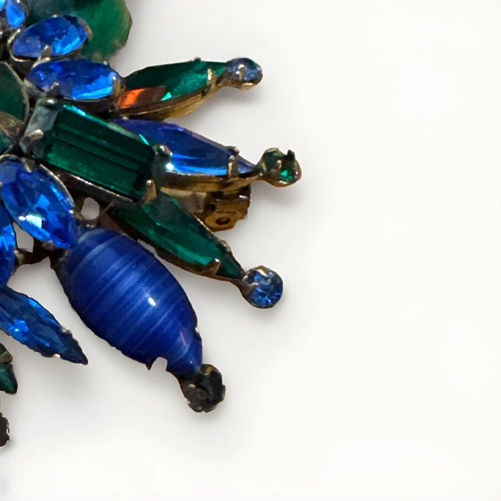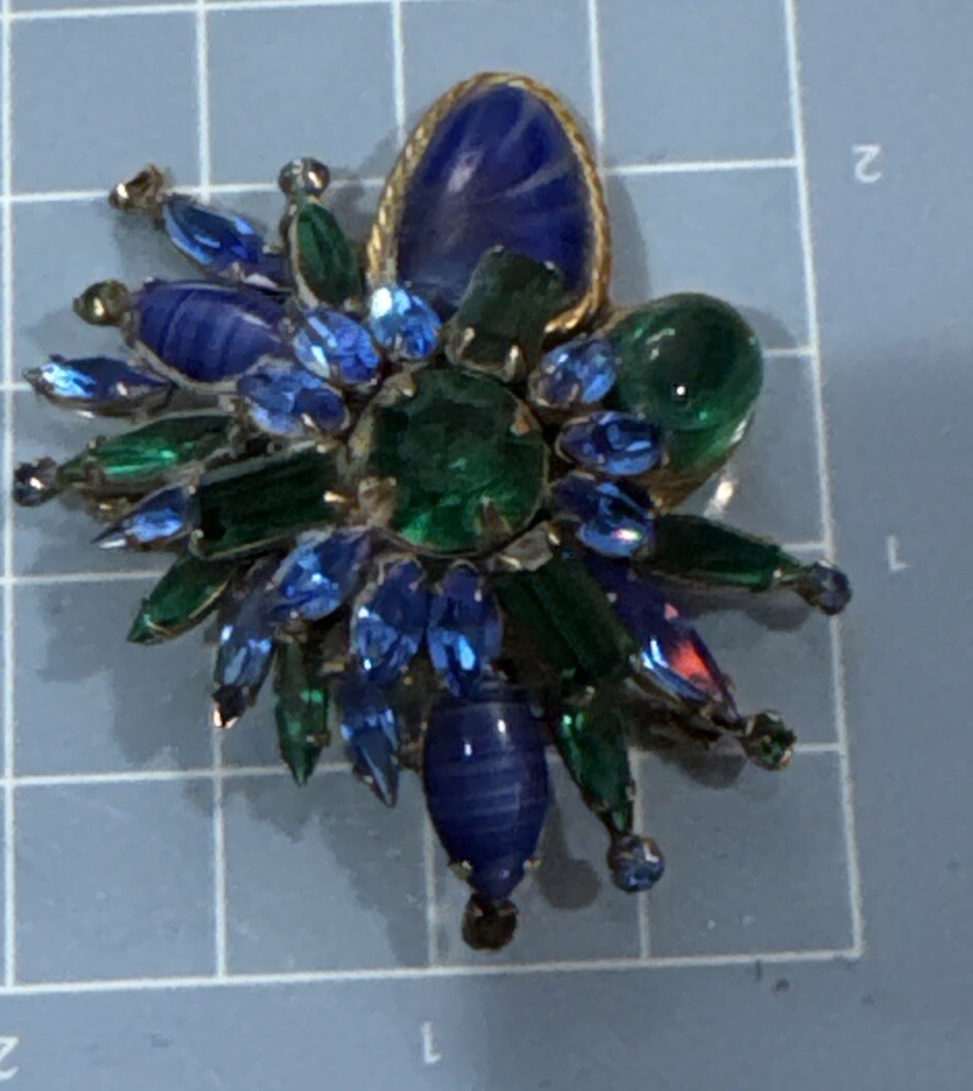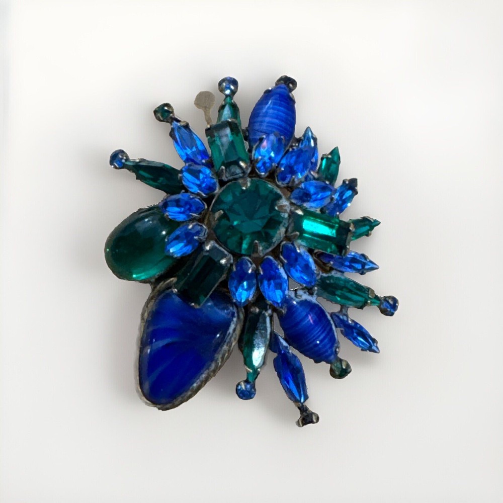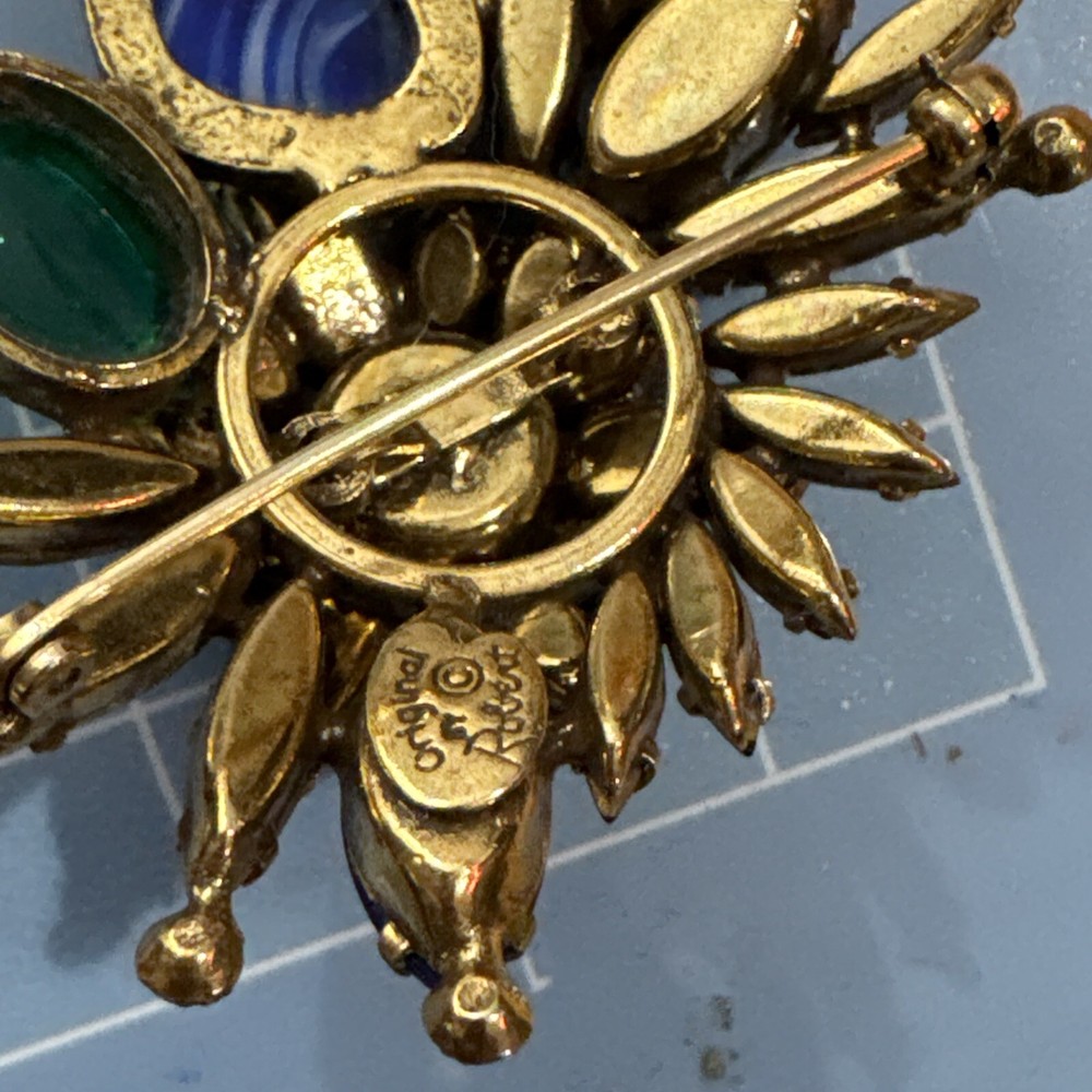 Elevate your jewelry collection with the ORIGINAL BY ROBERT Massive Blue & Green Glass Vintage Pin Brooch. This exquisite piece showcases an impeccable blend of color with its striking blue and green glass stones. Its substantial size and intricate design make it a standout accessory, perfect for adding a touch of elegance to any outfit. Crafted with care, this original vintage brooch is a testament to timeless style and quality. Whether you're commemorating a special occasion or simply treating yourself, this piece is versatile enough for any event. Signed by the renowned brand Robert, it's a collection-worthy item that promises to be a cherished heirloom. *****See pictures missing 2 stones.
