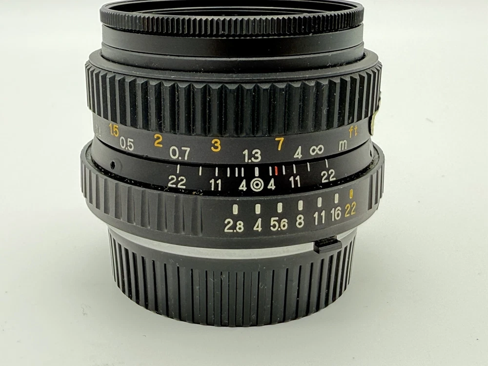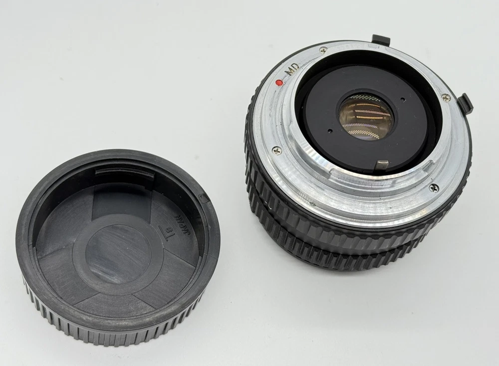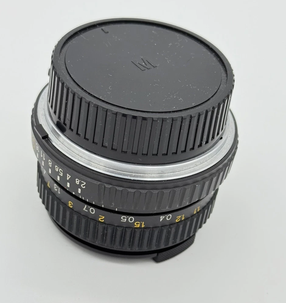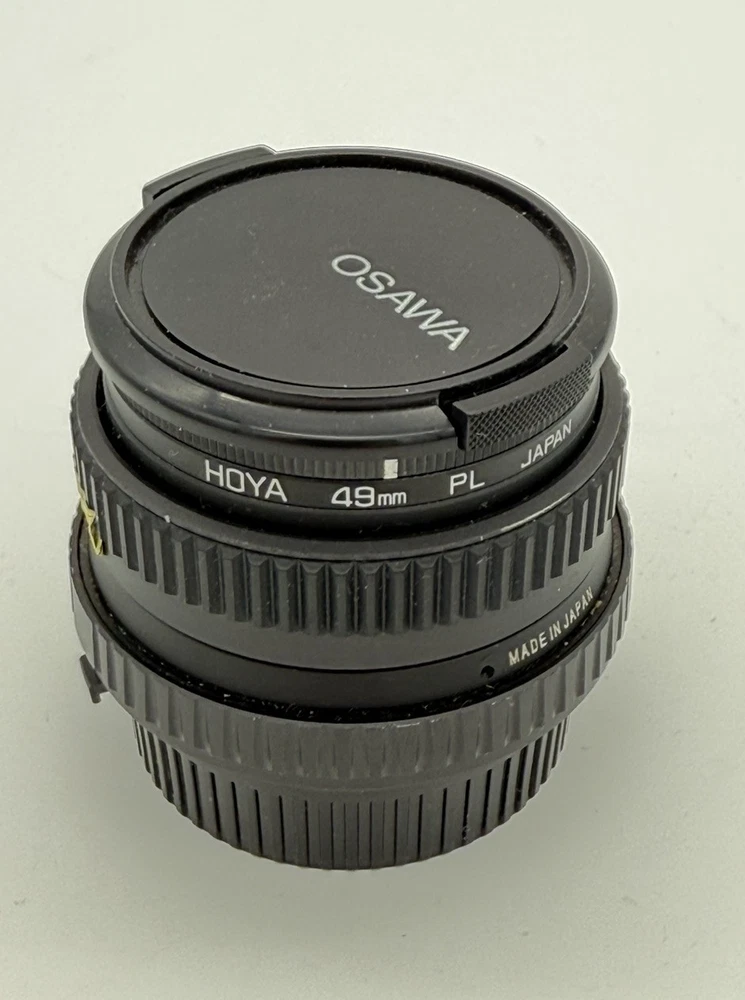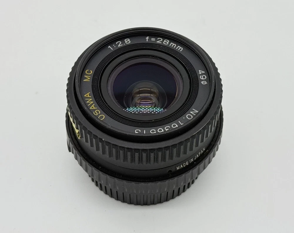 The product is an Osawa 28mm f/2.8 MC wide angle lens for Minolta cameras. It comes with a Hoya PL polarizer filter, has a manual focus type, and features an aluminum exterior. The lens has a M Mount and a focal length of 28mm. It is made in Japan and includes a 49mm compatible filter size. Comes with both lens caps. Lens appears clear with no blemishes. Aperture opens and closes as it should