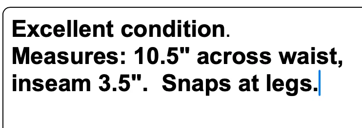 Excellent condition . Measures: 10.5" across waist, inseam 3.5". Snaps at legs. THANK YOU EBAY!!! We are so thankful for our customers! We have thousands of listings, and therefore receive hundreds of messages, every single day. So, if you are asking about a price drop, or a shipping price drop, or asking for extra measurements, or to add additional photos, please allow me to answer you here, No thanks. If your question is not one of those questions, we will be happy to answer you individually. YES...WE DO COMBINE DOMESTIC SHIPPING. Extra jewelry items ship for $2 each (except for large jewelry lots). We will refund the difference as we are mailing out.....we hope you enjoy shopping with us! We encourage you to read the description and check all photos.