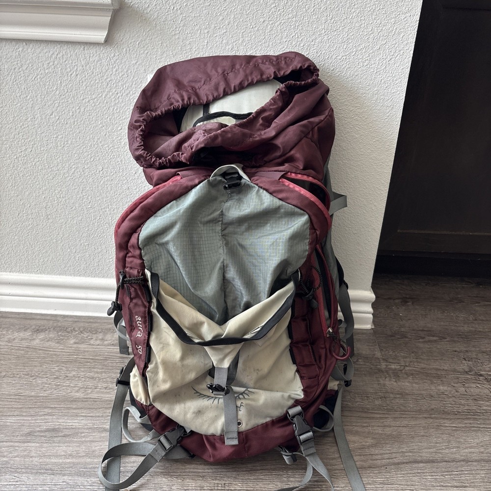 This OSPREY AURA 50 Hiking / Trail Backing - Women’s Large - Burgundy Red is pre-owned and does show signs of wear and tear but can still be used for your next adventure! Pictures show holes in waste strap pockets and other signs of wear and tear. Look at the pictures and please reach out if you have any questions.