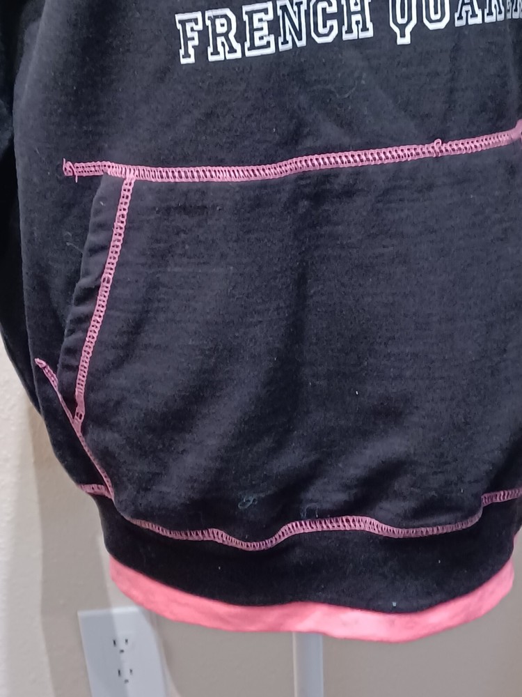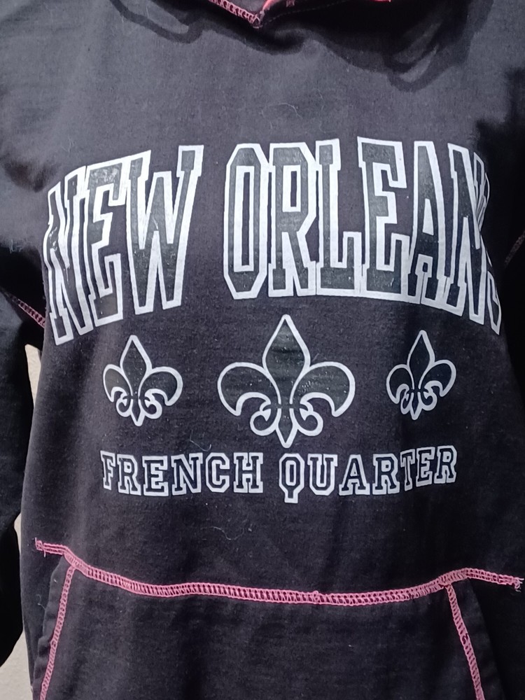 This OT Women's Super Heavy Black New Orleans Hoodie is the perfect addition to your wardrobe. It features a pullover closure and V-neckline, making it ideal for travel, activewear, and casual occasions. The hoodie is made of a cotton blend fabric that is easy to care for and machine washable. The hoodie has a solid pattern and an elastic waist with a front kangaroo pocket for added convenience. It also features a graphic print of the French Quarters it a great choice for fans of the city. The hoodie is available in size XL and has a relaxed fit. It is perfect for winter, fall, and spring seasons and can be worn for various activities such as riding, walking, cycling, school, hiking, and running & jogging. Great condition.