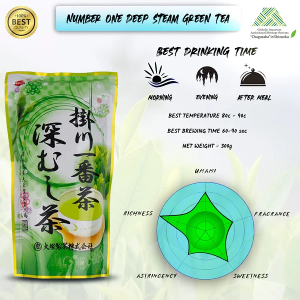 OTSUKA GREEN TEA Co., Ltd Japanese Kakegawa Tea Deep Steamed Tea Fukamushi 300g Japanese Tea Otsuka Green Tea Kakegawa Tea Deep Steamed Tea 300g offers a premium quality green tea experience. 🍵 Made in Japan 🍵 Kakegawa, Shizuoka, Japan 🍵 Deep Steamed Tea Fukamushi Tea 300g Product name: Japanese Tea Otsuka Green Tea Kakegawa Tea Deep Steamed Tea 300g ・Brand: Otsuka Green Tea Co., Ltd ・Net weight: 300g ・Ingredients: Green tea Kakegawa Fukamushi Green Tea is a premium Japanese green tea made from carefully selected tea leaves grown in the pristine highlands of Kakegawa. The steamed at high temperature process locks in the tea's natural sweetness and umami, creating a rich and complex flavor profile. How to Use: Place 1 teaspoon of tea leaves in a teapot. Add 200ml of hot water to the teapot. Steep for 30 seconds to 1 minute. Enjoy your tea. Benefits: Kakegawa Fukamushi Green Tea is packed with antioxidants, helping to protect the body from free radicals. It also helps reduce stress, improve memory, and boost the immune system. Product Description Deep Steam Fukamusi Sencha Green Tea 300g Kakegawa Fukamushi Sencha Green Tea Kakegawa Fukamushi Sencha is a type of green tea that originates from the Kakegawa region in Shizuoka Prefecture, Japan. It is a high-quality, steamed green tea that undergoes a longer steaming process compared to regular sencha, resulting in finer tea leaves and a more intense flavor. The term "Fukamushi" translates to "deep steaming" in English, referring to the extended steaming time that the tea leaves undergo during processing. This extra steaming time breaks down the tea leaves, resulting in smaller particles and a richer, vibrant green color. It also brings out a unique, full-bodied flavor and aroma. Kakegawa Fukamushi Sencha is known for its distinct characteristics. The brewed tea has a vibrant green color and a rich, vegetal aroma. It offers a smooth and full-bodied taste with a slight sweetness and a refreshing, grassy aftertaste. The deep steaming process also reduces the tea's astringency, making it smoother and more mellow compared to other sencha varieties. Kakegawa Loose Leaf Sencha is a high-quality green tea originating from the Kakegawa region of Shizuoka Prefecture, Japan. It is known for its vibrant green color, delicate aroma, and exceptional taste. Here's a description of Kakegawa Loose Leaf Sencha: Appearance: The loose leaf sencha consists of finely plucked tea leaves. They have a bright, vivid green color, indicating their freshness and quality. The leaves may appear smaller and more fragmented due to the deep steaming process they undergo. Aroma: When brewed, Kakegawa Loose Leaf Sencha emits a captivating aroma. It is a delightful combination of fresh vegetation, reminiscent of grass and greenery. The aroma is inviting and provides a preview of the tea's flavors. Flavor Profile: This sencha offers a distinctive and memorable flavor. It has a smooth and velvety texture, accompanied by a delicate sweetness that lingers on the palate. The taste is refreshingly grassy, with subtle hints of umami, providing a well-rounded and balanced tea experience. To make Kakegawa Fukamushi Sencha, you can follow these steps: Gather your ingredients and equipment: You will need Kakegawa Fukamushi Sencha loose leaf tea, filtered water, a teapot or teacup with a strainer, and a tea kettle or a pot to heat the water. Boil water: Heat the water to a temperature of around 70-80°C (158-176°F). You can achieve this by bringing the water to a boil and then allowing it to cool for a few minutes. The slightly lower temperature helps prevent the tea from becoming too bitter. Measure the tea: Use approximately 2-3 grams of Kakegawa Fukamushi Sencha tea per 8 ounces (240 ml) of water. Adjust the amount based on your preference for a stronger or milder brew. Preheat your teapot or teacup: Pour a small amount of hot water into your teapot or teacup to warm it up. Swirl the water around and then discard it. Add the tea: Place the measured tea leaves into the teapot or teacup. Pour the hot water: Slowly pour the hot water over the tea leaves. Ensure that all the leaves are submerged in the water. Steep the tea: Let the tea steep for approximately 1-2 minutes. Steeping time can be adjusted to your taste preference. Steeping for a shorter time will yield a milder flavor, while a longer steeping time will result in a stronger and more robust brew. Strain and serve: After the desired steeping time, pour the brewed tea through a strainer into your teacup or serving vessel to remove the tea leaves. This step prevents oversteeping and ensures a smooth cup of tea. Enjoy: Savor the flavors and aromas of Kakegawa Fukamushi Sencha. You can drink it plain or with a touch of honey or lemon, according to your preference.