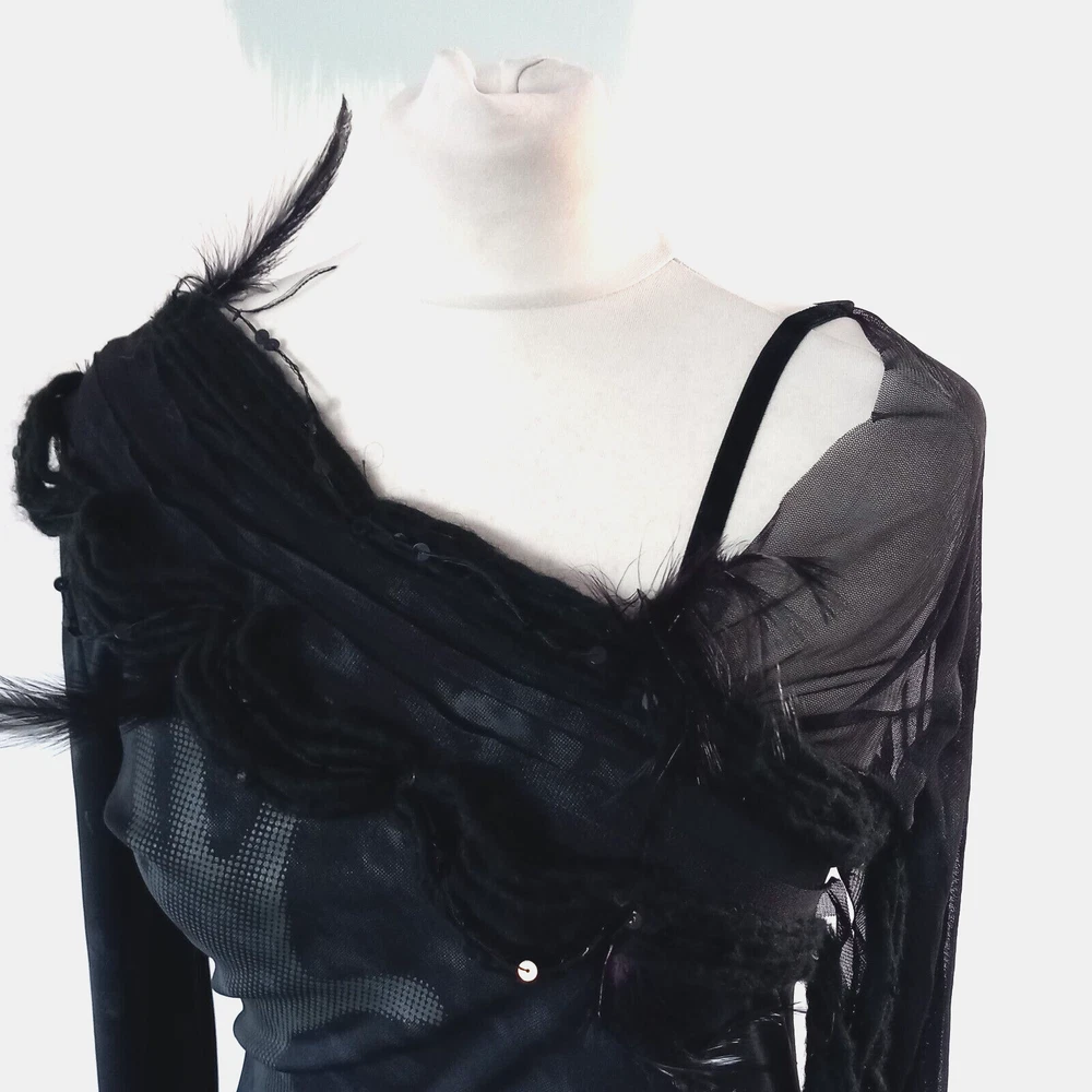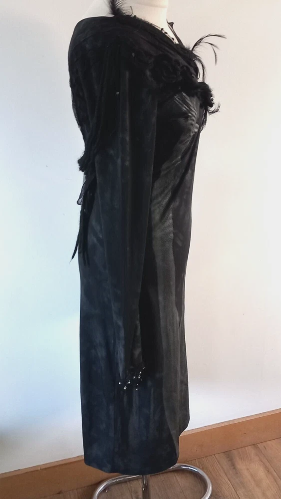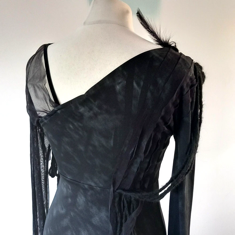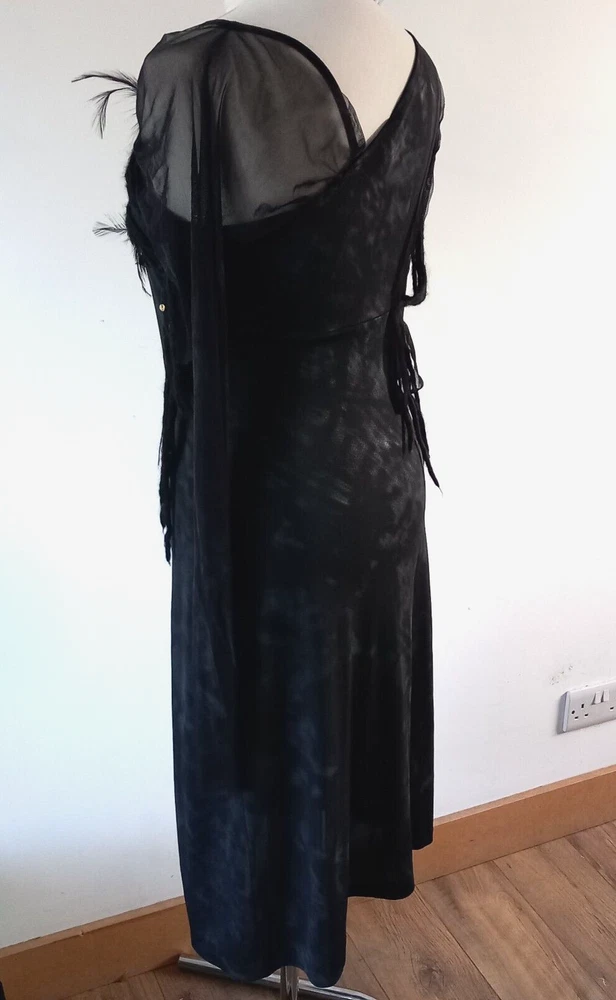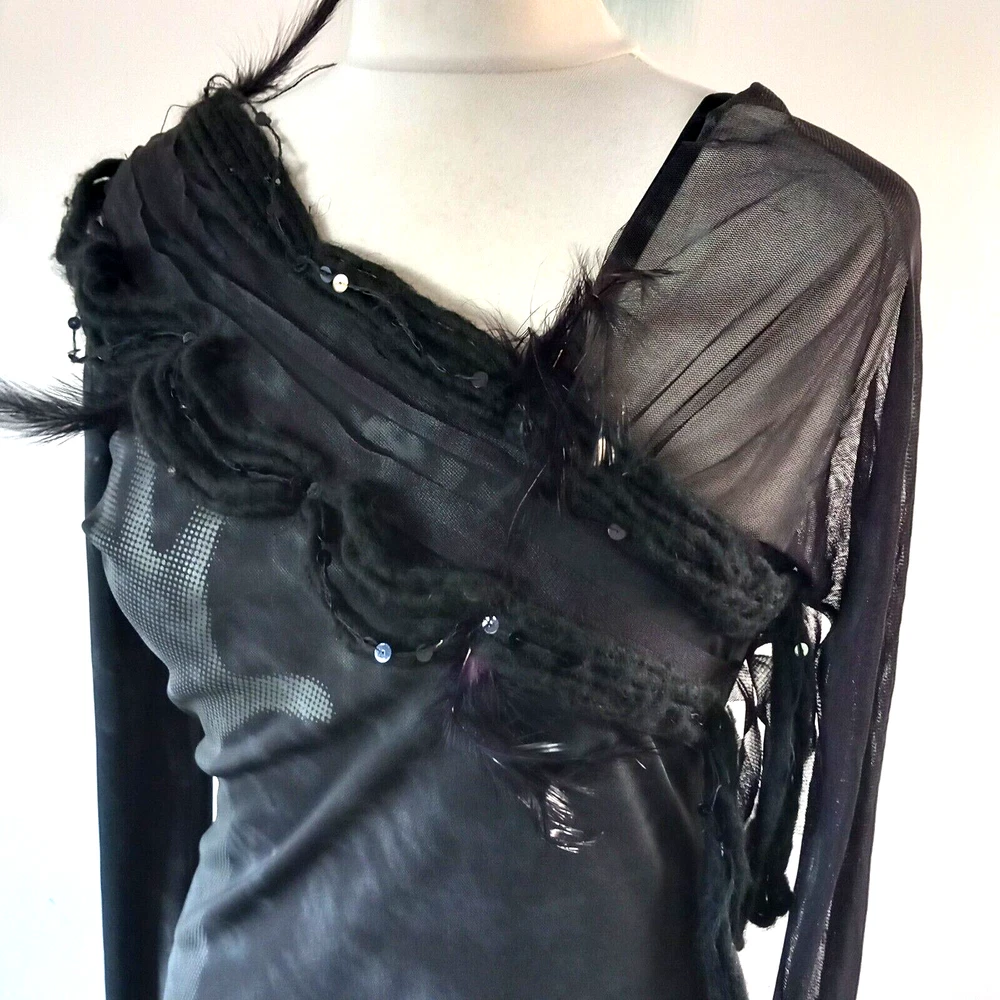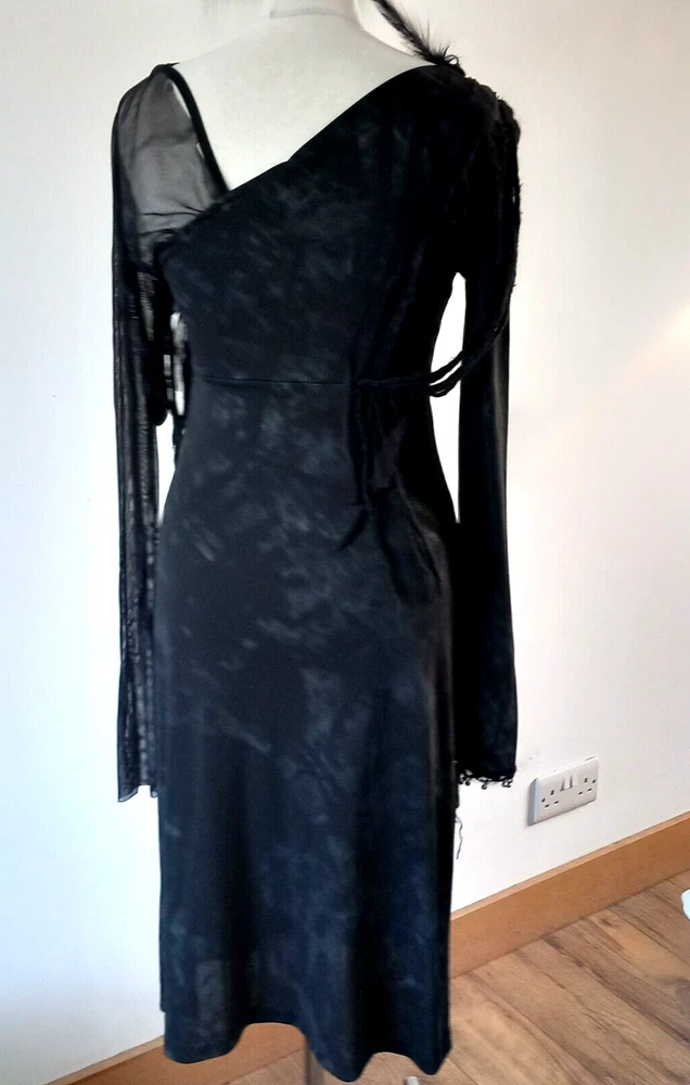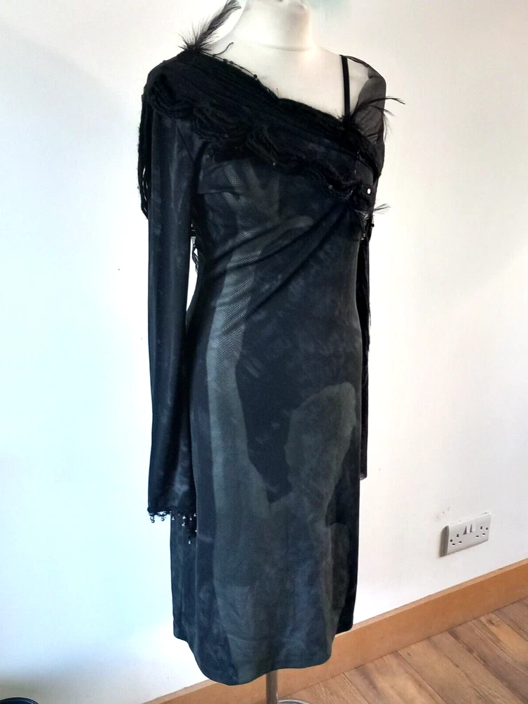Good used condition with no faults found. Unusual quirky black figure hugging dress with unique embellishments - see the pics! Will look utterly glamorous with a goth edge. Measures 18" pit to pit, 15" across waist area approx, 19" across hip area approx, appears to have a person on the front! Length nape to hem 38". Feathers, wool, beads, all sorts going on here. Sleeve 27". 100% polyester, made in Italy.