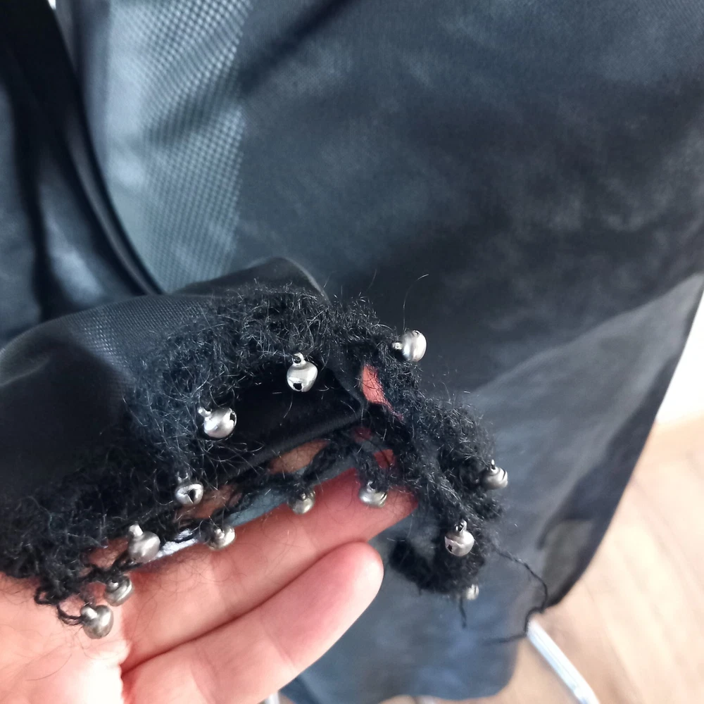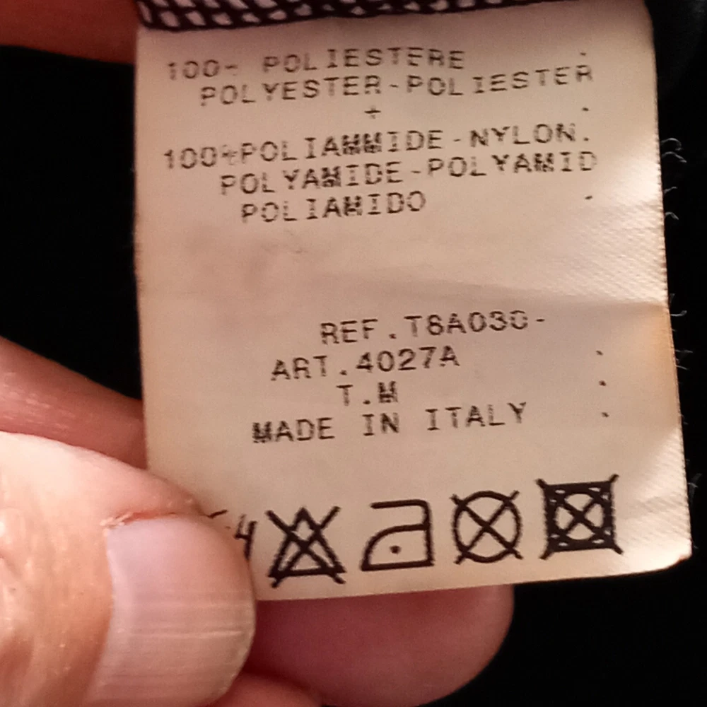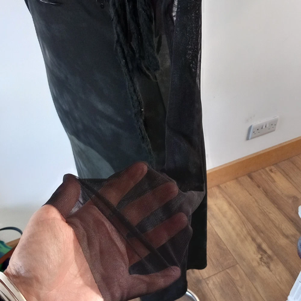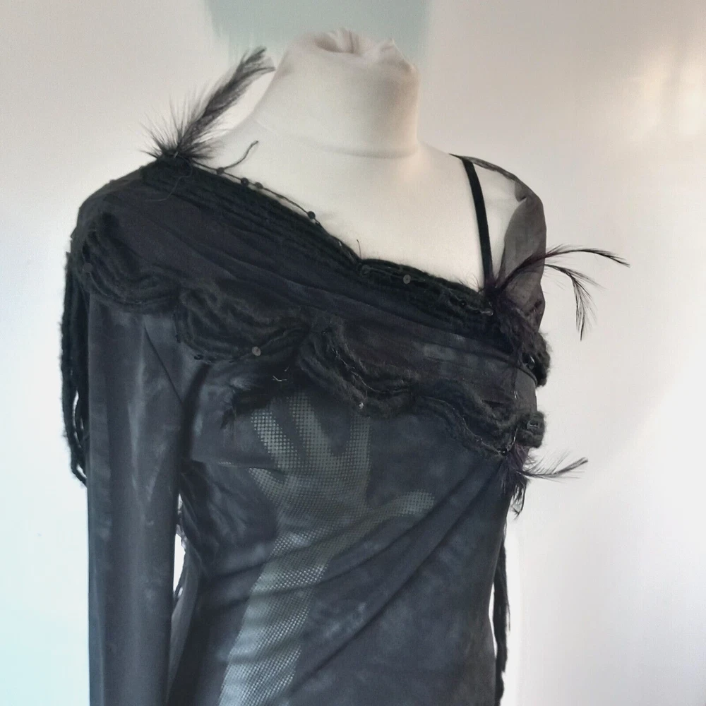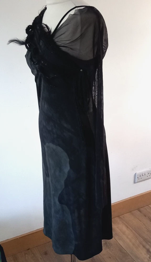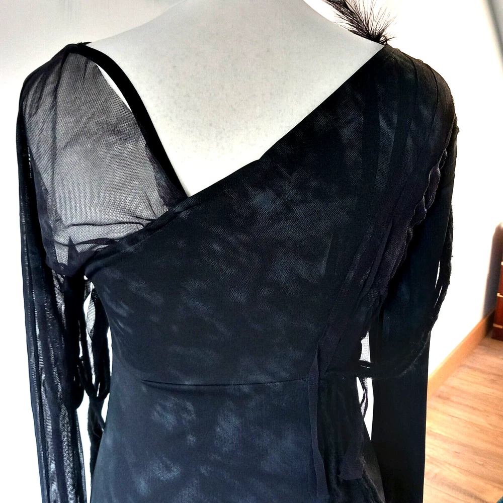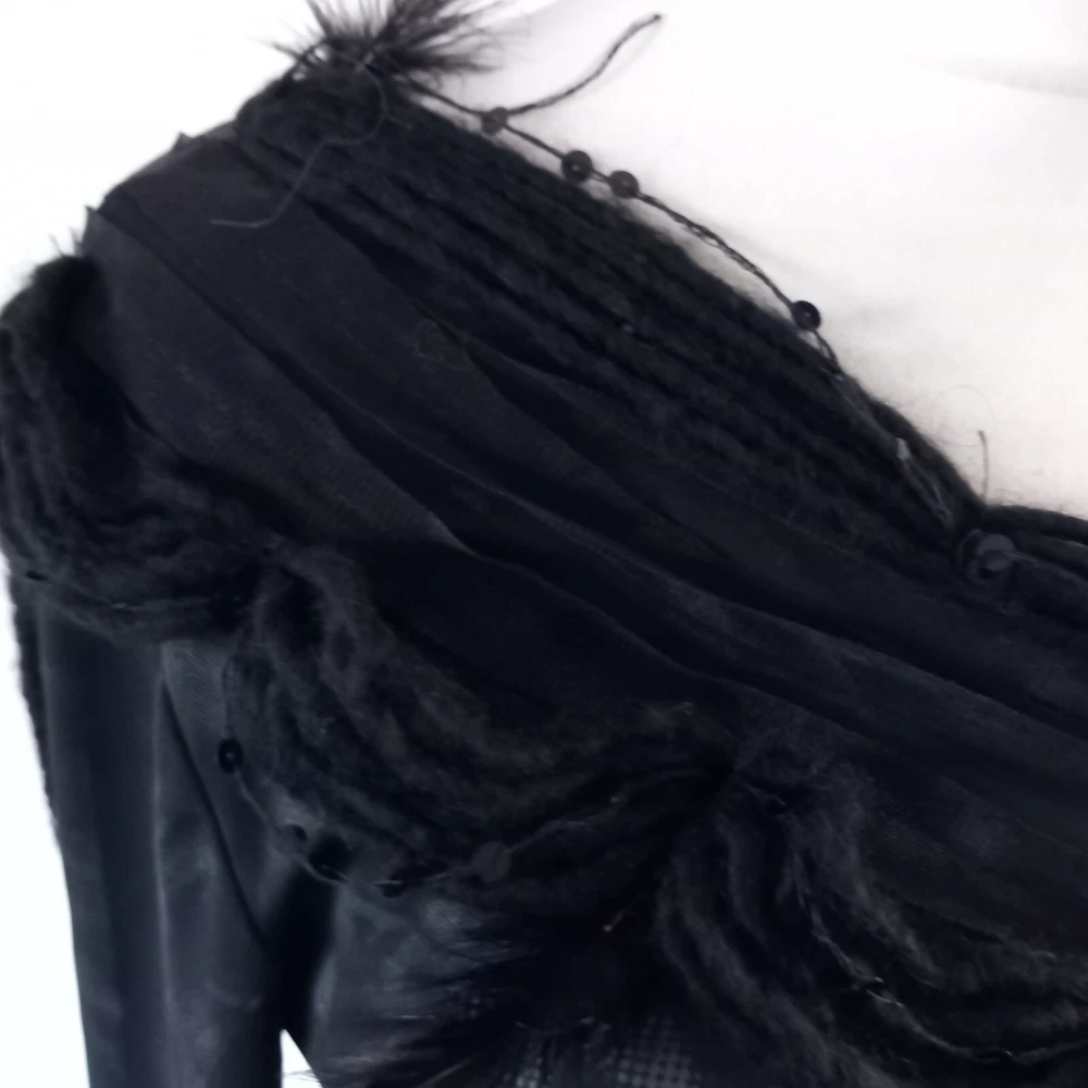 Good used condition with no faults found. Unusual quirky black figure hugging dress with unique embellishments - see the pics! Will look utterly glamorous with a goth edge. Measures 18" pit to pit, 15" across waist area approx, 19" across hip area approx, appears to have a person on the front! Length nape to hem 38". Feathers, wool, beads, all sorts going on here. Sleeve 27". 100% polyester, made in Italy.