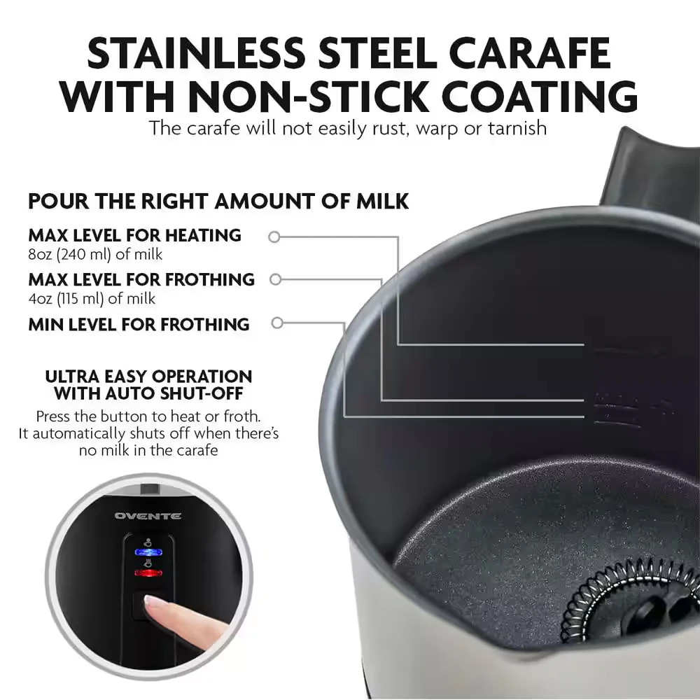 HOME Feedback Save Seller Newsletter Contact us 8.1 Oz. Black Stainless Steel Electric Milk Frother 3 in 1-Warming, Heating and Frothing, See through Lid Description Style Your Beverage with Special Sweet Touch and Drink with Gusto Every Day!It is not a secret that coffee is an essential starter that we need to boost our day, but we all know every individual has a different taste that sometimes can be hard to please. No need to worry! Our high-performance Ovente Electric Milk Frother FR1208 Series is a great maker of a smooth, frothier and velvety cream. Having this multifunctional and super useful tool within reach in your kitchen counter is a must. Making delicious Cappuccinos, Macchiatos, Double Espresso, Golden Milk Lattes, Iced Mocha, Hot Chocolate Milk and Flat White is easy like doesn't love fabulous and yummy frothed milk on top? Be your own barista and be creative in serving a variety of drinks today. Put your ideas into action, surprise your family and friends with the highest flavor drinks they like. Delight your guest in a party or office a cup of drink with professional finishing. Comes with a 1-year warranty Stainless steel carafe is double wall insulated and non-stick Auto shut-off feature turns the device off when carafe is empty Appliance Series Not Applicable Appliance Type Milk Frother Capacity (fl oz) 8 Certifications and Listings Certified Listed Coffee Appliance Type Pour Over Color/Finish Black Color/Finish Family Black Commercial Use Residential Commercial/Residential Residential Features Automatic Shut-Off,Cord Storage Manufacturer Warranty 1 Year Limited Warranty at .com Material Stainless Steel Returnable 30-Day Small Appliances Color Family Black Small Electric Product Type Milk Frother Style Modern Wattage (W) 500 W Payment PayPal is our preferred method of payment. If you do not have a PayPal account, all major credit cards are gladly accepted through PayPal as the payment processor. PayPal offers great buyer and seller protection. Your order will be processed pending receipt of cleared payment through PayPal. Sales tax may be charged depending on your location. Shipping We provide Free and Fast shipping. Most items are shipped within 3 business days of receiving cleared payment. We ship to the lower 48 contiguous United States only. We do not ship to P.O. boxes or APOs. We are always working hard to ensure your package arrives as soon as possible. Please understand that some factors like weather, high postal traffic, and the performance of shipping companies are outside of our control. (We ship the product from multiple warehouses). Returns We offer a 30-day return/exchange policy for most of our products. You can request a refund if you are dissatisfied for any reason with your product. (Restocking Fee May Apply). Only factory defects are accepted as a reason for a return. In the case of factory defects, if available, we will replace the product for you. When returning an item, it must be in all of the original packaging and include all of the original accessories or items that came with it. The item and package should be in original and perfect condition. All returns MUST be done within 30 days of the date of purchase. Please note that we cannot give refunds or replacements after the 30-day limit has expired. We are extremely fair, and in the rare event of something out of the ordinary happening with our products or shipping, we will gladly work with you to find a fair resolution. Feedback Feedback on eBay is a very important part of our Business as it is the feedback that we receive from our customer which shows any potential new customer that we are a trusted, friendly, efficient and proactive company. If for any reason you are not happy with your experience with angu_market contact us and there is not issue large or small that we cannot try and resolve. We are all human and can make a mistake but it is how you fix that mistake that counts. Please give us that chance to sort it out before leaving a negative feedback. If you do not contact us about any issues you have we cannot resolve it. Please leave us positive feedback and all "5's" on the DSR, if you are happy with our service and product as this is what improves all Ebay sellers to provide the experience that all buyers want. Contact Us Click here to Contact Us 8634548