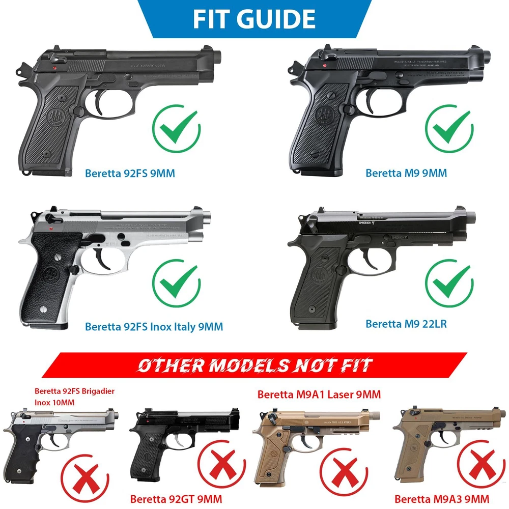 【HOLSTER FIT GUIDE】 Outside the Waistband Holster Custom Molded Fit for Beretta 92 FS 92FS Inox /Compact 92S Full Size/Compact/Centurion M9 M9_22 92G ELITE LTT /Centurion /Compact Taurus PT92 pistol. Notice: This tactical holster can't fit with pistols with laser or sight. (Check the second chart details please) 【LEVEL Ⅱ RETENTION】 Auto locking system achieves an audible click when you holster the weapon, which can secure your weapon inside this OWB holster to ensure ultimate safety. It is designed to be quickly drawn and re-holstered for easier access by pressing release button with your forefinger whenever needed. 【60° ADJUSTABLE PADDLE CANT】 Ergonomically-designed thinner paddle holsters is easily clipped anywhere on your belt or inside the pants waistline, it is convenient to conceal your weapon under your clothing. Simple set cant from 0-60 degrees to fit a comfortable position with Allen key, you won’t have to worry about the firearm digging into your leg the way belt loop holsters can. Compatible duty belt width up to 2 inch. 【MILITARY-GRADE MATERIAL & EXCELLENT DESIGN】 This polymer holster is made of high standard polymer that is waterproof and durable, almost no maintenance required, adapt to every bad environments. The Excellent design of this paddle holster features a wide concave-shaped piece of plastic which works as the backing of the holster, which keeps the firearm away from the hip and ensures a firm grip and the drawing movement is quick and hurdle-free. 【APPLY FOR EVERY PLACES】 Wearing a belt is not a compulsion for using a paddle holster, you can simply tuck it over your waistband, so it is widely used by duty holsters, uniformed law enforcement and peace officers, security personnel, military personnel, private persons and shooting sports holsters all over the world. If you are looking for a gun holster, this is good choice for you.