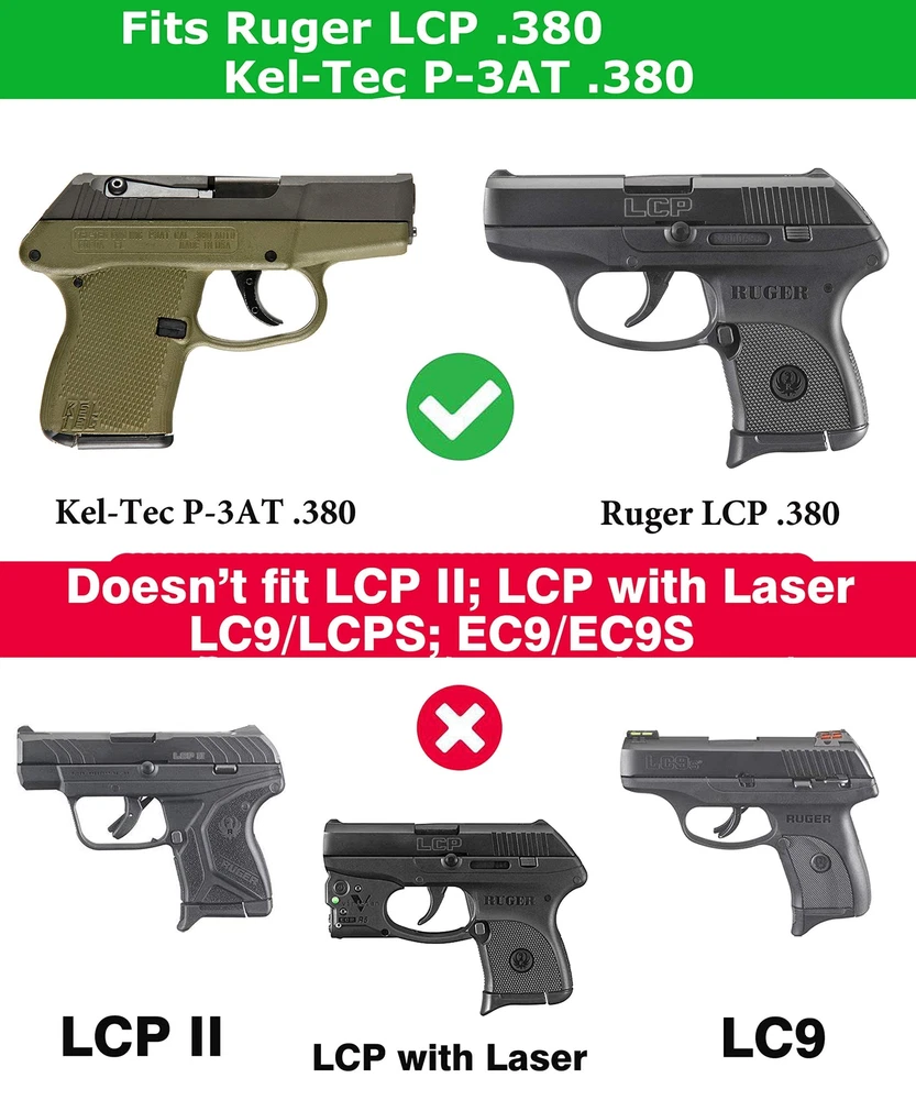 Fit Gun Models: This OWB paddle holster fits Ruger LCP(Not for LCP II or LCP Max), Kel-Tec P3AT 380 Sub-Compact - Right Handed(Note: Doesn't fit Ruger LCP II .380, Ruger LCP II .22, Ruger LCP Max .380, Ruger LC9 or guns with laser) Quick-release Button: This open belt carry holster allows you to place your index (trigger) finger in the perfect position that enables a smooth, quick draw from this 360 degree adjustable holster. AUTO-Locking: This Ruger LCP holster has an integrated auto-locking mechanism that will automatically lock and hold your firearm safely when you put it back in the gun holster. Adjustable Carrying Angle: This gun holster is 360 degrees adjustable with the Allen Key (included). Simply rotating the paddle to get your desired carry angle. And with the paddle, it allows you to attach on and remove this gun holster from your pants or belt in width up to 2". Durability: Our holster for Ruger LCP are made of lightweight polymer material that is resistant to impact, heat and scratch. It's designed for tactical training, hunting, military, the range, law enforcement agencies, personal defense, daily carry and open carry of any kind.