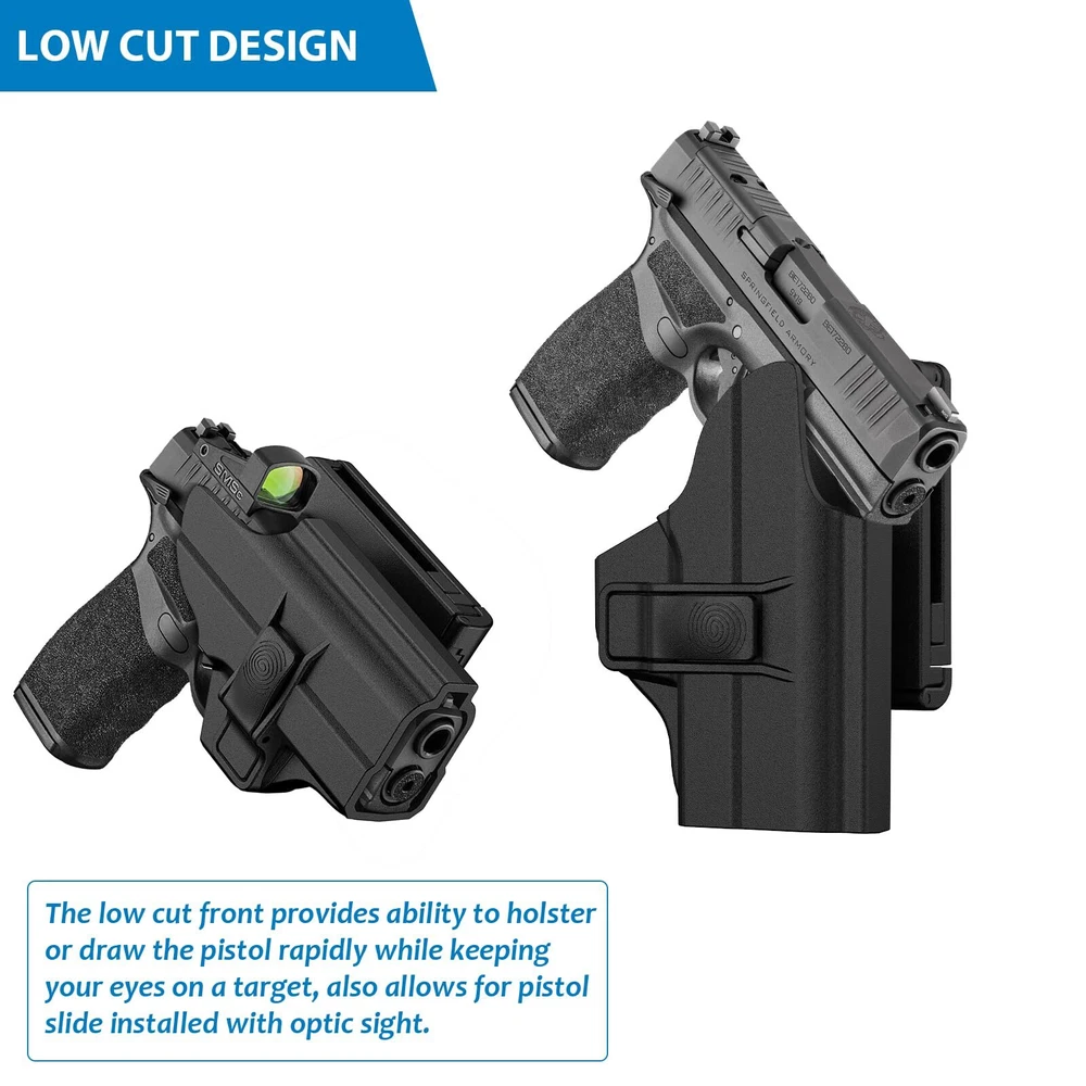 【HOLSTER FIT GUIDE】This springfield hellcat holster fit for Springfield Armory Hellcat 3'' Micro-Compact 9mm . 9mm springfield hellcat holster with Optic,hellcat OSP/RDP holster,Notice: This tactical holster can't fit with Springfield Hellcat modified with laser or sight. (Not fit hellcat ) 【LEVEL Ⅱ RETENTION】This hellcat micro holster right hand,Auto locking system achieves an audible click when you holster the , which can secure your inside this OWB holster to ensure ultimate safety. It is designed to be quickly drawn and re-holstered for easier access by pressing release button with your forefinger whenever needed. 【60° ADJUSTABLE OPEN-TYPE BELT CLIP】Open type belt clip allows step open step close (without regulating screw), not like other ordinary belt loop holster on the Market. This belt holster can slid over the belt, they retain their position and stay firm. Simple set cant from 0-60 degrees to fit a comfortable position with Allen key, you won’t have to worry about the firearm digging into your leg the way belt loop holsters can. duty belt width up to 2 inch. 【MILITARY-MATERIAL & EXCELLENT DESIGN】This polymer holster is made of high standard polymer that is waterproof and durable, almost no maintenance required, adapt to every bad environments. The Excellent design of this belt holsterworks as the backing of the holster, which keeps the firearm away from the hip and ensures a firm grip and the drawing movement is quick and hurdle-free. 【APPLY FOR EVERY PLACES】 It is widely used by duty holsters, uniformed law enforcement and peace officers, personnel, military personnel, private persons and shooting sports holsters all over the world. If you are looking for a holster, this is good choice for you.
