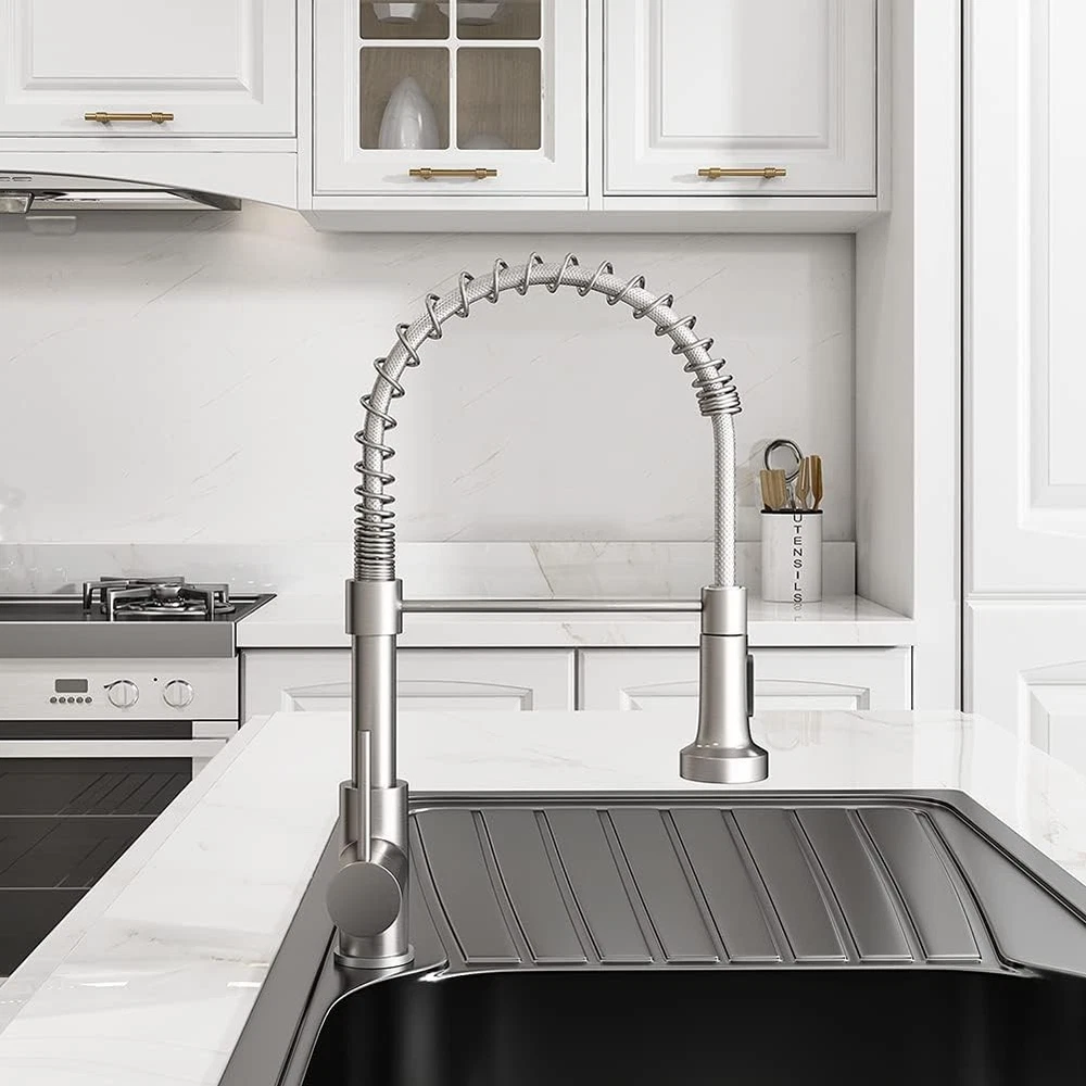 OWOFAN Kitchen Faucet with Pull Down Sprayer 1 Standard, 1 Brushed Nickel Product Details Brand: OWOFAN Recommended Uses For Product: Kitchen Mounting Type: Deck Mount Finish Type: Brushed Material: Stainless Steel Color: 1 Brushed Nickel Number of Handles: 1 Included Components: Mounting accessories include Hole Count: 1 Special Feature: Easy to Install Handle Type: Lever Style: Pull Out Faucet Installation Type: Surface-Mounted Maximum Flow Rate: 1.8 Gallons Per Minute Number of Pieces: 1 Handle Material: Metal Spout Height: 3.9 Inches Spout Reach: 9.2 Inches Handle Location: Left / Right / Center Spout Design: High Arc Hose Length: 27.5 Inches Is Electric: No Manufacturer: OWOFAN Product Dimensions: 3"D x 9"W x 18.5"H Part Number: 9009SN-A Item Weight: 3.12 pounds Item model number: 9009SN-A Is Discontinued By Manufacturer: No Size: 1 Standard Finish: Brushed Pattern: 360° Swivel Spring Spout Shape: Curved Gooseneck Item Package Quantity: 1 Flush Type: Dual Stream/Spray Special Features: Easy to Install Usage: Commercial Batteries Included?: No Batteries Required?: No Brand: OWOFAN Recommended Uses For Product: Kitchen Mounting Type: Deck Mount Finish Type: Brushed Material: Stainless Steel Color: 1 Brushed Nickel Number of Handles: 1 Included Components: Mounting accessories include Hole Count: 1 Special Feature: Easy to Install A PERFECT HEIGHT - Your brushed nickel kitchen faucet features an industrial kitchen faucet open spout, 18.5” height fits under most cabinets. 10 inches deck plate included, one hole kitchen faucet or 3 hole kitchen faucet available. SPECIFICATIONS - Spout reach 9", spout height 5", overall height 18.5". Maximum Deck Thickness: 2.5", Pre-drilled hole size requirement: 1.38"--1.5". Pull out the hose 17.7" easily reach any position of the sink. DUAL MODE SETTING - Your kitchen faucets with pull down sprayer provides soft aerated stream and splash-free powerful spray due to its hard rubber sprayer holes. 360 degree kitchen sink faucets sprayer, the switch can be placed in every position as you like. HEALTHY QUALITY - The SUS304 stainless steel kitchen faucet, has no worry of LEAD. Brushed nickel kitchen sink faucet made up of food-grade PEX inner hoses, enjoy your healthy utility sink faucet.Ceramic disc valves exceed industry longevity standards, ensuring durable performance for life. High performance aerator. SPACE SAVING BAR SINK FAUCET - Kitchen sink faucet brushed nickel with pretty design cross bar, offer you more kitchen room for cloth or other little kitchen things. It’s more than a faucet for kitchen sink.