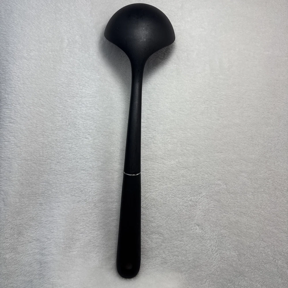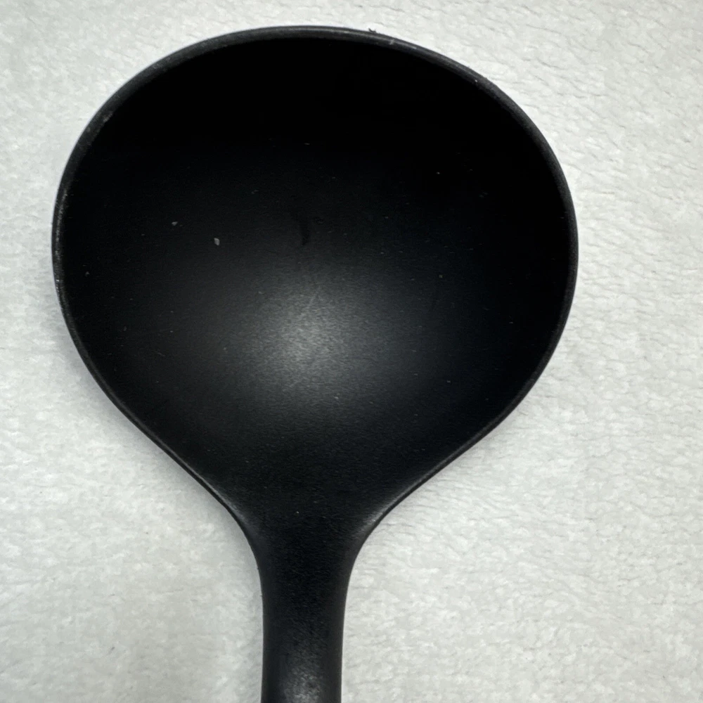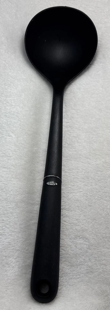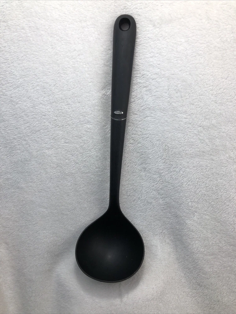 This OXO Good Grips soup ladle is the perfect addition to your kitchen. With a durable black nylon handle and a solid pattern, this ladle is perfect for serving soups and stews. The soft and comfortable grip ensures that you can hold the ladle securely and pour your liquid without any spills. The ladle is dishwasher safe, making it easy to clean and maintain. It is manufactured in China with high-quality plastic material and features a nylon handle. The set includes one soup ladle with no custom bundle. Get this OXO soup ladle today and enjoy cooking your favorite soups and stews with ease.