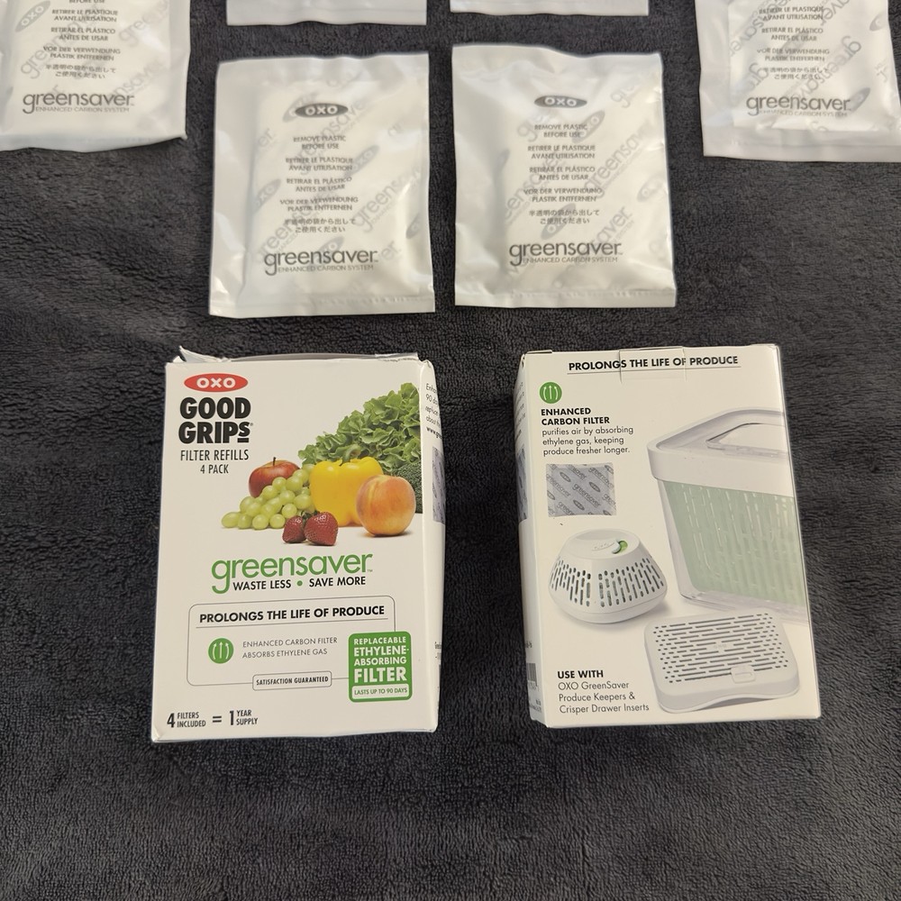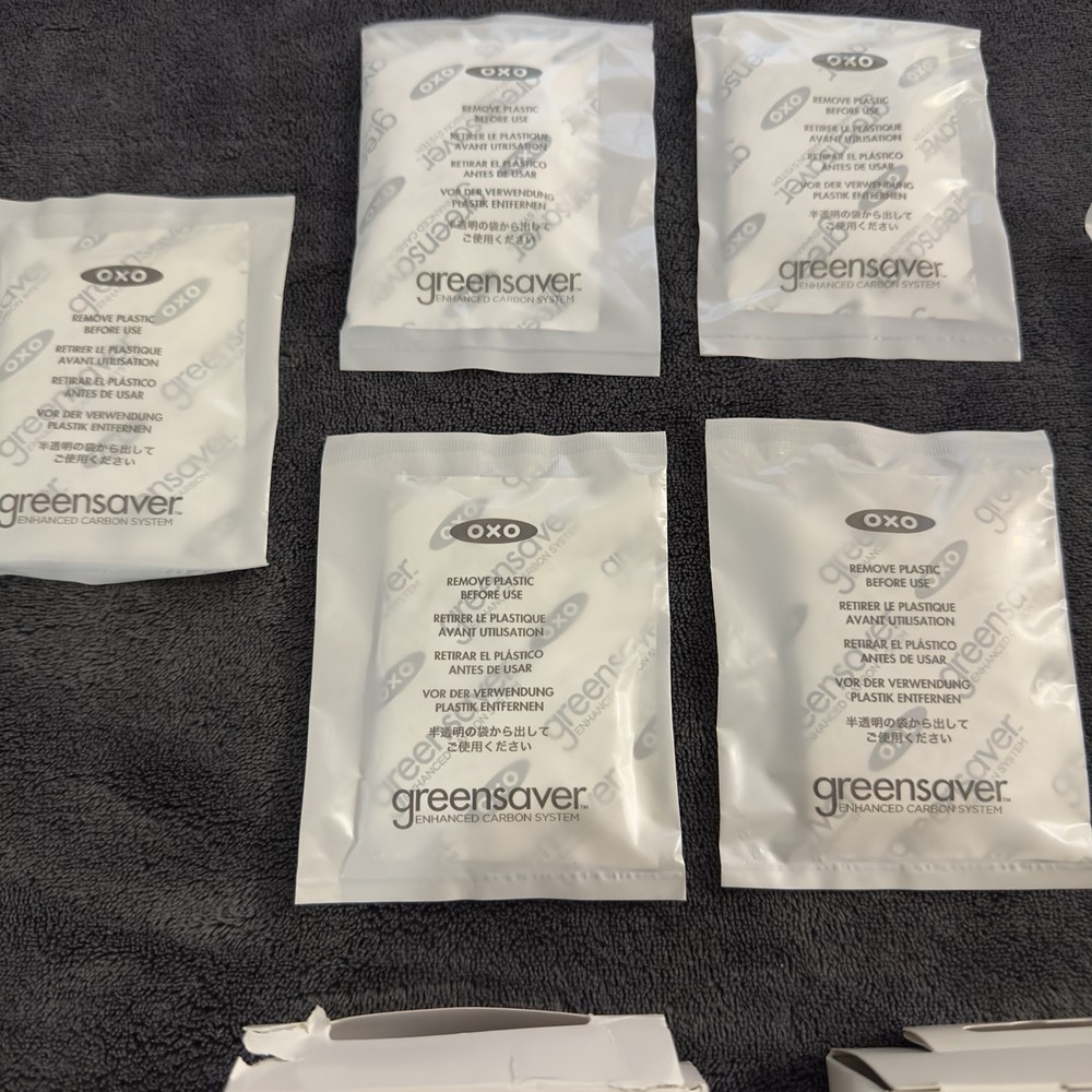 *2 open boxes included. **10 filters in total for this sale. All are in perfect condition. Never used and no tears or flaws. Keep your food fresh for longer with these OXO Good Grips GreenSaver Carbon Filter Refills. This set includes 10 filters that fit most OXO GreenSaver containers, and are designed to keep your food and kitchen smelling great. Each filter is 4.5 inches tall, 4 inches long, and 1 inch wide, and made from high-quality carbon that is designed to last for up to 2.5 years. These filters are perfect for anyone who wants to keep their food fresh and their kitchen smelling great. Whether you're storing leftovers, or simply want to keep your food from going bad too quickly, these filters are an excellent choice. So why wait? Order your OXO Good Grips GreenSaver Carbon Filter Refills today!