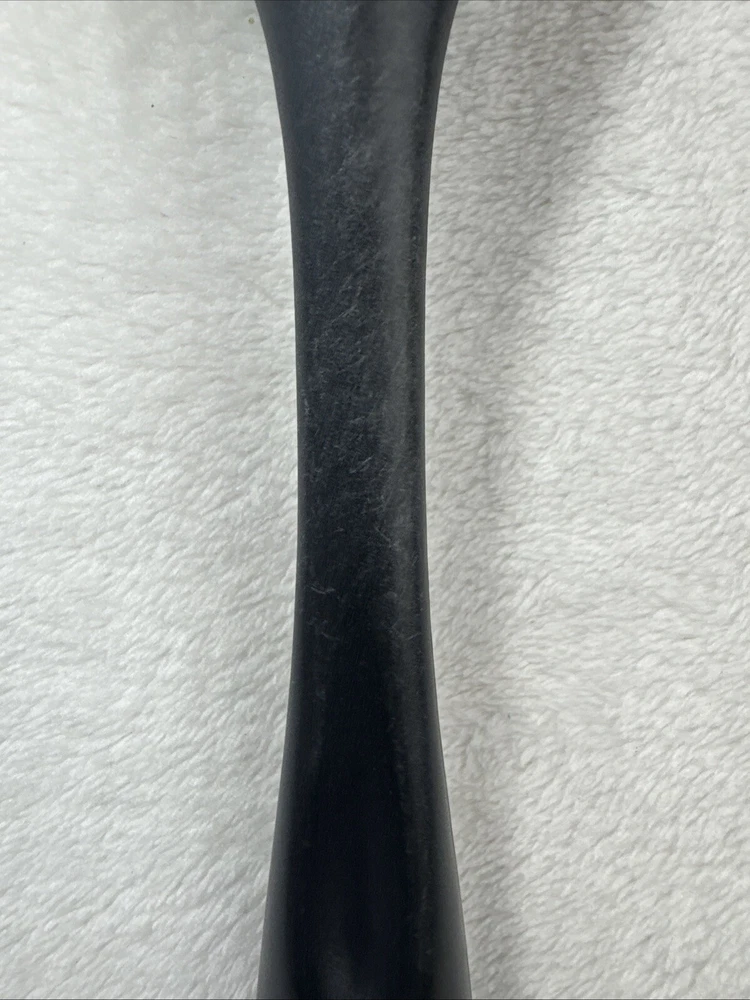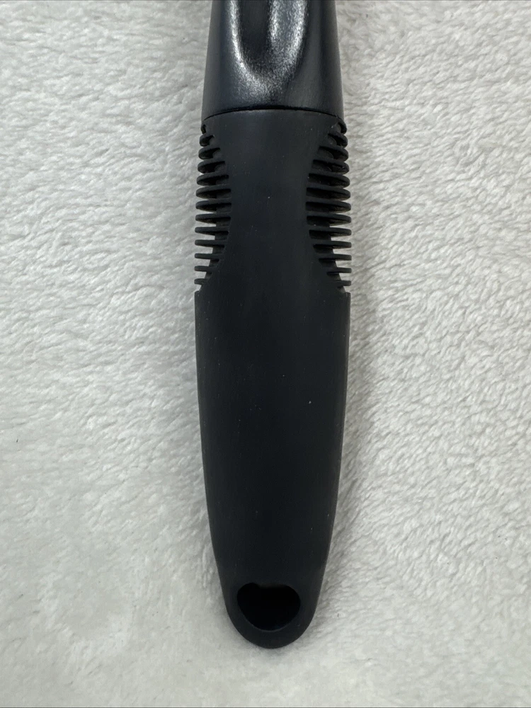 The OXO Good Grips Slotted Spoon is a black kitchen utensil made of silicone and nylon. It has a soft grip handle for easy use, measures 13.5 inches long, and is lightweight for comfortable handling. The slotted design is ideal for draining liquids from foods. Easy to clean and highly functional for cooking tasks.