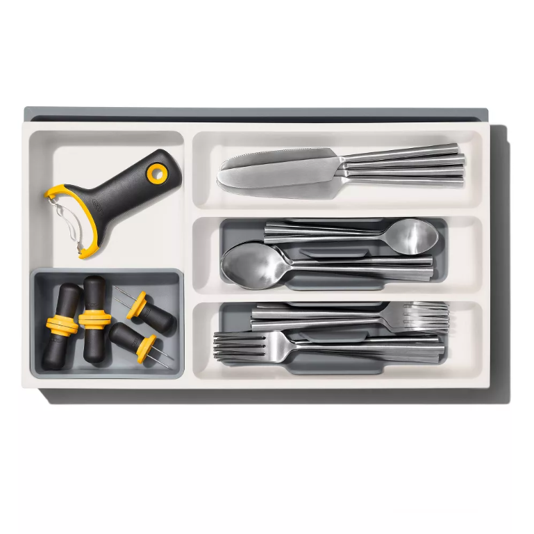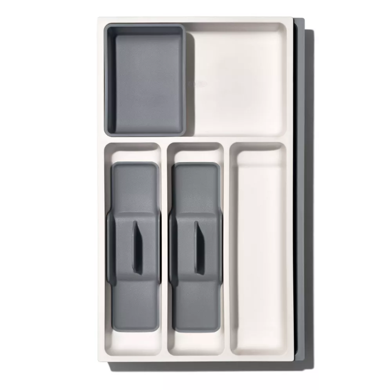 OXO Gray Expandable Utensil Drawer Organizer for Kitchen Storage Hand Wash with TPE
