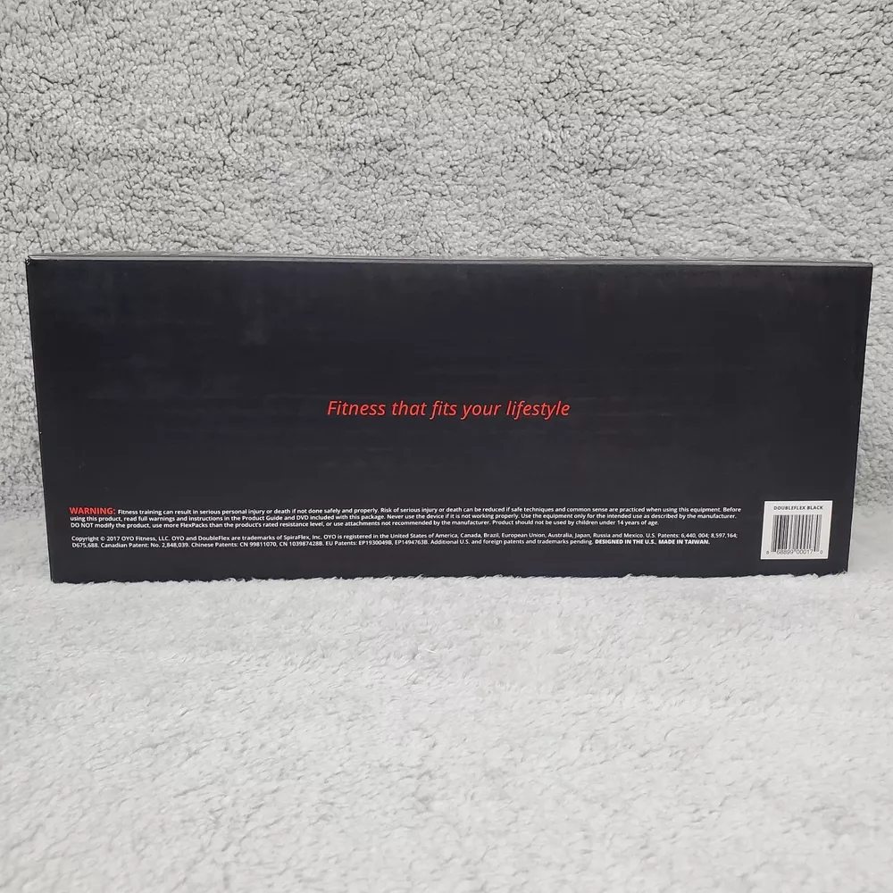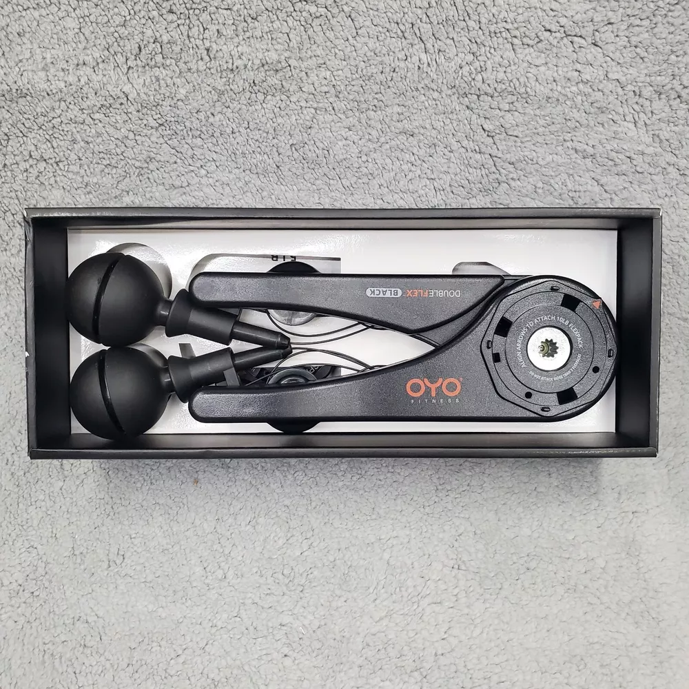 The condition is new in original packaging Includes the following accessories with the Doubleflex: Three flexpacks total for adjustable resistance levels of 10, 15, 20, and 25 pounds. Two leg attachment straps One door attachment strap One workout DVD One OYO storage bag